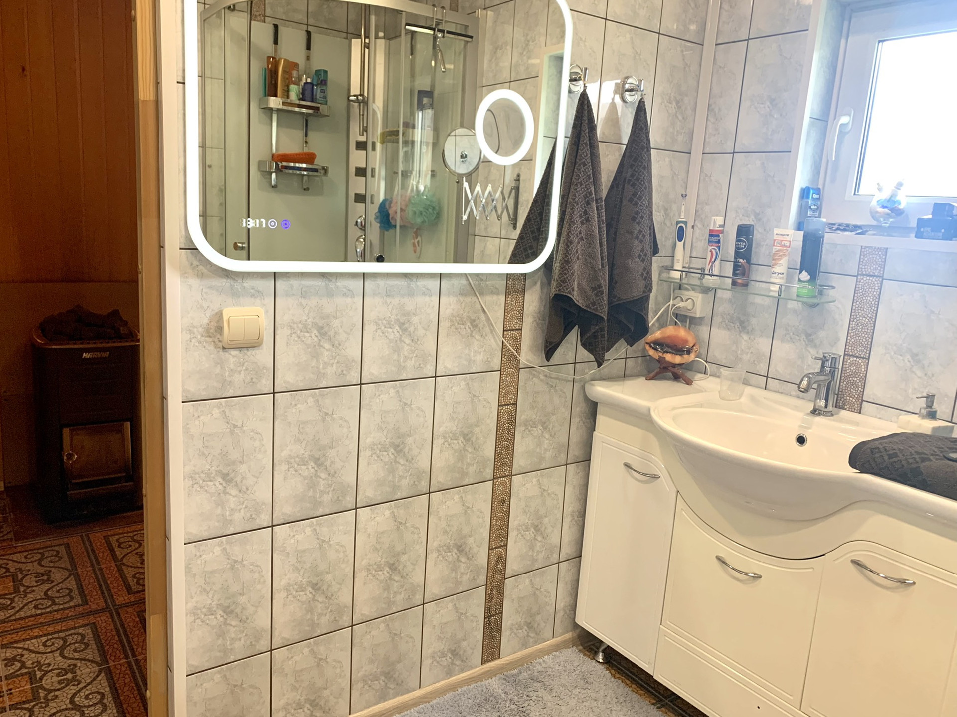 Электроснабжение : 220 вольт, три фазы. Нагрузки в доме распределены группами по фазам. Обогрев : потолочные инфракрасные излучатели с терморегуляторами. Водоснабжение : забивная скважина глубиной 10 метров, автоматическая насосная станция, фильтр предварительной очистки, удаление железа и солей жёсткости системой "Ватер Босс". Горячая вода : бойлер 15 литров в туалете для умывальника ( смеситель с гигиеническим душем), бойлер 80 литров для кухни, душевой кабины и умывальника в душевой комнате. Насосная станция в приямке на веранде.