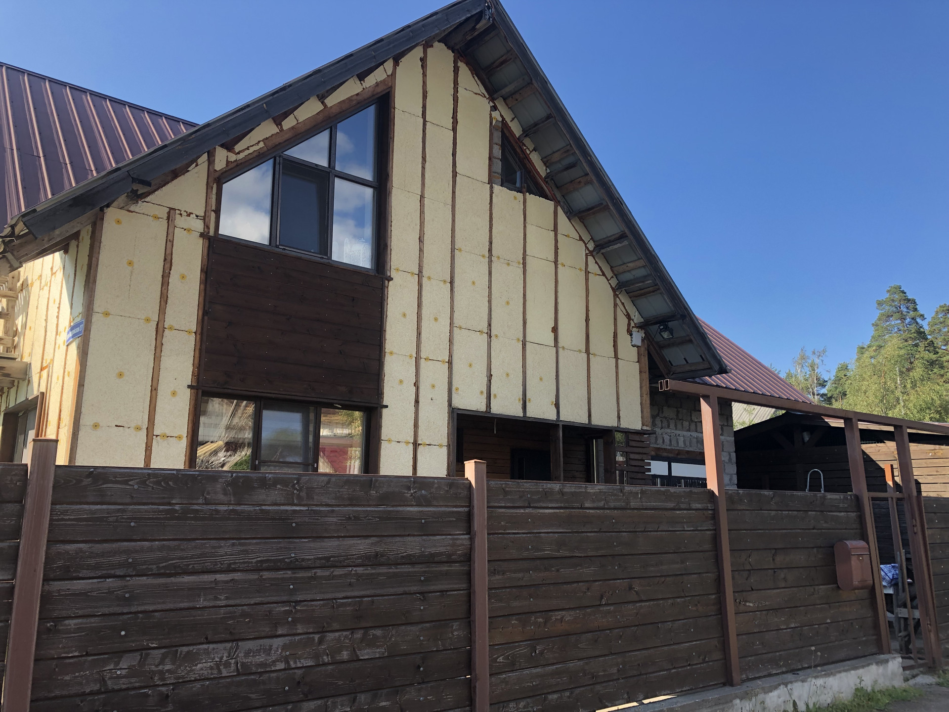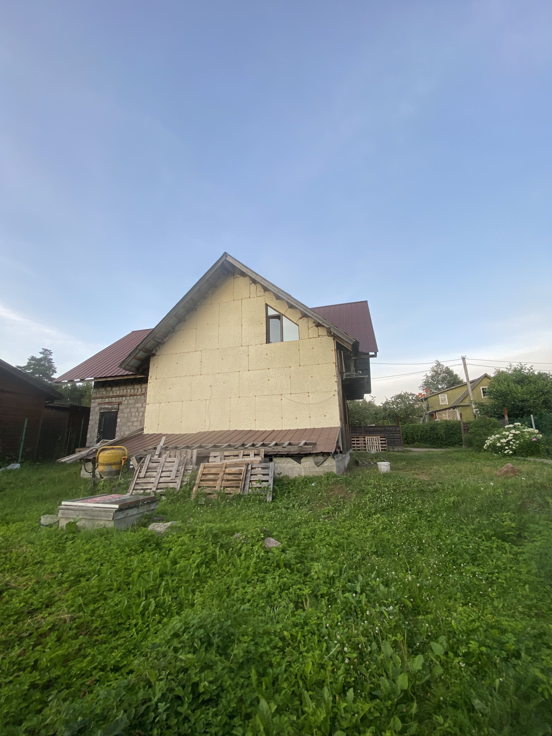 S (дома)=156 кв. м, S (зем. уч.) = 6 соток (аренда 49 лет) в пользовании 9 соток. Фундамент дома ленточно-бетонный, стены дома арболитовые, утеплен, без финишной отделки, крыша профнастил, высота потолков разноуровневая до 4 м.