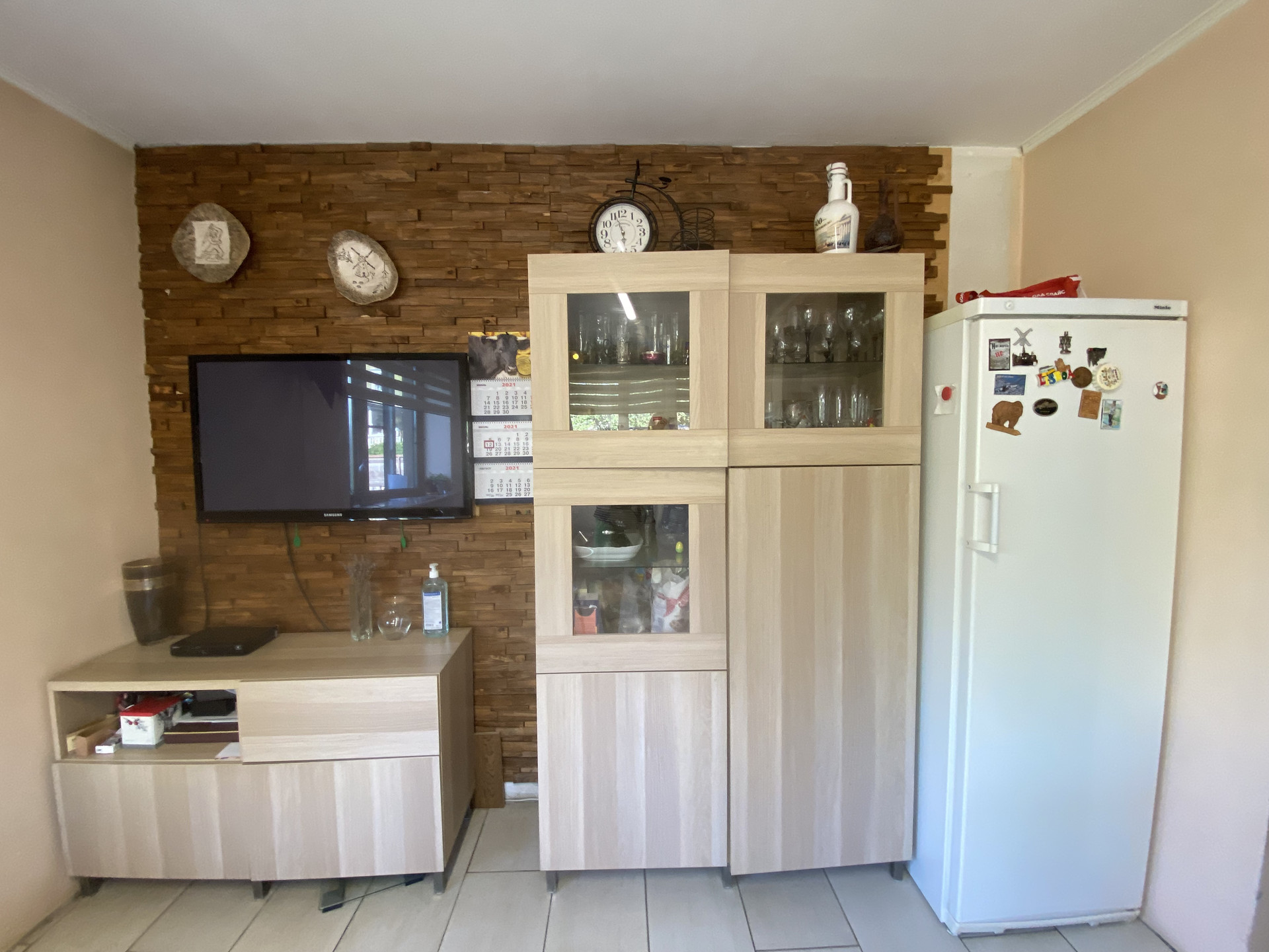 Дом оборудован необходимыми коммуникациями для комфортного проживания: 1-ый этаж - тёплый водяной пол (светлый керамогранит), также есть возможность установить камин. Планировка 1- ого этажа: прихожая, гостиная, кухня правильной формы (8,3 + 31,5 +15,6 кв2), санузел (2,3 кв2), выход в гараж (22,8 кв2) из дома и со стороны садового участка. По проекту есть фундамент под террасу\веранду (около 15 кв2) с выходом из гостиной.