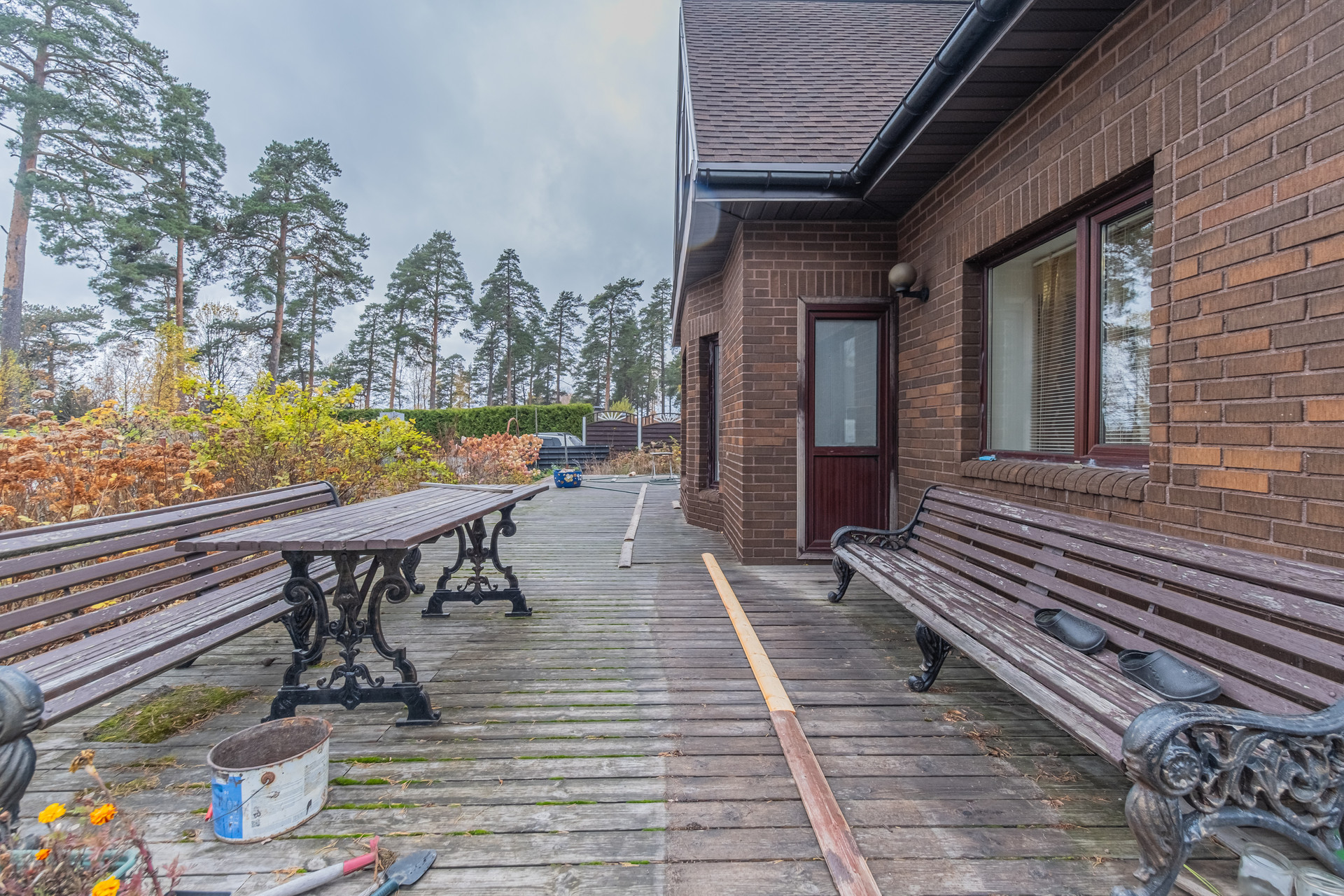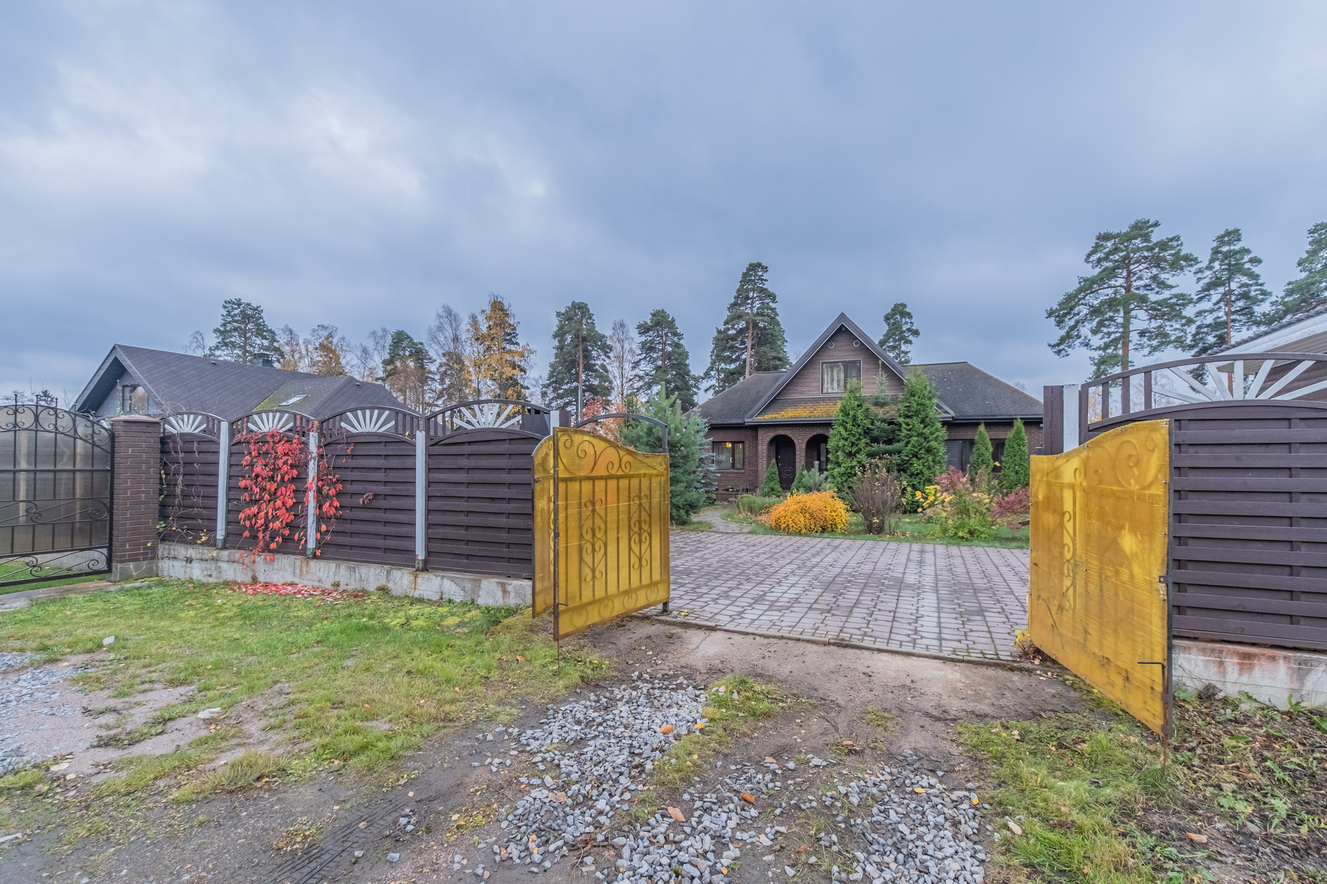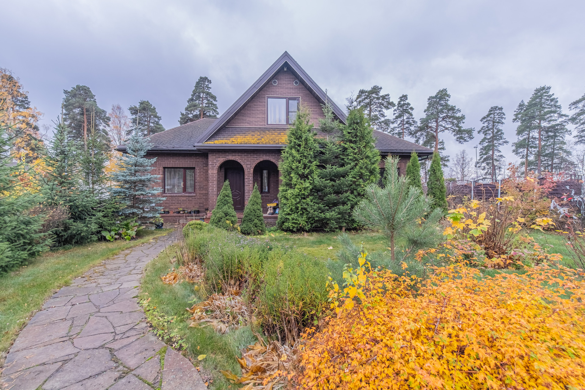 На участке выполнен ланшафтный дизайн с композицией хвойных и лиственных деревьев. Дополнительно есть теплица из поликарбоната и разработанное грядки. Вымощенные парковочные мест. На территории дополнительно имеется сарай для хранения дров и садового инвентаря.