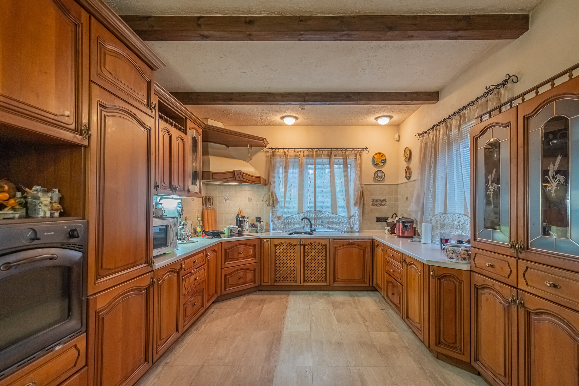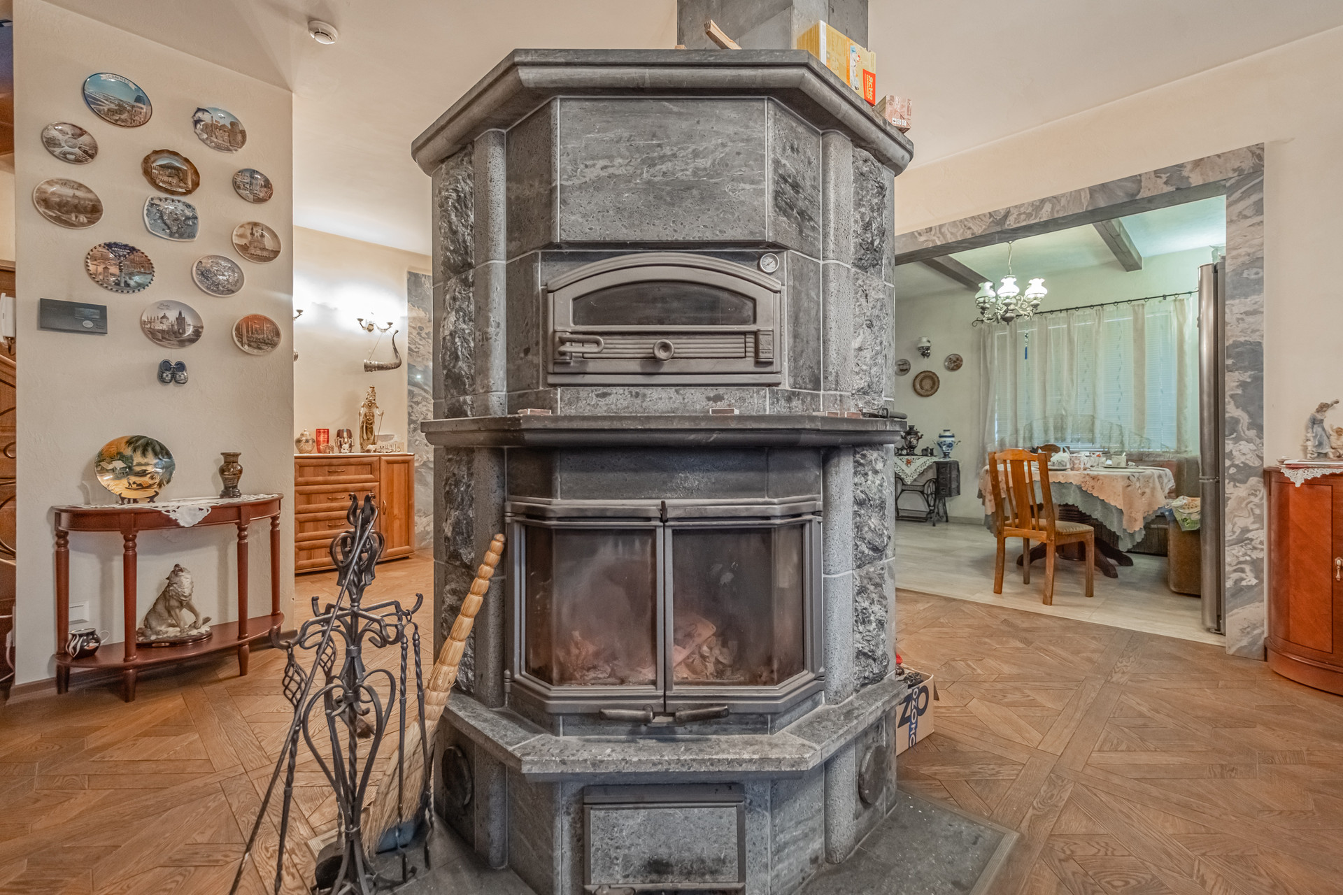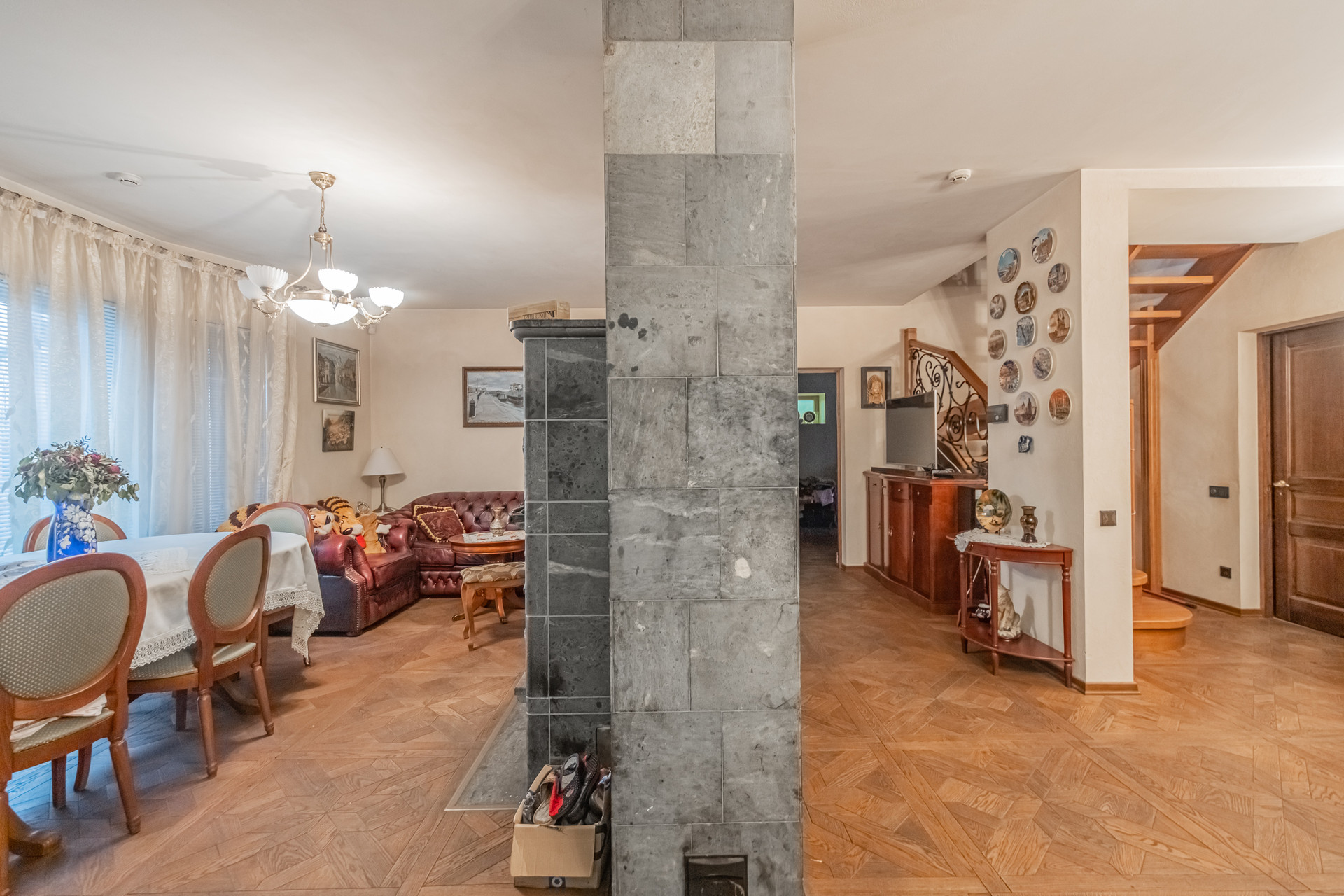 На кухне полы и все подоконные доски выполнены из натурального мрамора, так же как и арочные проемы в столовую и гостиную. Зона гостиной и спален -натуральный паркет.