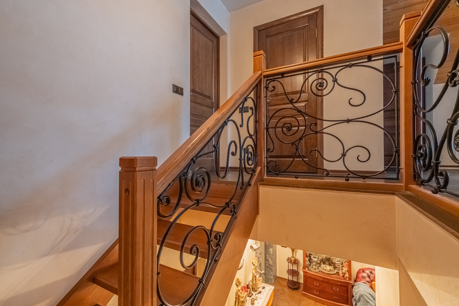 На первом этаже уютно расположились: просторная гостиная с качественным камином из талькохлорида, кухня, выполненная по индивидуальному заказу из массива производства Италия, с ультрасовременной бытовой техникой, санузел, спальня и кладовая.