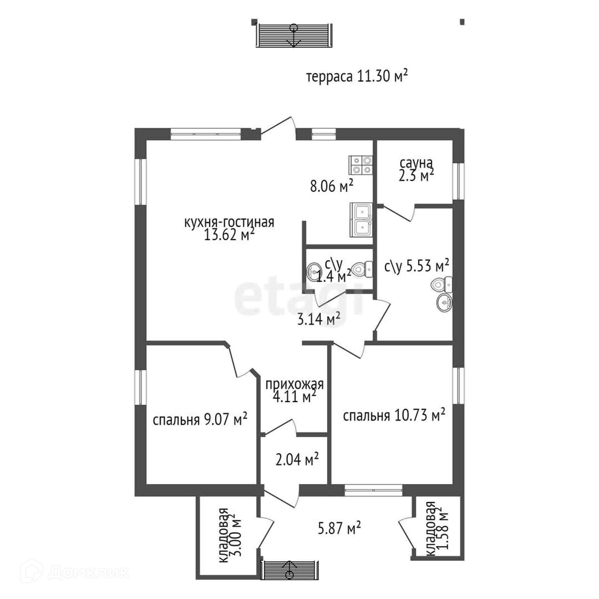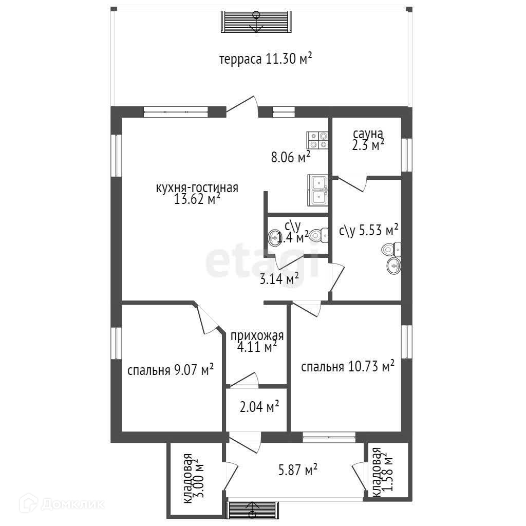 На площади 80 кв.м разместилось все необходимое - кухня-гостиная с панорамными окнами и выходом на веранду, 2 спальни, раздельный санузел и помещение для сауны.