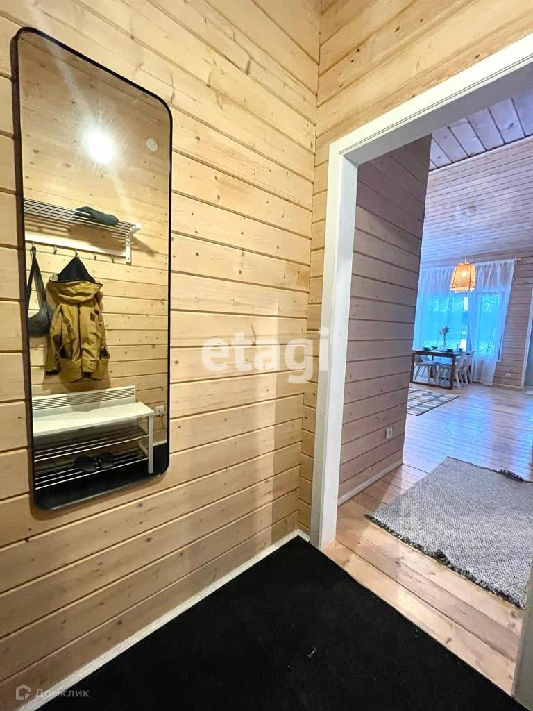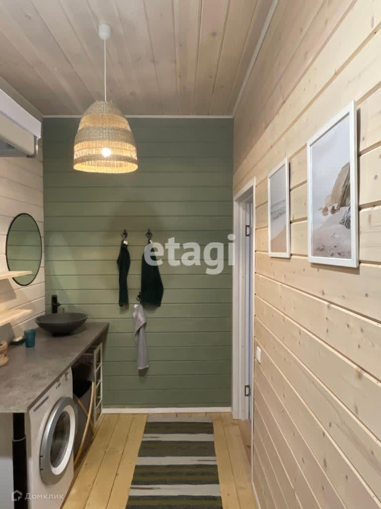 Дом построен по каркасной технологии с использованием сэндвич-панелей, снаружи и изнутри обшит натуральной вагонкой.