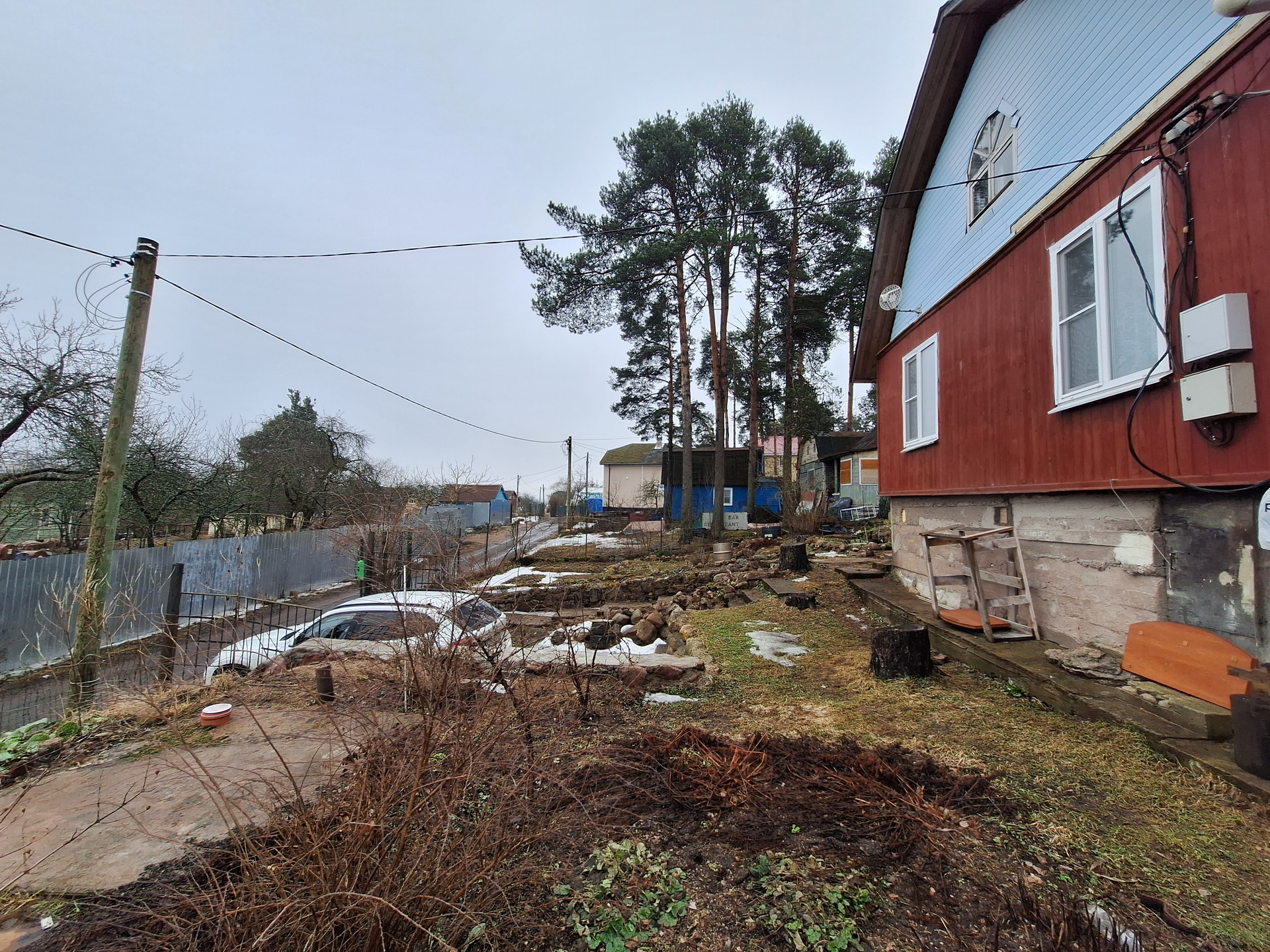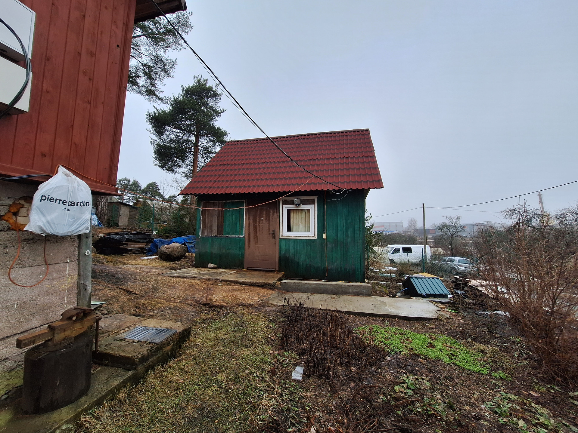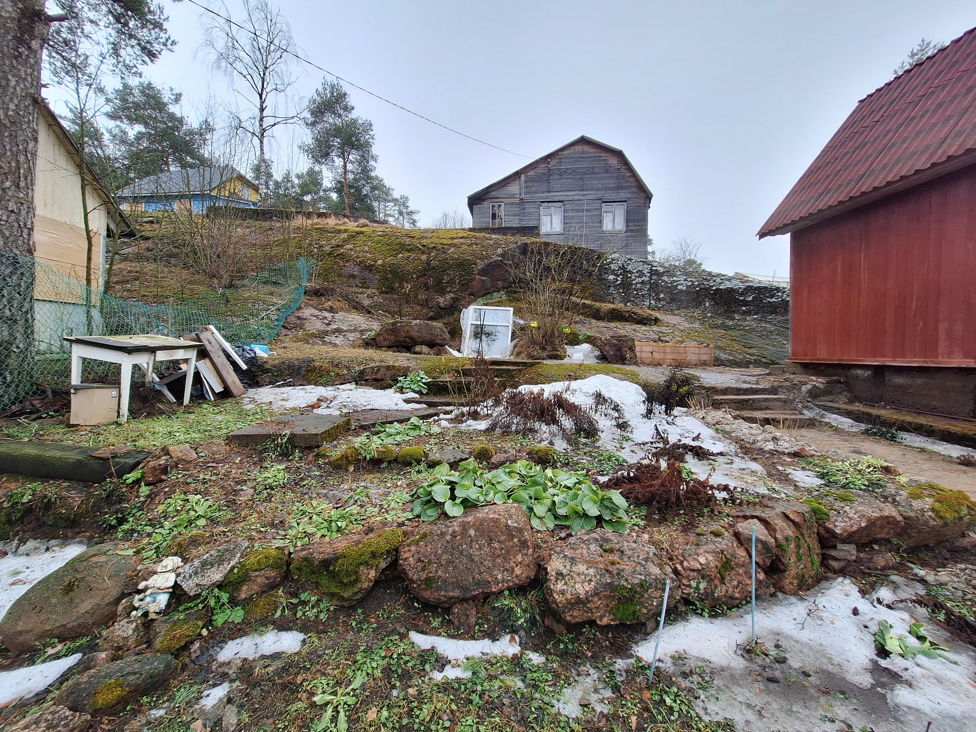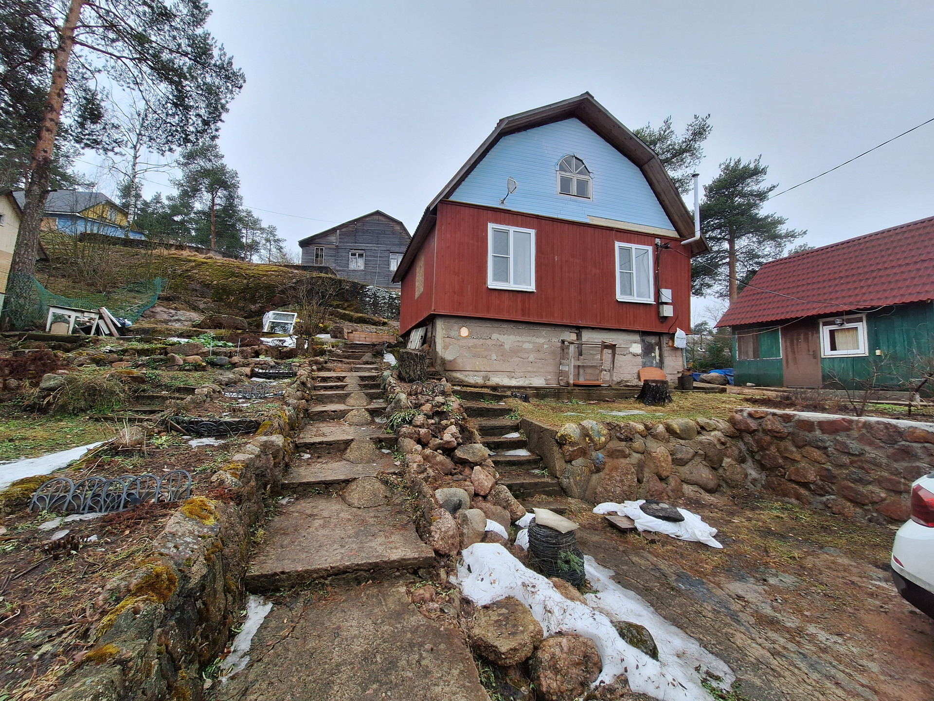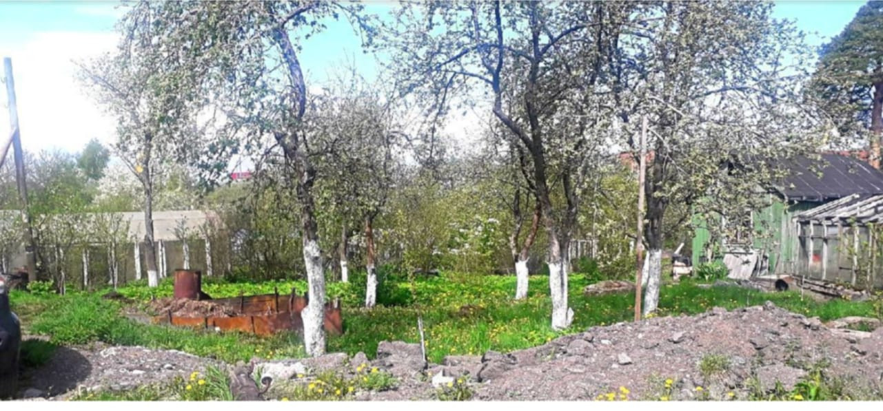 Участок состоит из двух частей: на первой расположены об дома, вторая часть участка через дорогу, ближе к заливу, используется как сад-огород. Участок отмежеван, стоит на кадастровом учете. Общая площадь участка 1035 кв.м.