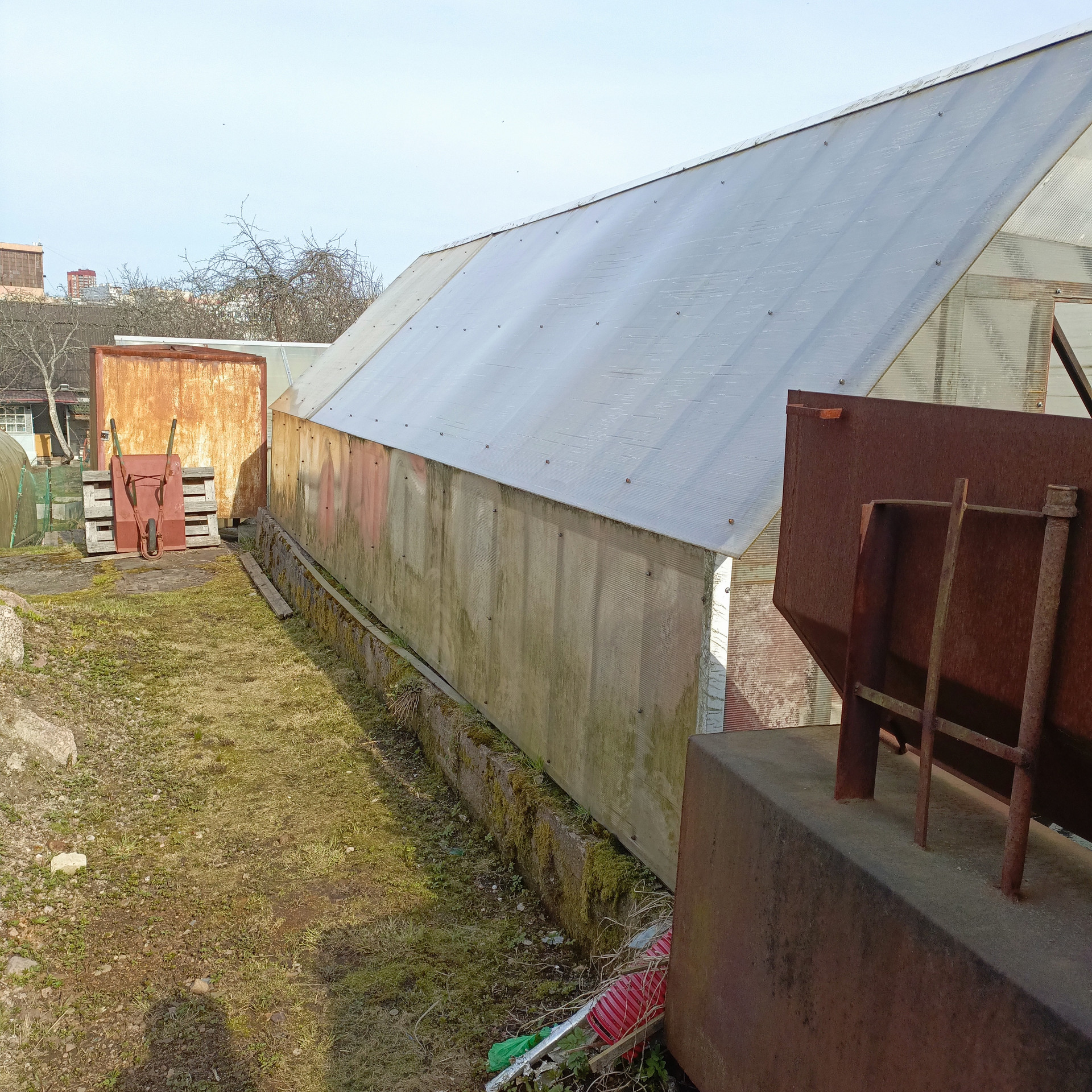 * На территории собственности имеются 3 теплицы и грядки, а также фруктовые деревья(яблоня, слива).