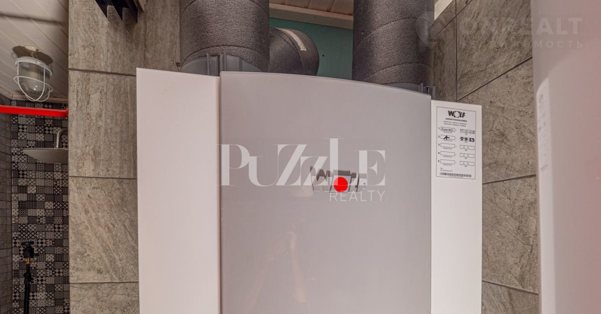 Конструкция дома представляет из себя деревянный каркас, который опирается монолитную ж/б плиту 400 мм. Утепление стен – 250 мм, утепление кровли – 350 мм. Фасад и внутренние стены дома отделаны имитацией бруса. Материал кровли – мягкая черепица. Дом построен по финским стандартам – максимально герметичный и энергоэффективный. Для такого рода домов обязательно наличие принудительной системы вентиляции с рекуперацией. Установленный вентиляционный агрегат WОLF (Германия) прекрасно справляется с поступлением свежего воздуха в каждое помещение. Для удобства проживающих, в каждом помещении установлен датчик управления климатом.