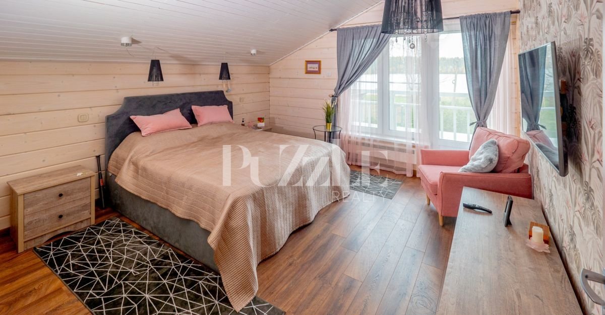 Второй этаж предназначен для отдыха проживающих и здесь все продумано и спланировано: 2 спальные комнаты (12,9 +12,8 м2), отдельная гардеробная (12,8 м2), ванная комната (3,3 м2). Отдельно стоит отметить, что с обеих спален есть выход на крытый балкон, откуда открывается красивый вид на озеро и отвесные скалы.