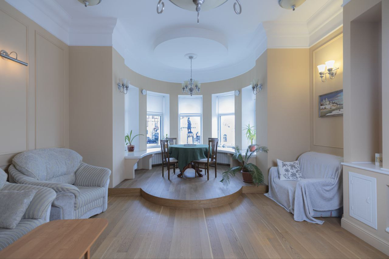 За фасадами, воссозданными опытными мастерами по сохранившимся чертежам и образцам лепнины, располагается просторная эргономичная планировка, отвечающая самым высоким требованиям к комфорту.