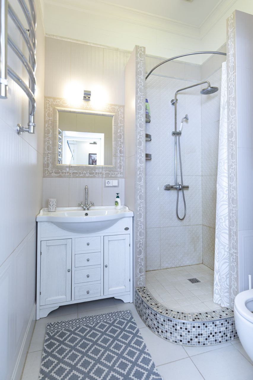 У нас три полноценные спальни, кабинет, большая кухня-гостиная с барной стойкой и     два санузла.
