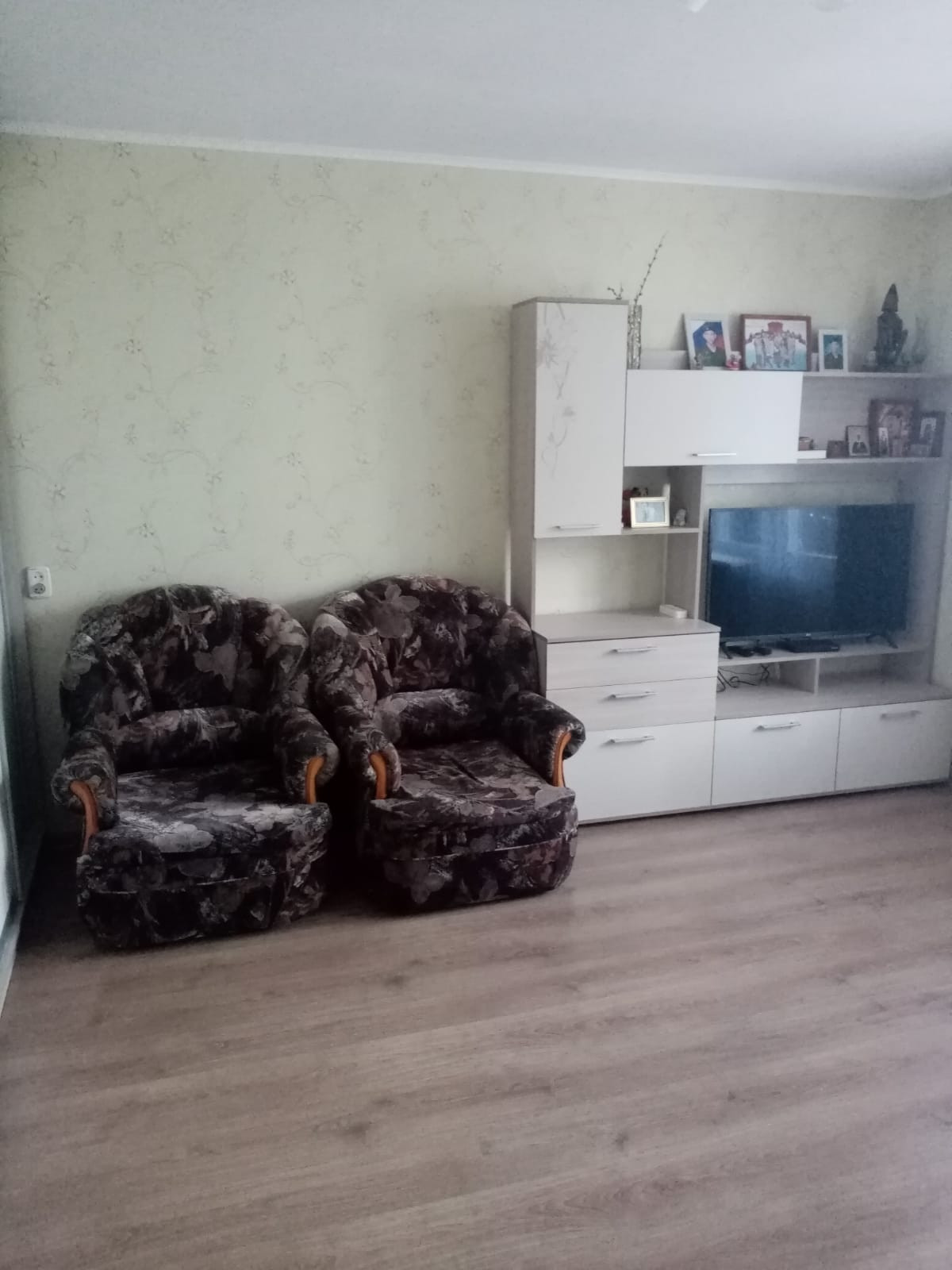 В гостинной : бежевый раскладной диван , большой шкаф-купе, два кресла и стеллаж под телевизор .