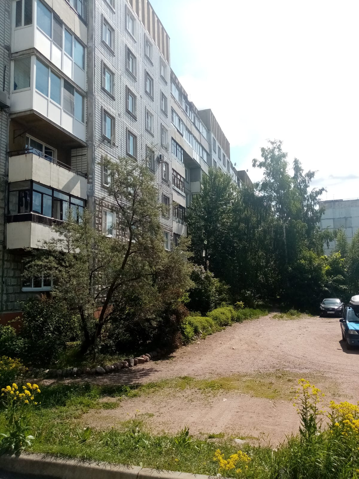 Благоустроенный зелёный двор с местами для парковки.