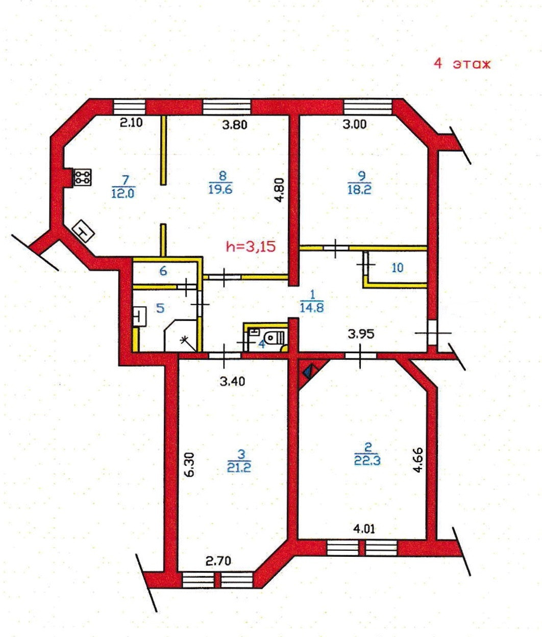 Высокие потолки 3,15 м.
