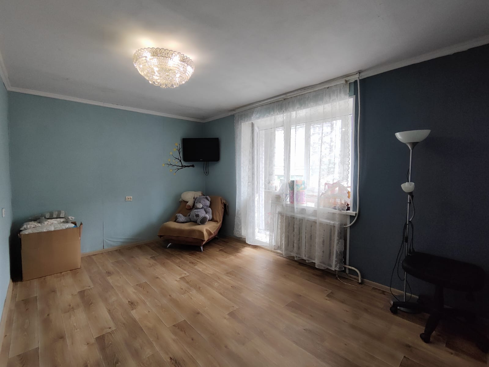 На кухне и ванной комнате напольное покрытие- кафельная плитка, в прихожей – ламинат, в комнатах-линолеум. Установлены стеклопакеты во сей квартире.
