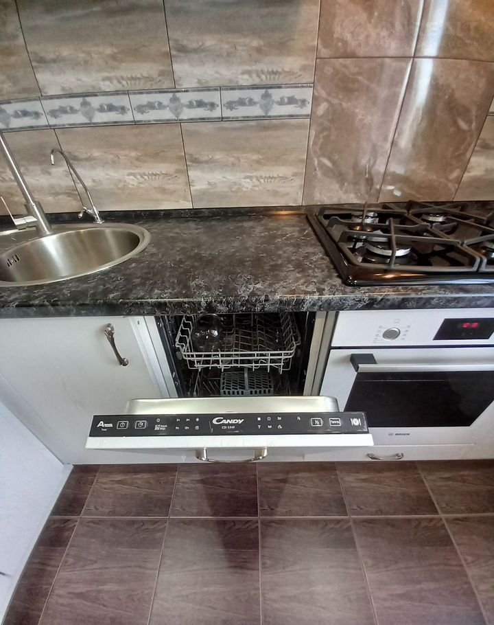 В квартире остаётся встроенная кухня с кухонной техникой (газовая плита с электродуховкой, вытяжка, посудомоечная машина, холодильник, микроволновка, фильтр для питьевой воды).
