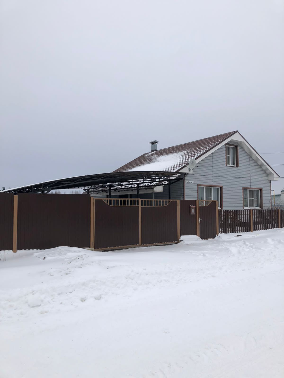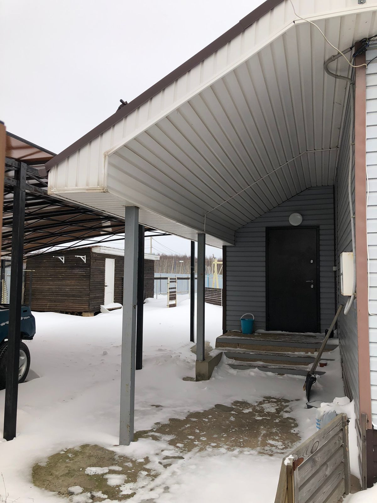 Большой участок 10 соток огорожен забором из профлиста, есть стоянка с навесом под два автомобиля.