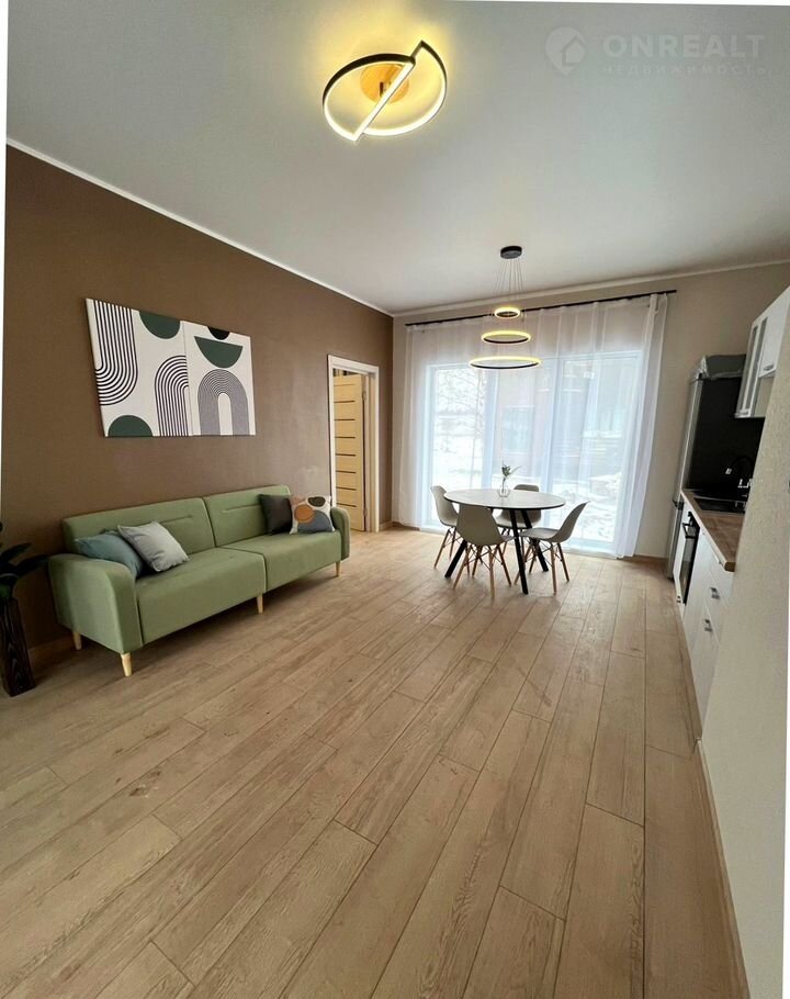 — Просторная кухня-гостиная (21 м²) с техникой и кухонным гарнитуром.