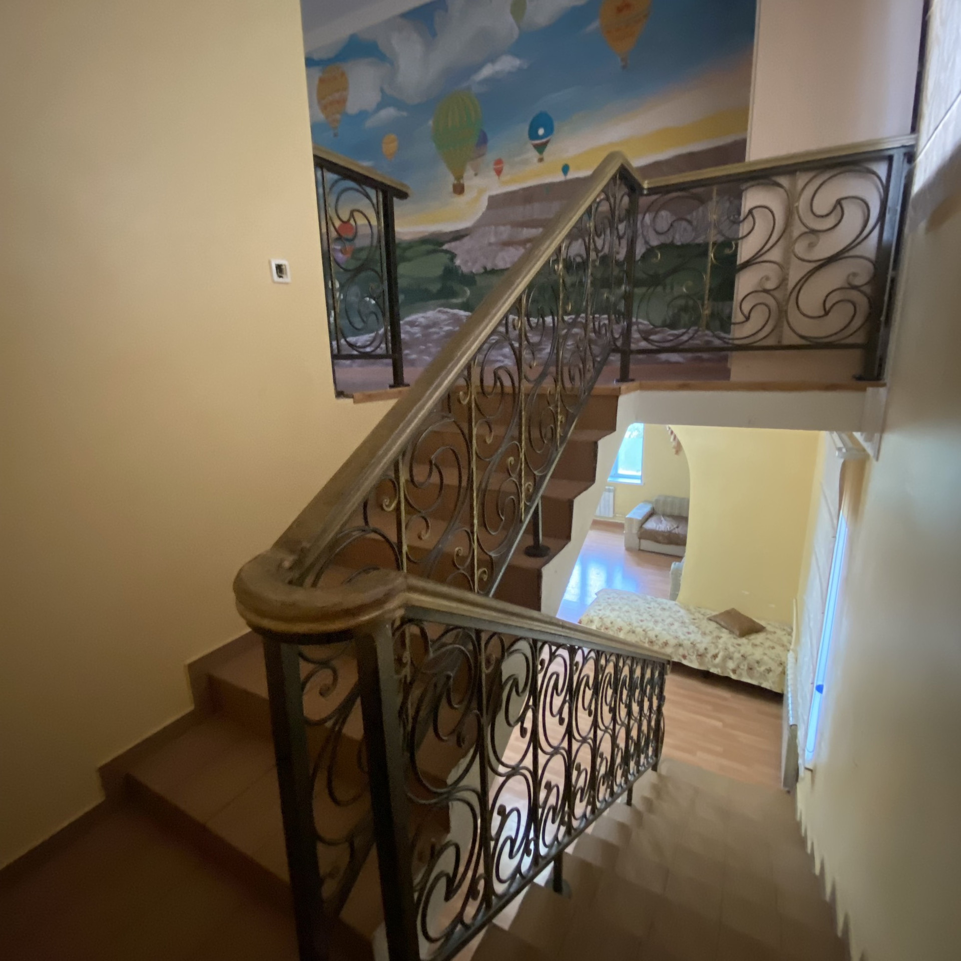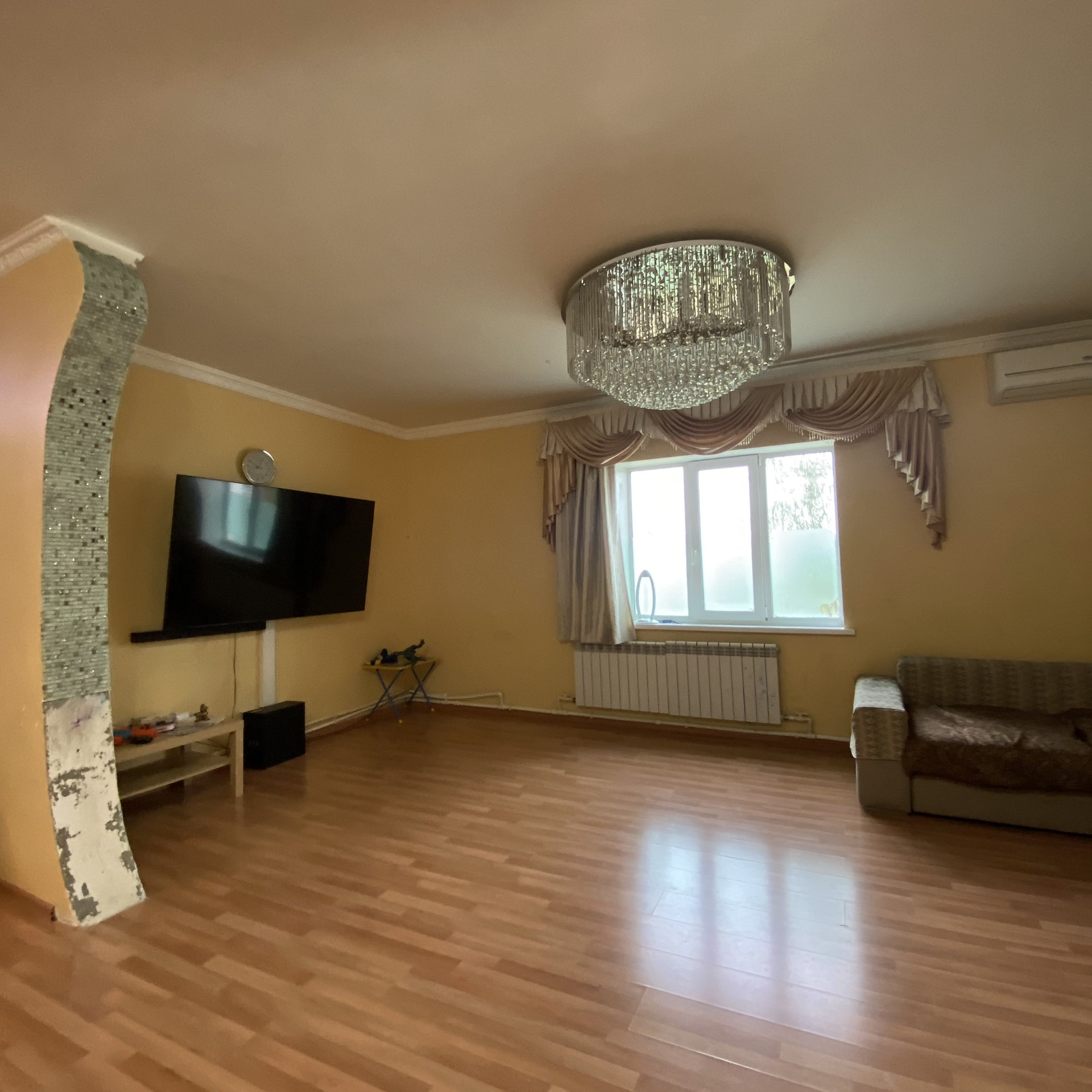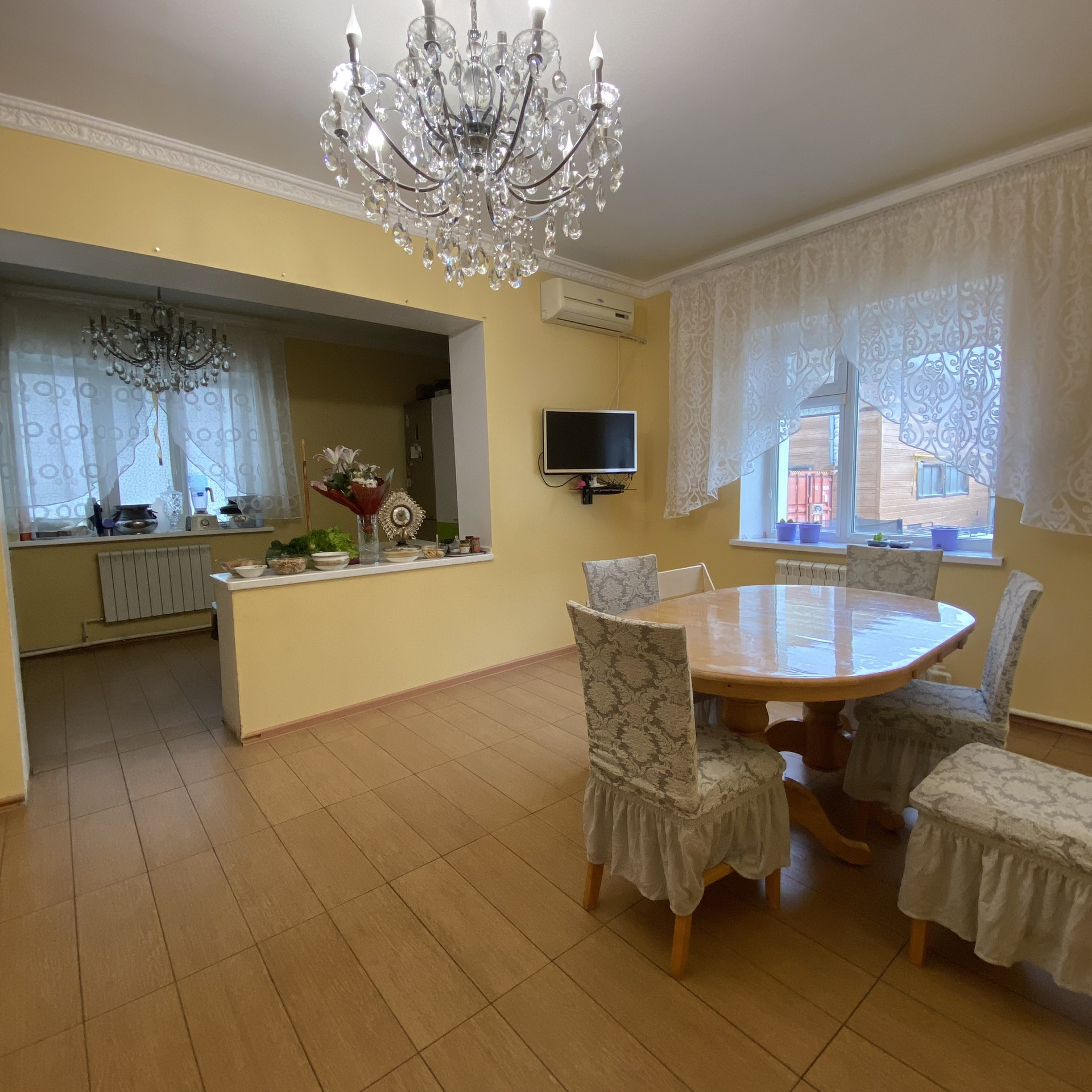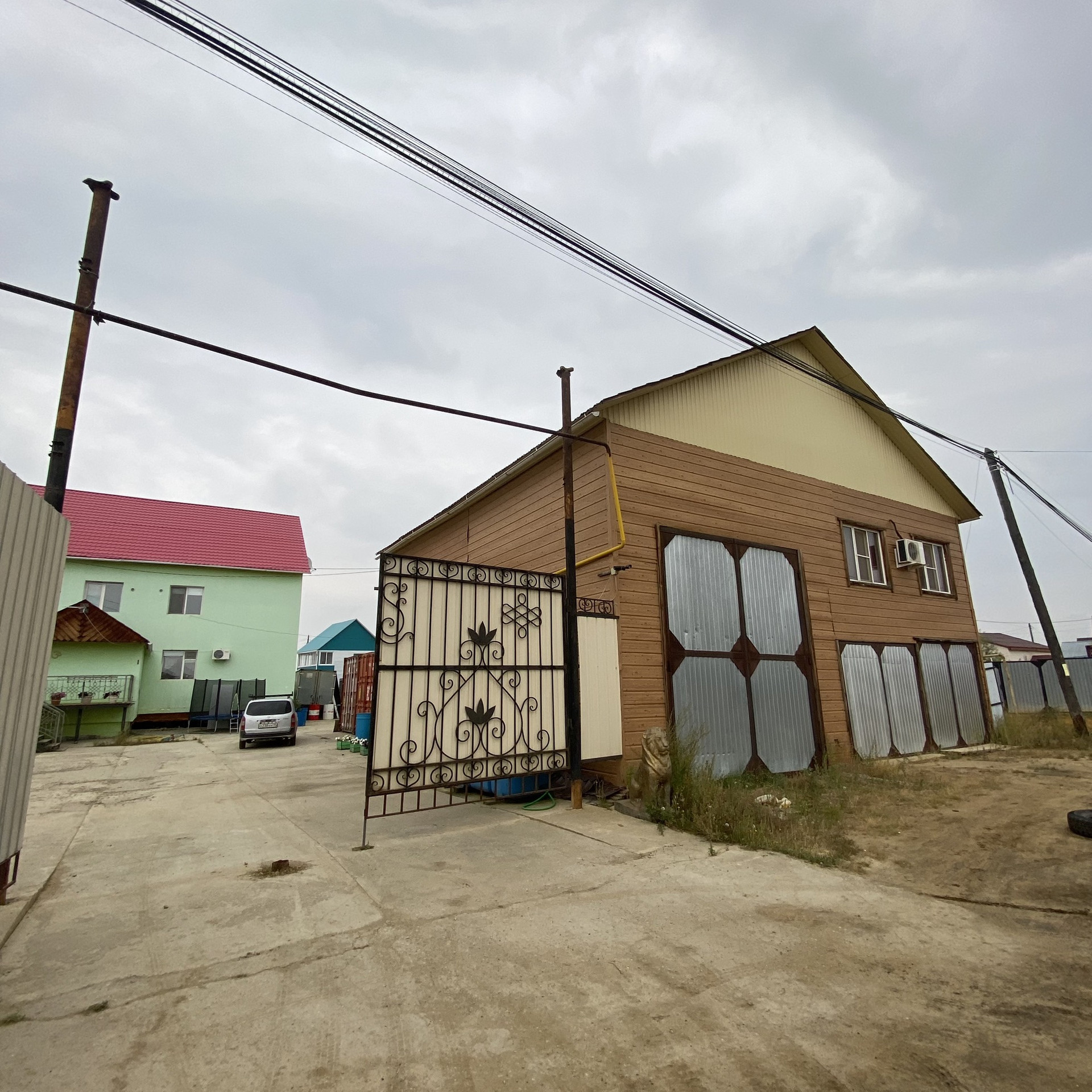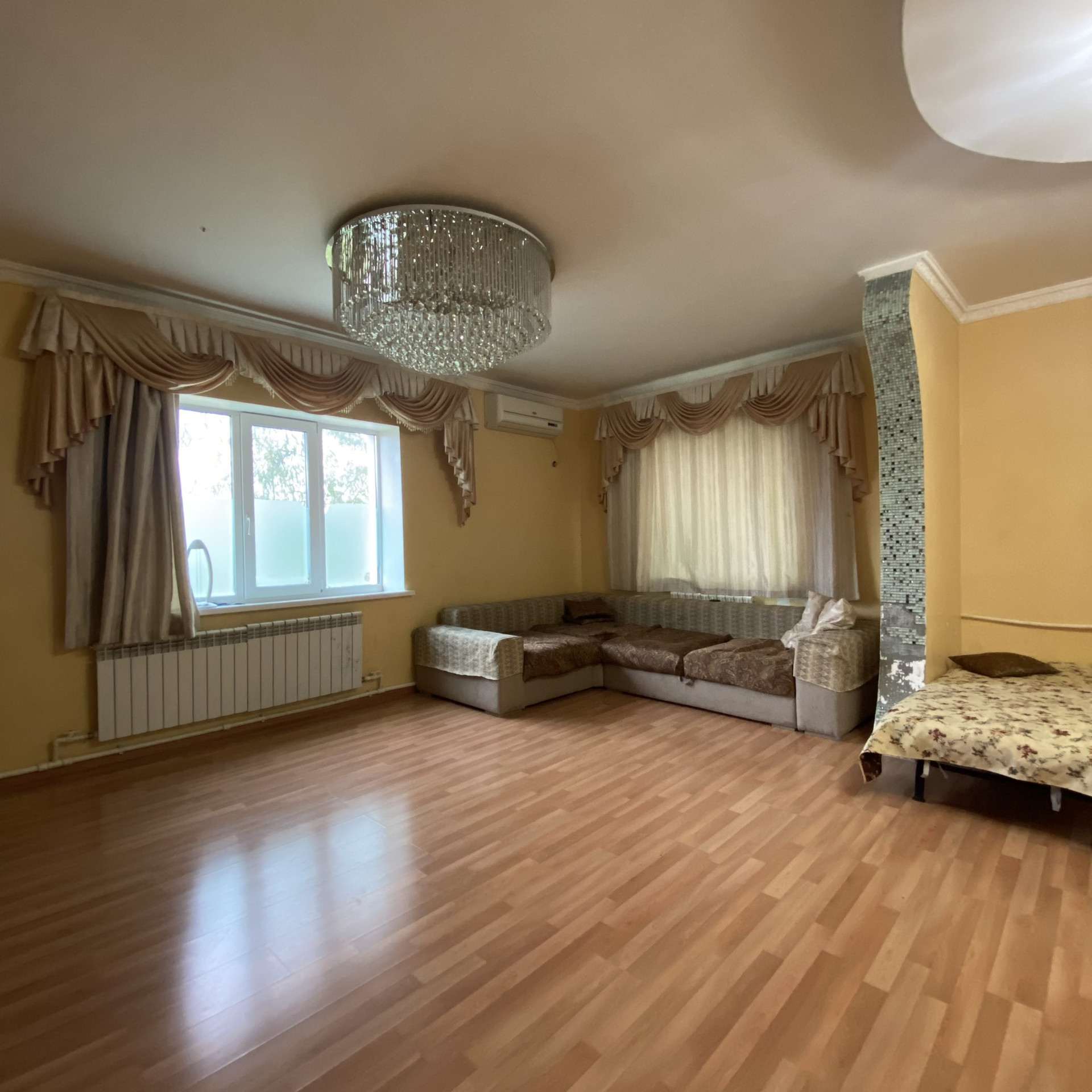 Материал стен шлакоблок, на ж/б сваях, полы бетонированы, потолок наливной. 6 жилых комнат+гостиная+кухня+ столовая+ 2 санузла. Видеонаблюдение по периметру, гараж на 1 груз и 4 л/а. Газ, свет, емкость для воды 4 куба, септик естественный. Вся мебель и техника встроенные, люстры остаются