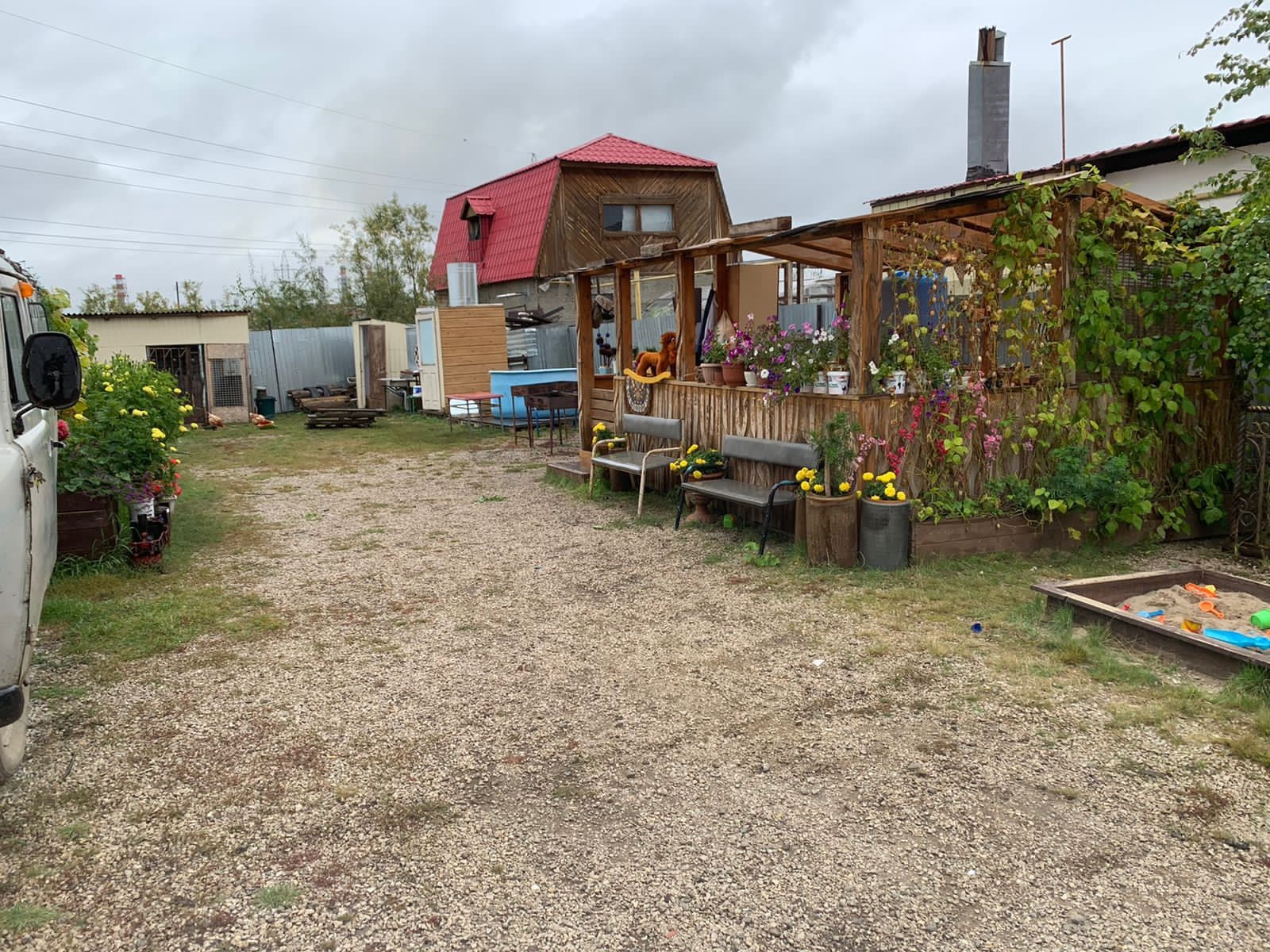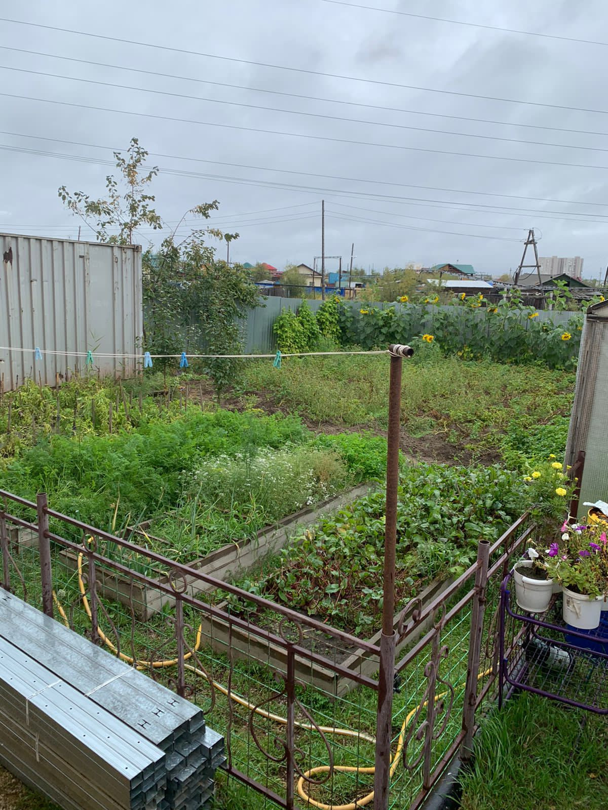 -теплицы, грядки, курятник, поле для картофеля.