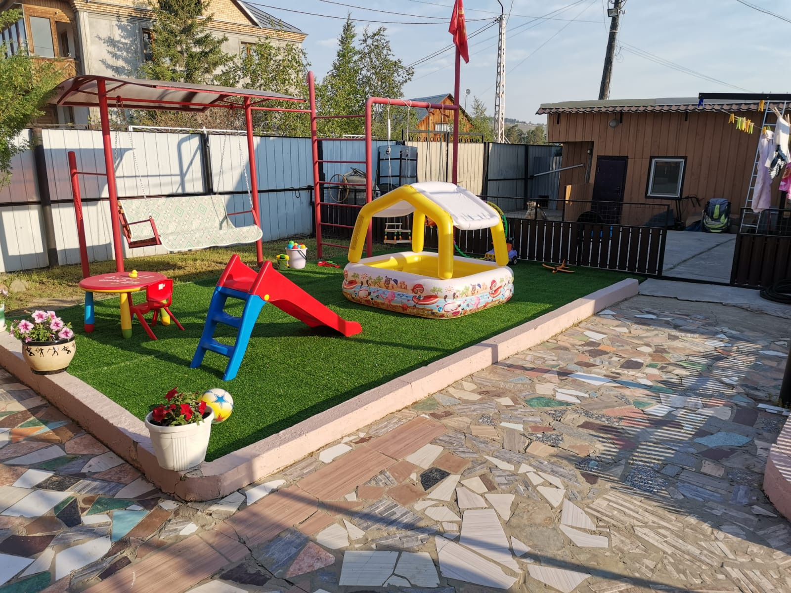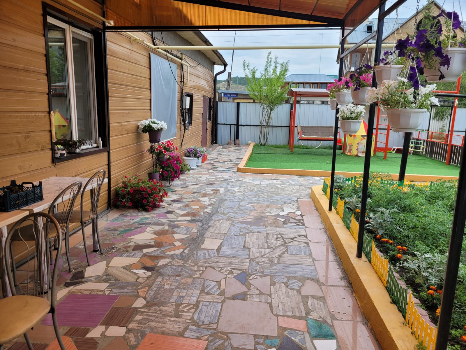 В связи с переездом выставлен на продажу Земельный участок 854 кв.м., ровный и сухой ,по всему периметру ограды выложенная тротуарная плитка. На территории участка построен   красивый одно этажный дом для большой семьи, общей площадью 87,9 кв.м., 2006г. постройки. В доме кухня со столовой, просторная гостиная,  уютная прихожая. Огромные панорамные окна. Дом полностью благоустроен, автономное отопление, водоснабжения привозное. Есть септик;   Гараж на 2 машины, общей площадью 43,2 кв.м., Автоматические ворота .На втором этаже гаража  уютная комната с хорошим ремонтом ,предназначена для проживания. Баня с парилкой и просторной зоной отдыха . Видео наблюдение по всему периметру;  Беседка уютная с зоной отдыха ; Детская площадка; Теплица;   Автоматические ворота. Район  Белого озера. В 3-х минут до остановки .