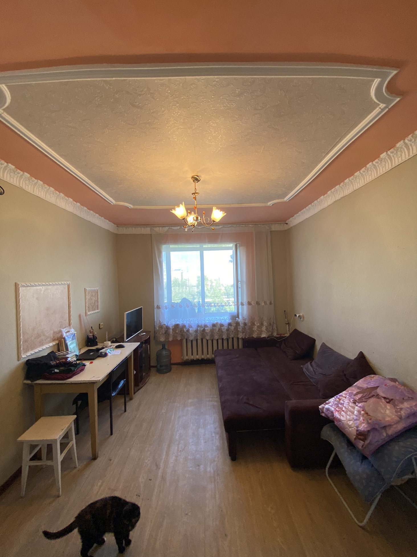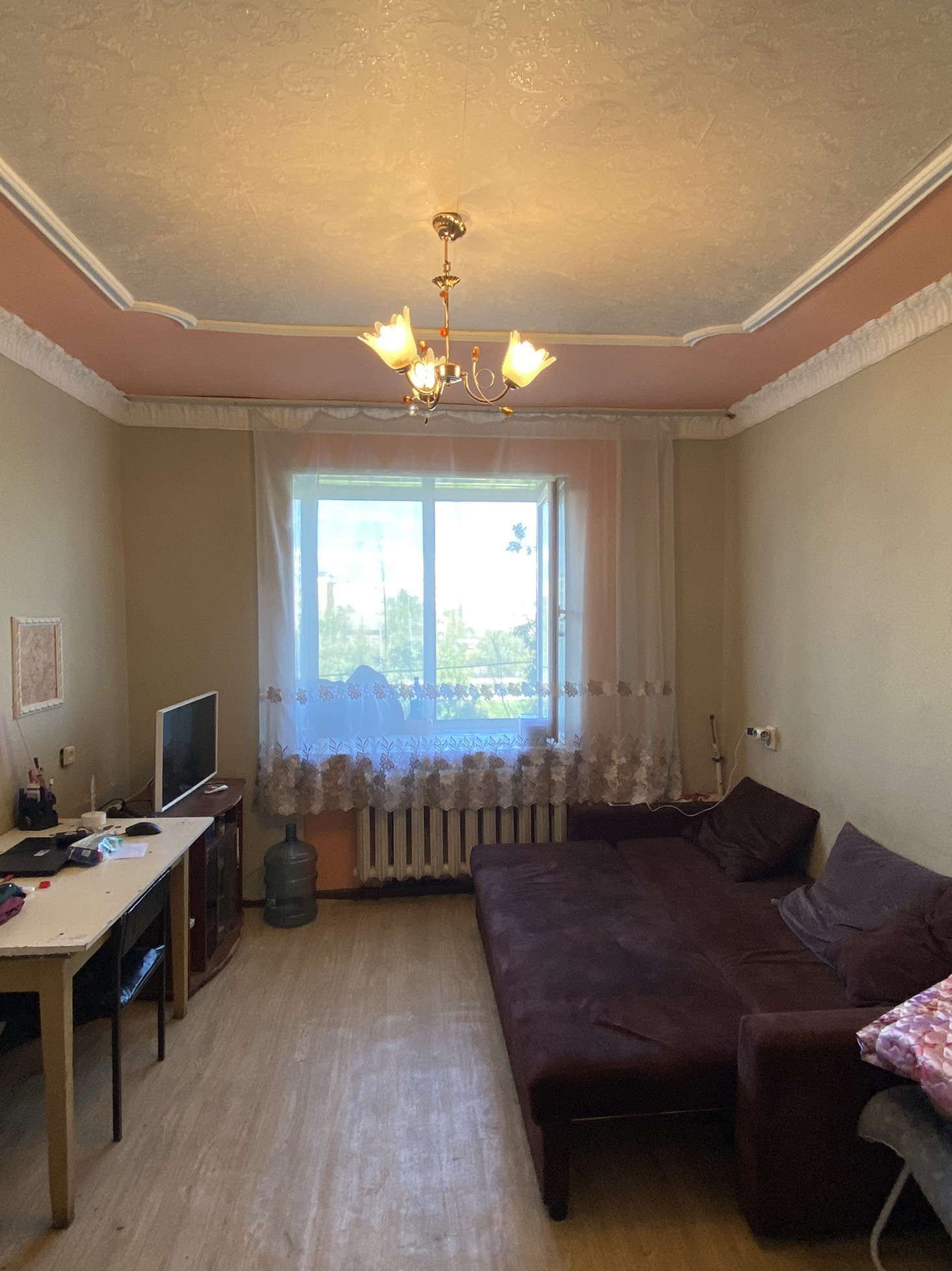 Комната с ремонтом, на полу линолеум, натяжные потолки