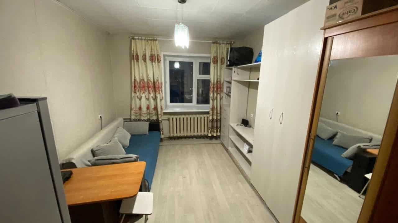 Комната в общежитии, (Дом быта),  4/4 - этаж., материал - бетоноблочный,  14кв.м,  с/у раздельный,  хозяев на с/у - 4,  есть ремонт,  нет балкона,  материал окон - пластик. (Торг. Санузел общий на 4 комнаты.)