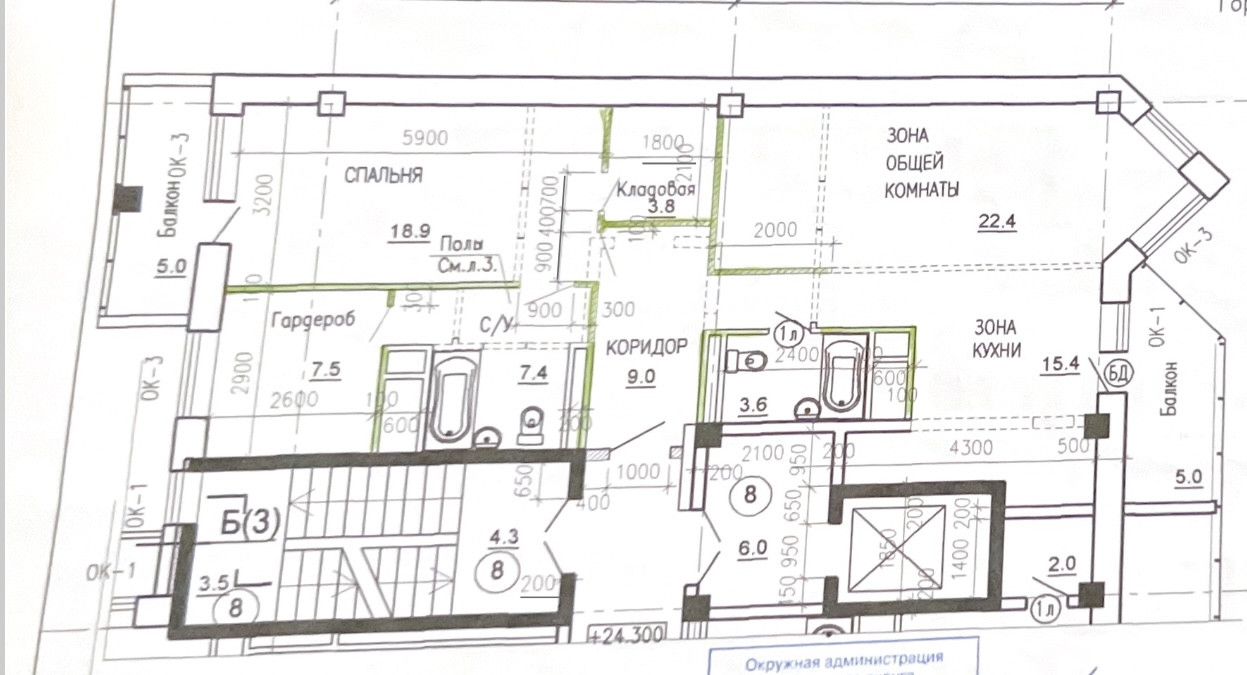 спальня, гостинная+кухня, кабинет, 2 сан.узла, 2 застекленных балкона