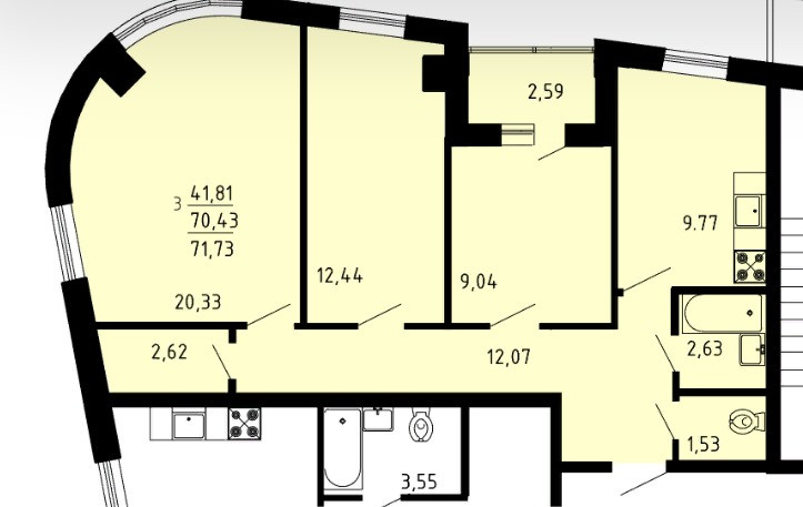 Просторная общая площадь 71.73 кв.м