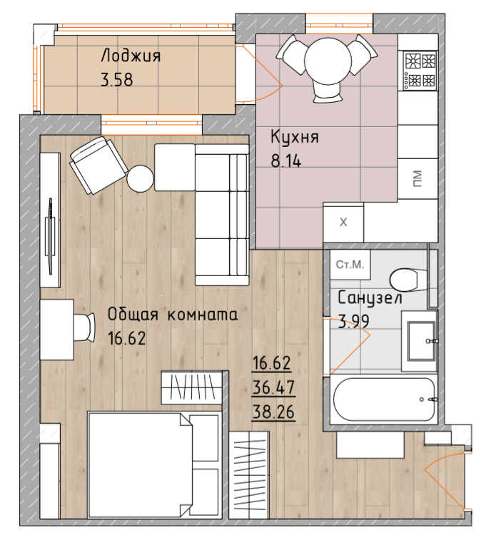 Жилая площадь 37.6 м2
