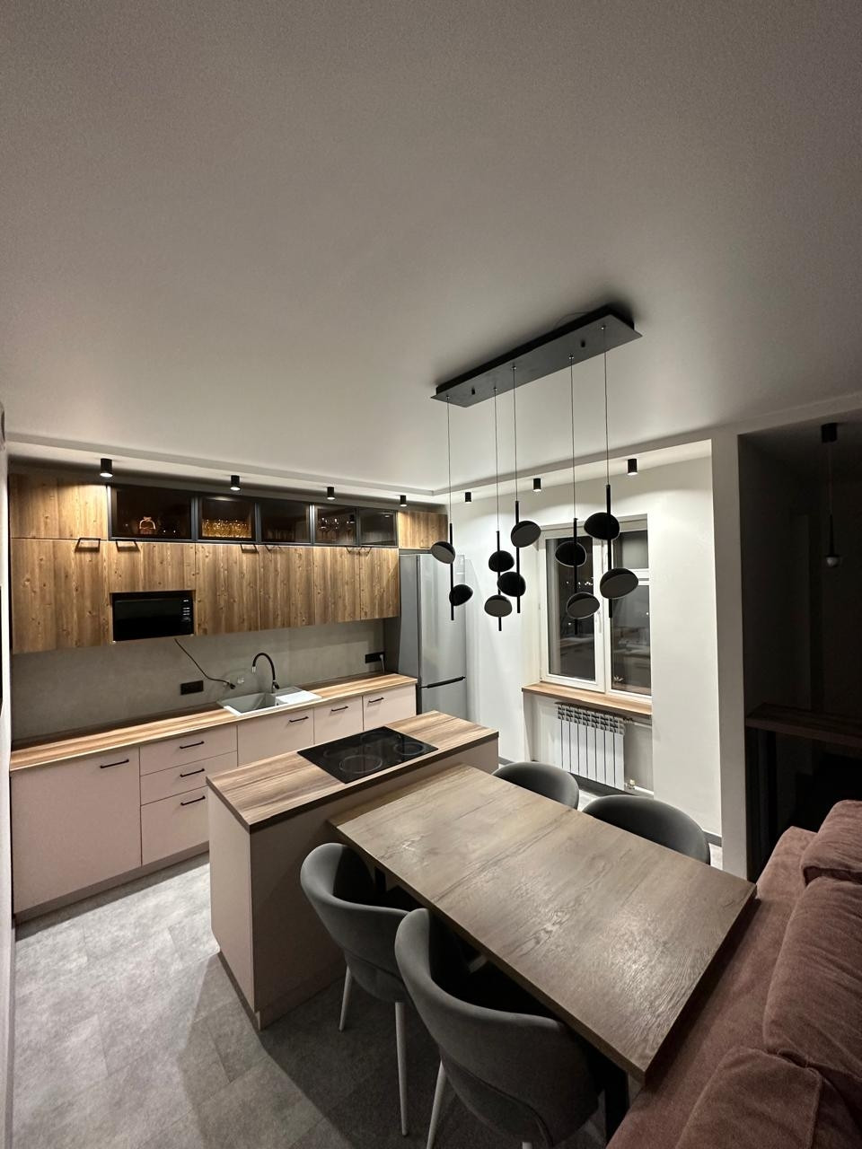В спальне мебель на заказ, установлена вместительная гардеробная комната с откатной дверью, в коридоре выделено дополнительное пространство (встроенный шкаф) для хранения хозяйственных вещей. Кухня на заказ, в островке установлена варочная панель.