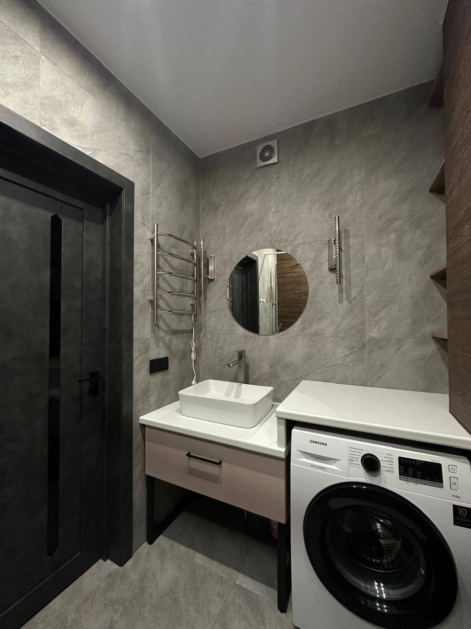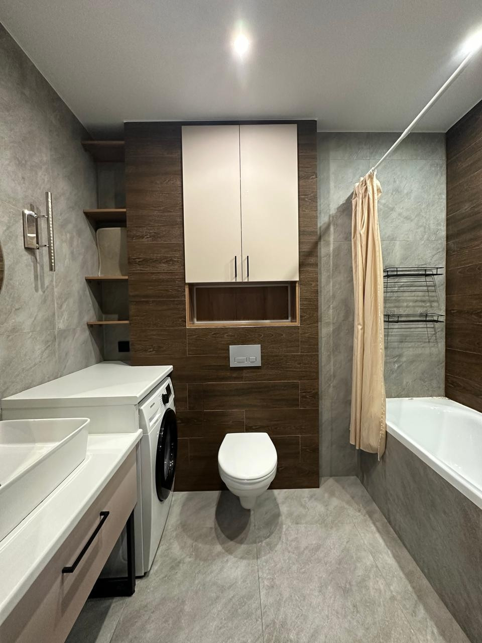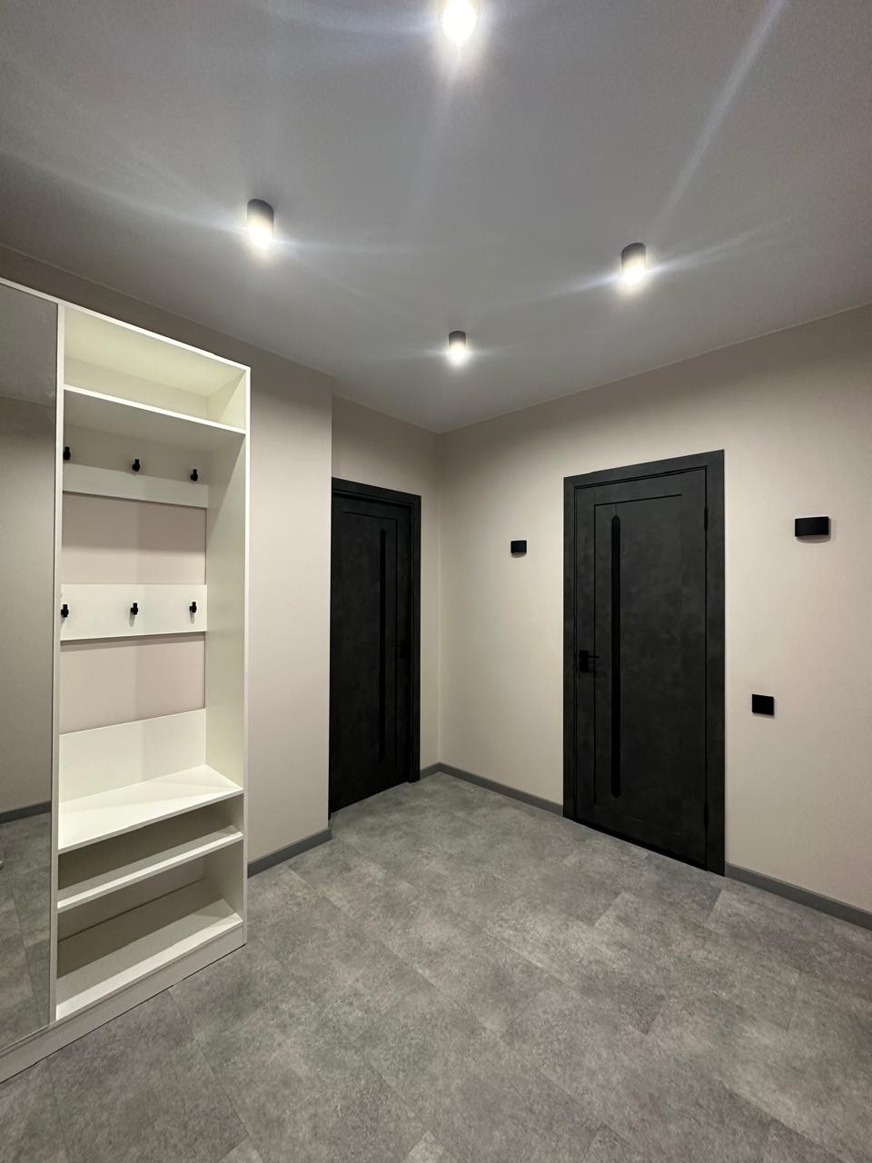 Покупателям остается краска с кодами цветов. Во всей квартире установлен натяжной потолок с освещением в каждой рабочей зоне.  Кварцвиниловые полы с полиуретановыми плинтусами не дают возможности потопа соседей и порчи покрытия. Санузел совмещенный с установленными на заказ полками. Имеется доступ к счетчикам через систему скрытого монтажа, проверка счетчиков свежая, снова потребуется только через 6 лет.
