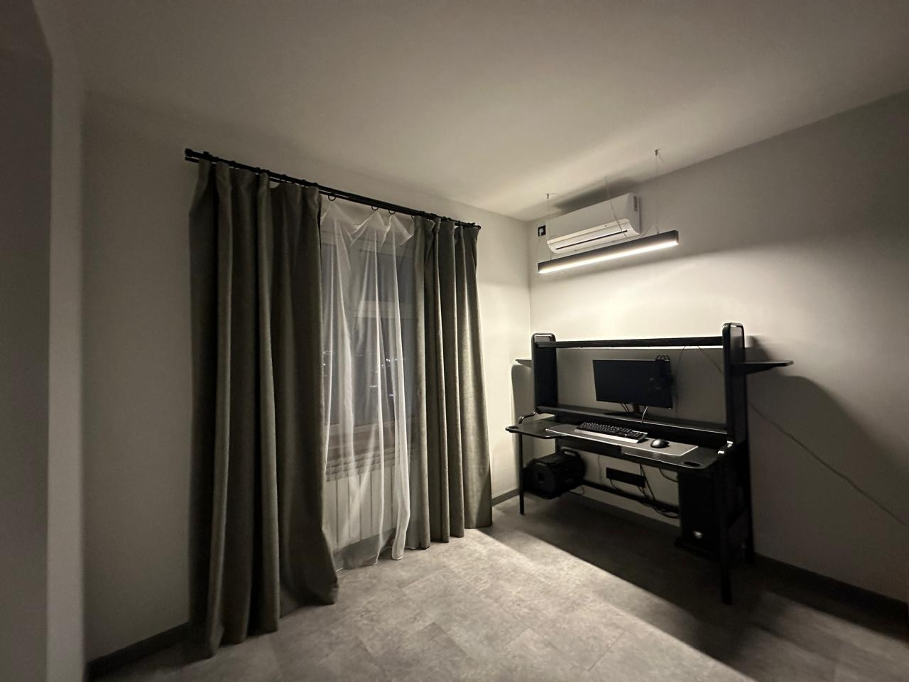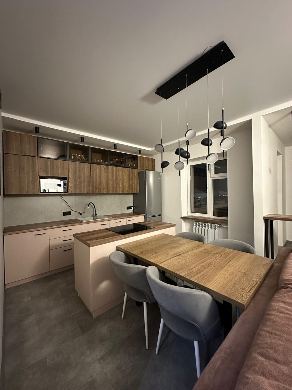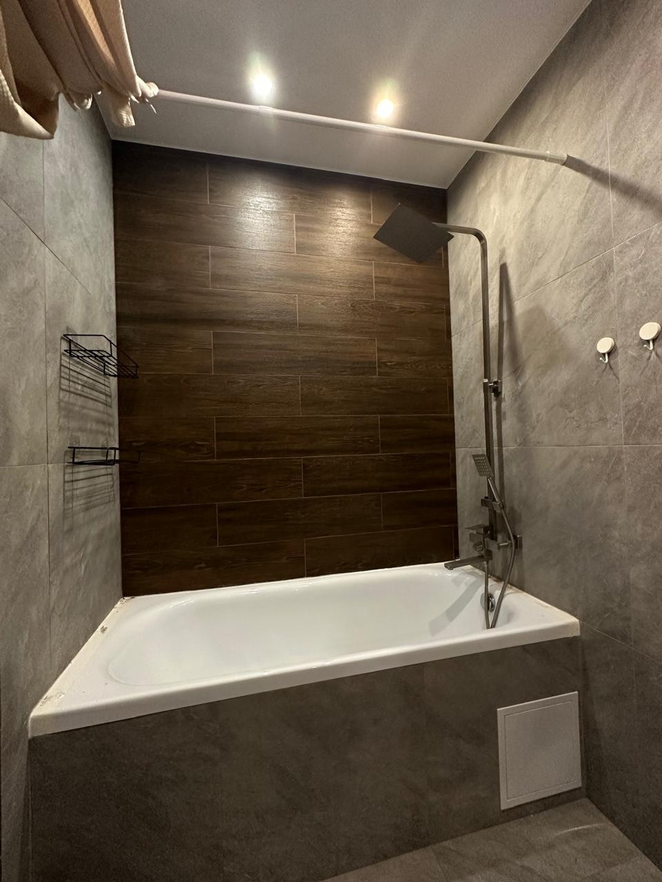 Покупателям остается краска с кодами цветов. Во всей квартире установлен натяжной потолок с освещением в каждой рабочей зоне.  Кварцвиниловые полы с полиуретановыми плинтусами не дают возможности потопа соседей и порчи покрытия. Санузел совмещенный с установленными на заказ полками. Имеется доступ к счетчикам через систему скрытого монтажа, проверка счетчиков свежая, снова потребуется только через 6 лет.