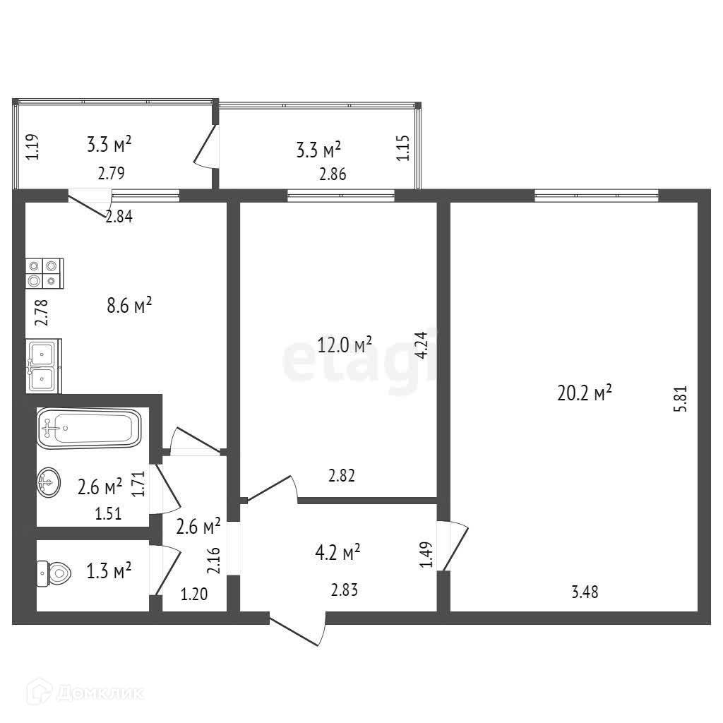 Общая площадь 51.5 м2
