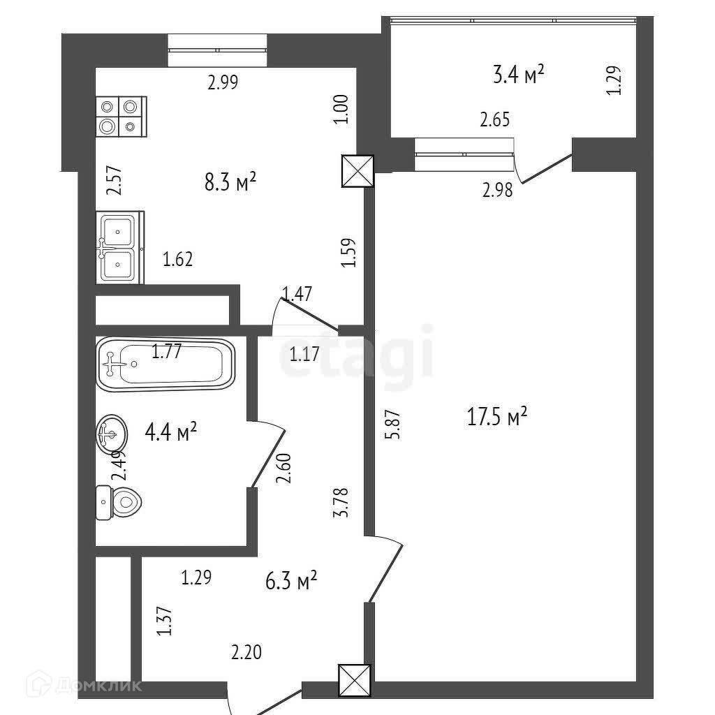 Площадь 36,5 м2 +лоджия 3,4 м2