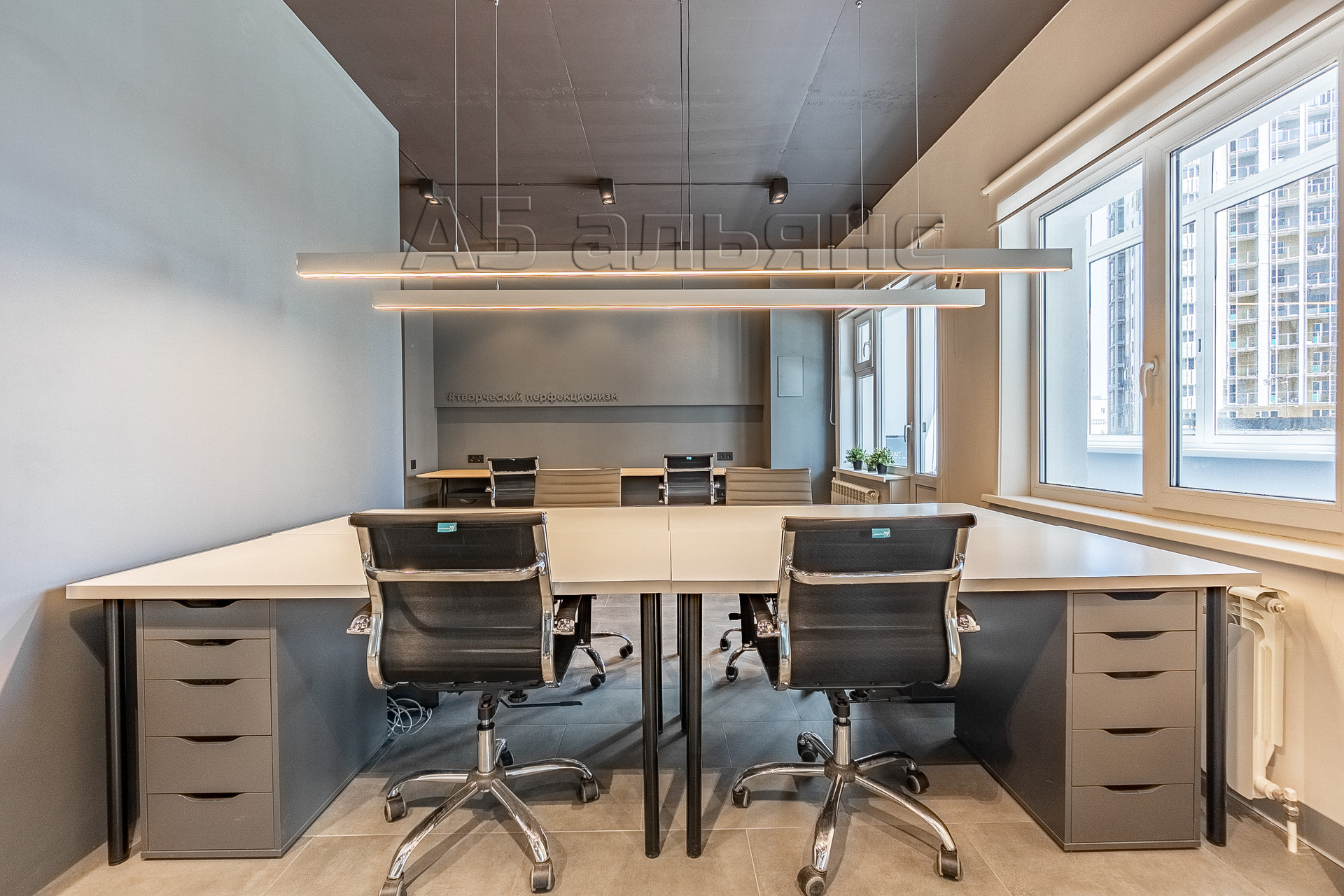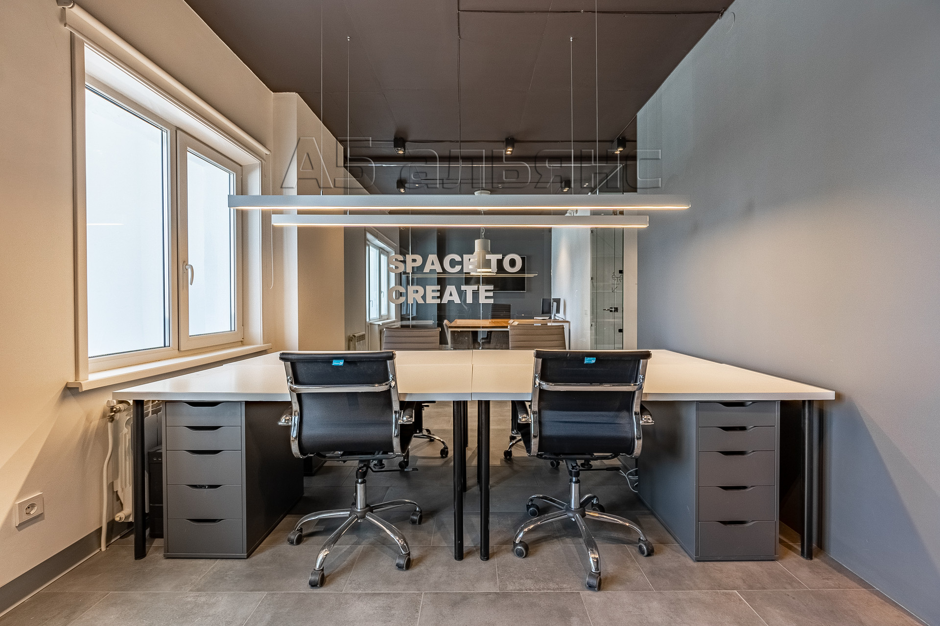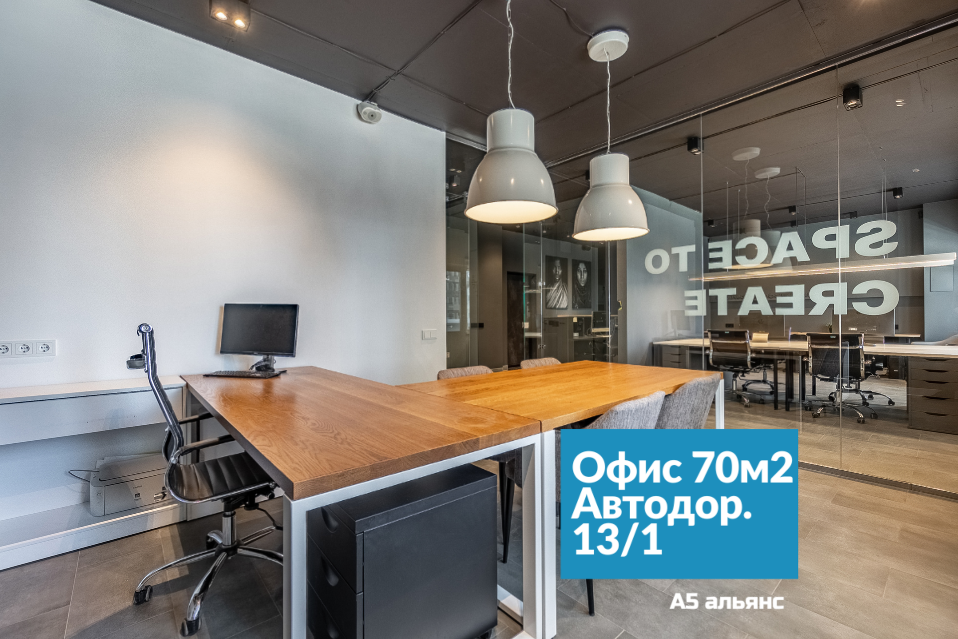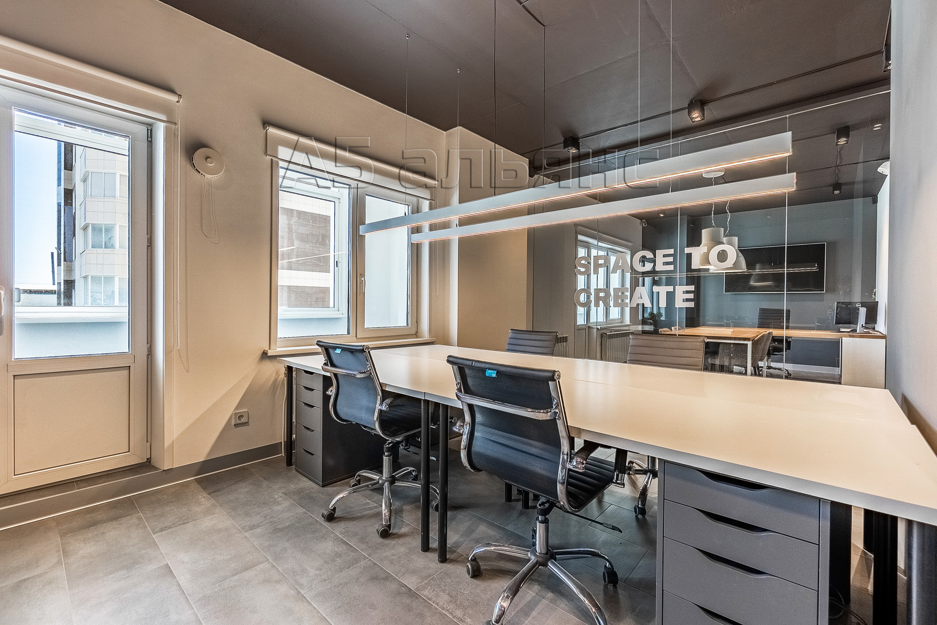 В основном помещении есть рабочие места для 6-ти сотрудников: каждый имеет свой большой стол, тумбу для хранения личных вещей и индивидуальное освещение. Есть выход на вторую лоджию площадью 6,1 м2. Все окна оборудованы римскими жалюзями, естественной вентиляцией домвент. На входе встречает стойка ресепшн и широкая колонна с подсветкой, где можно установить логотип/название фирмы.