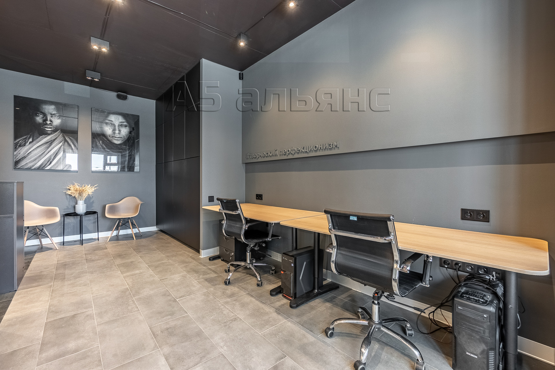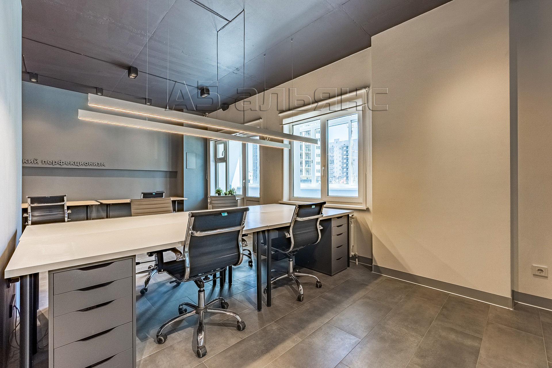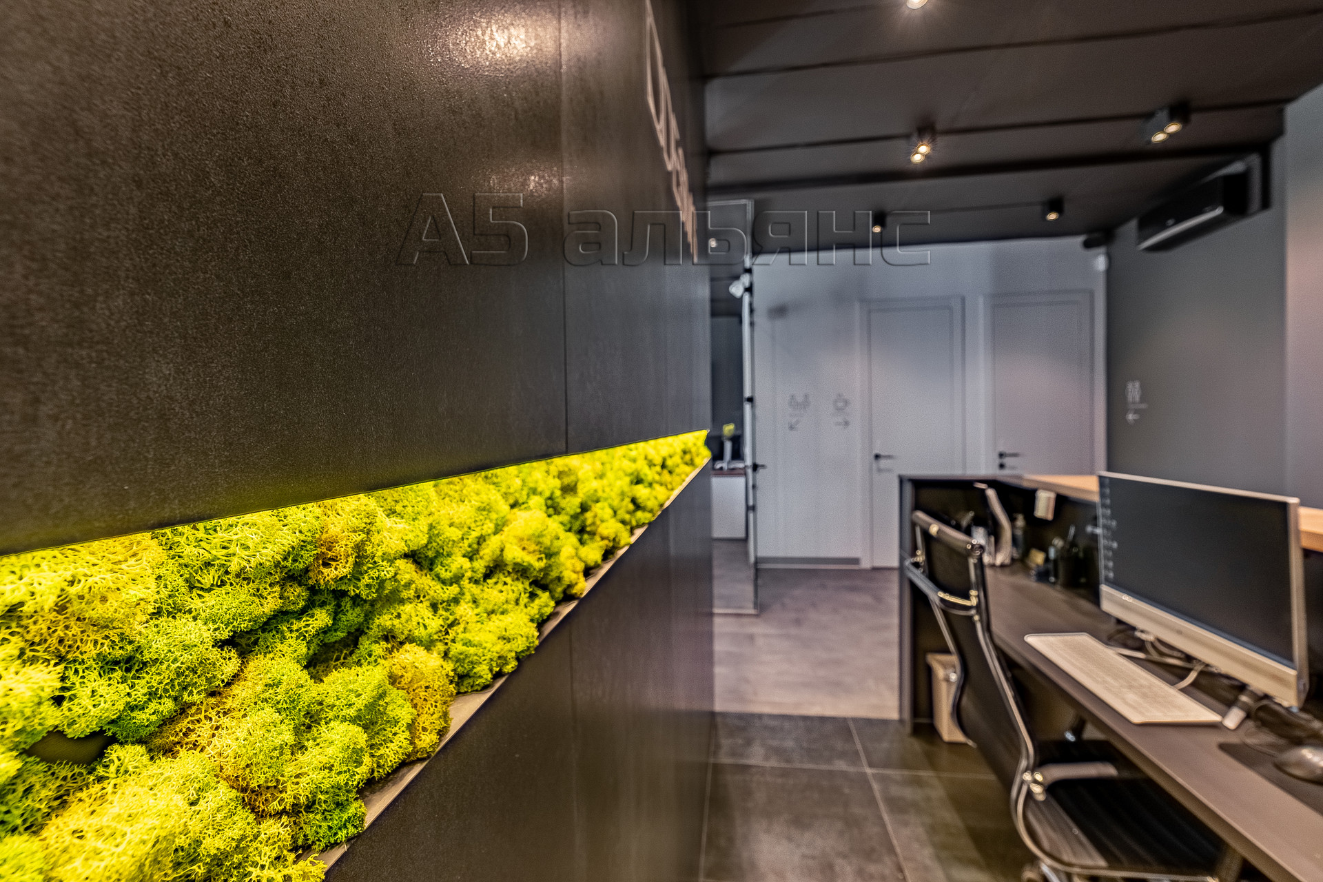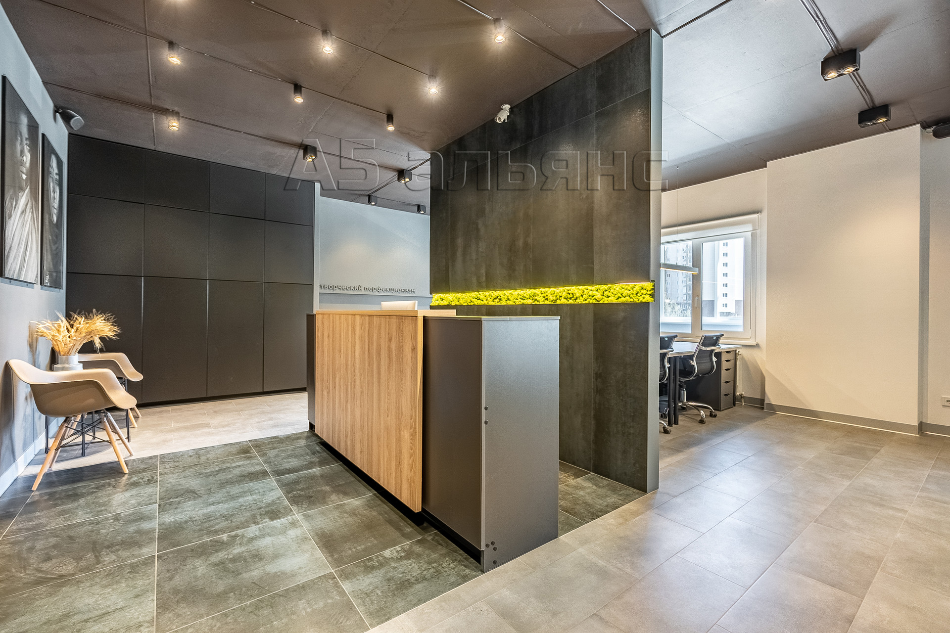 В основном помещении есть рабочие места для 6-ти сотрудников: каждый имеет свой большой стол, тумбу для хранения личных вещей и индивидуальное освещение. Есть выход на вторую лоджию площадью 6,1 м2. Все окна оборудованы римскими жалюзями, естественной вентиляцией домвент. На входе встречает стойка ресепшн и широкая колонна с подсветкой, где можно установить логотип/название фирмы.