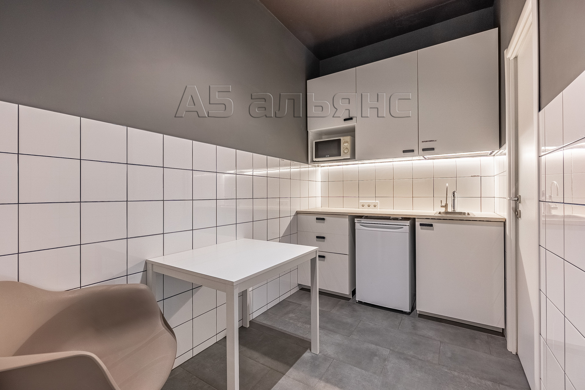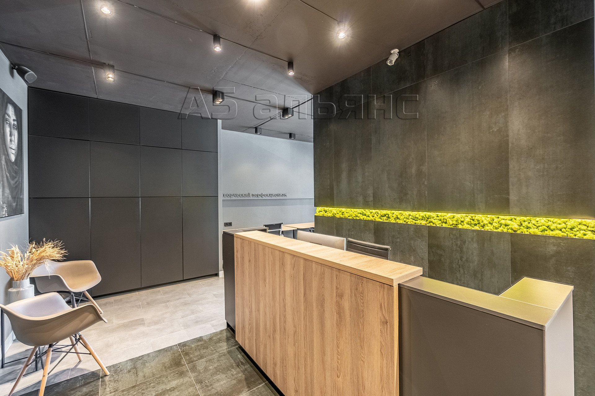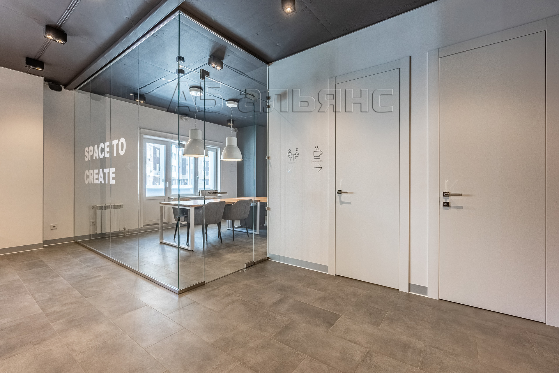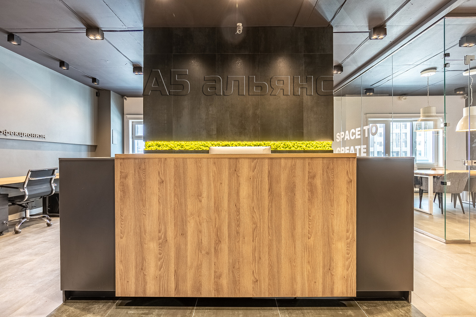 В основном помещении есть рабочие места для 6-ти сотрудников: каждый имеет свой большой стол, тумбу для хранения личных вещей и индивидуальное освещение. Есть выход на вторую лоджию площадью 6,1 м2. Все окна оборудованы римскими жалюзями, естественной вентиляцией домвент. На входе встречает стойка ресепшн и широкая колонна с подсветкой, где можно установить логотип/название фирмы.