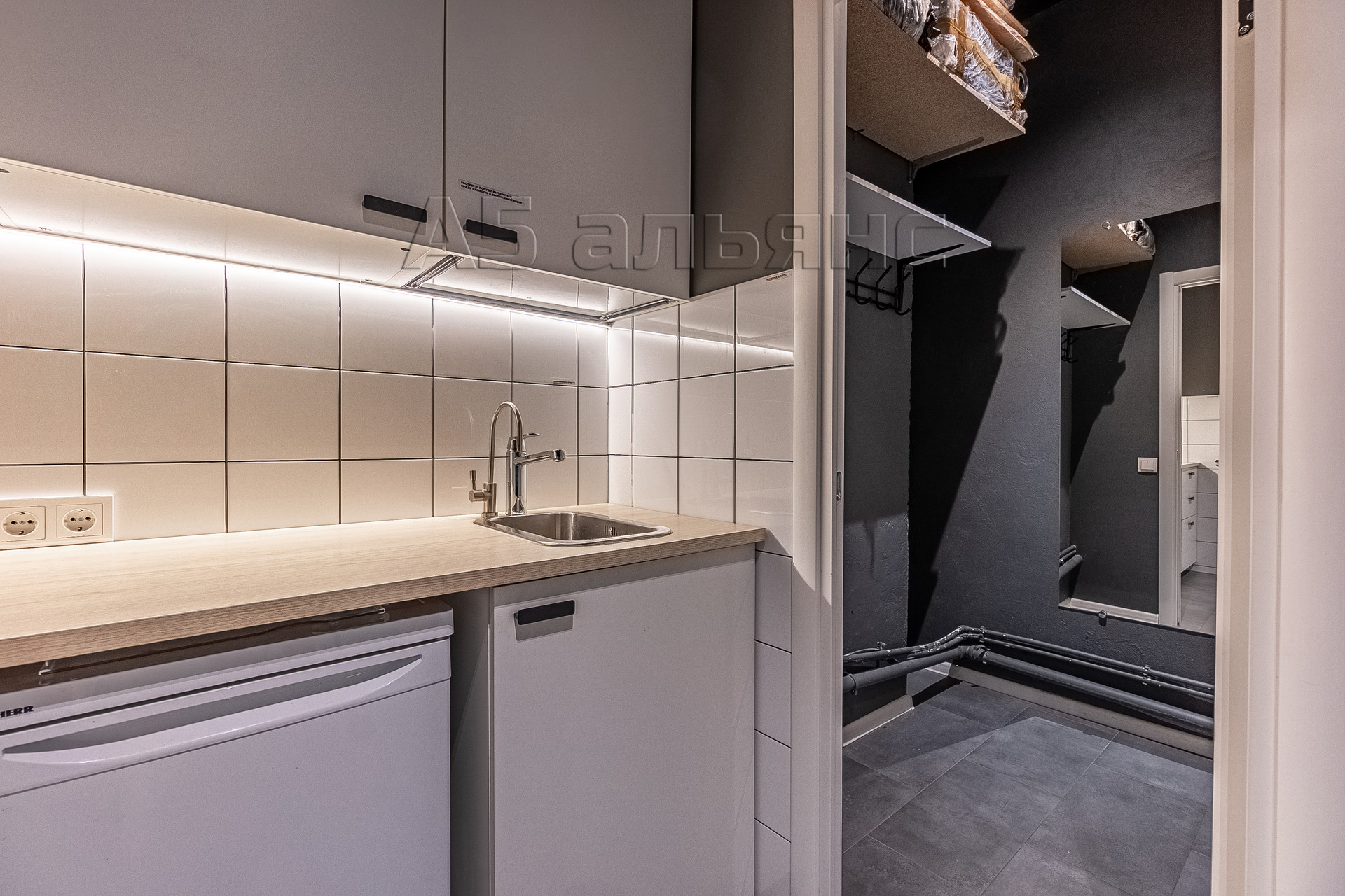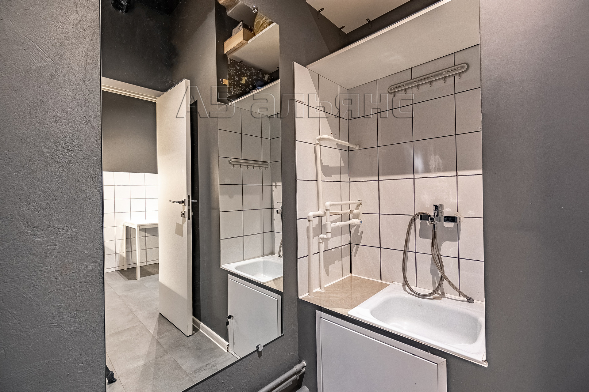 В санузле есть вся сантехника и раковина с тумбой и зеркалом с подсветкой. Комната для приёма пищи и кладовая имеют оборудованные мокрые точки.