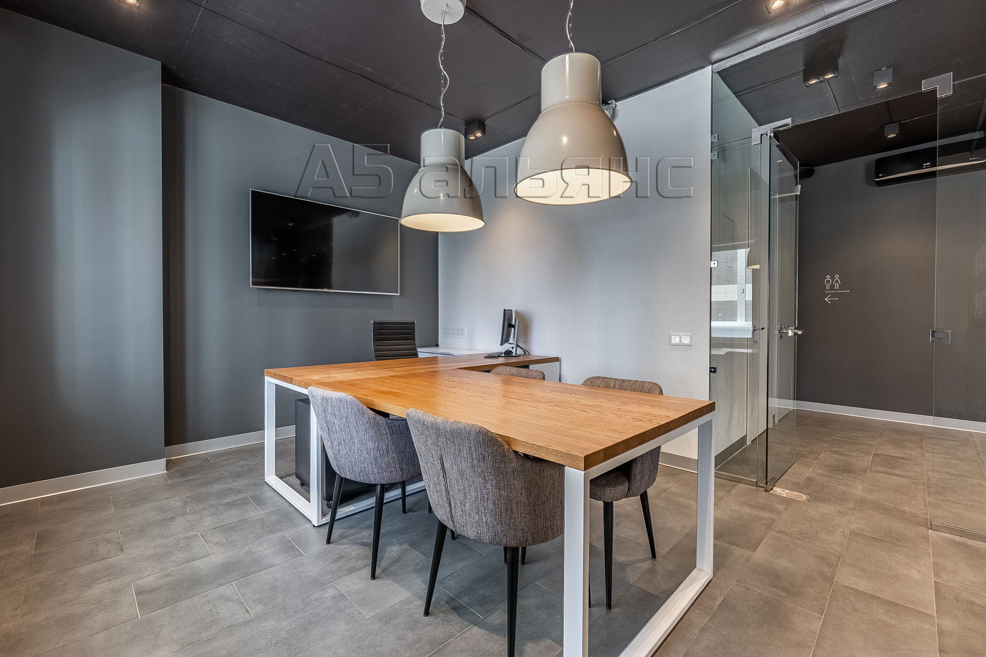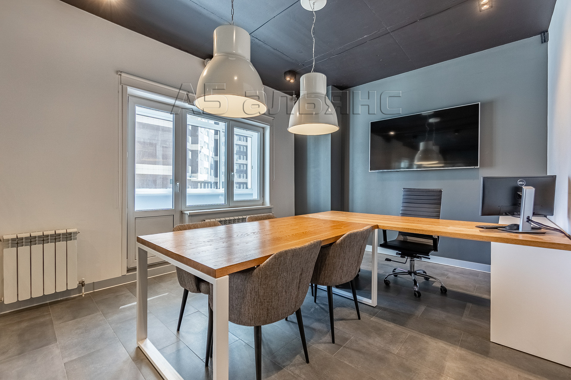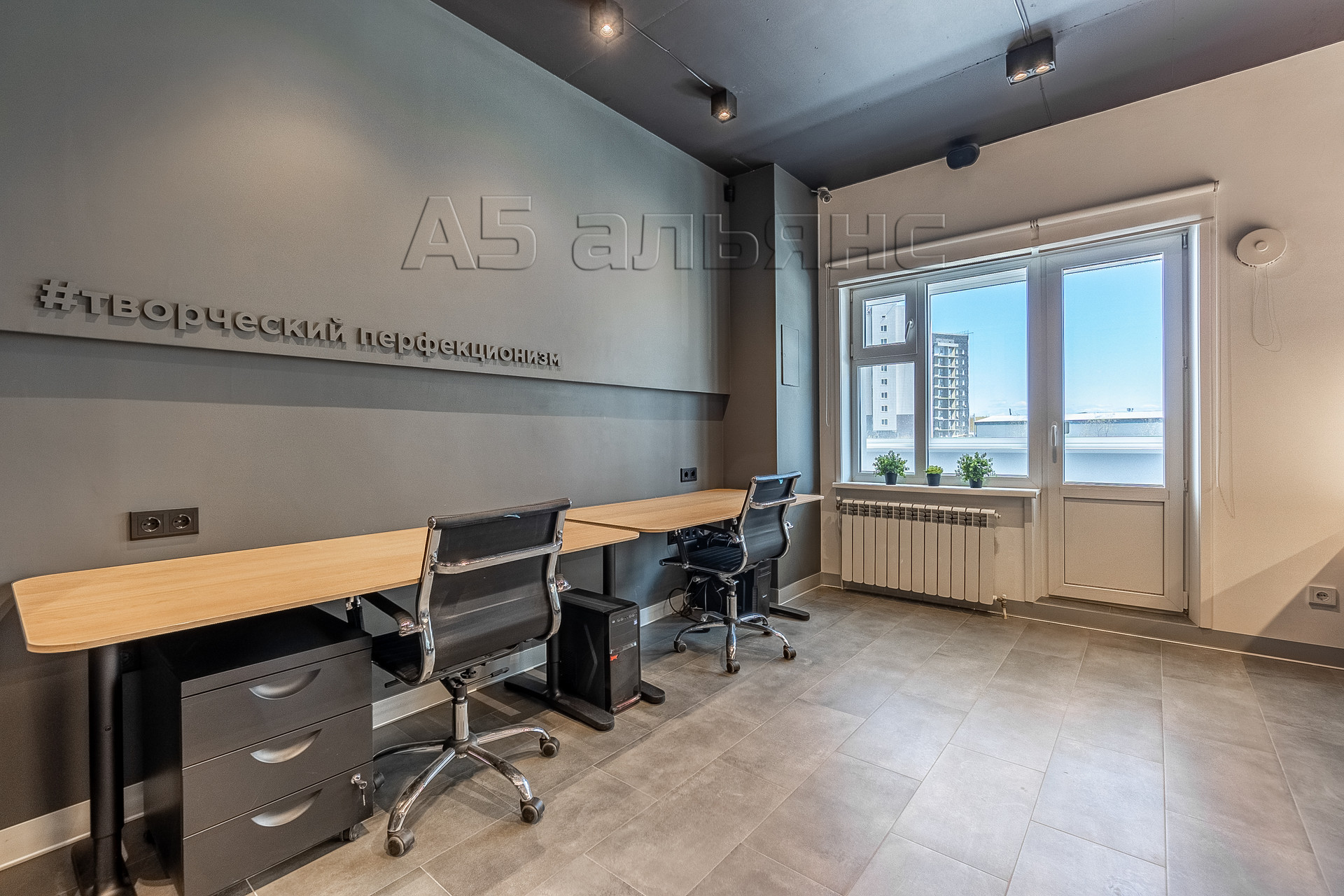 Изолированное остеклённое помещение руководителя имеет трёхсекционное окно с выходом на лоджию площадью 6,1 м2. В нём остаётся большой телевизор на 65 дюймов и рабочий стол формы Т со стульями.