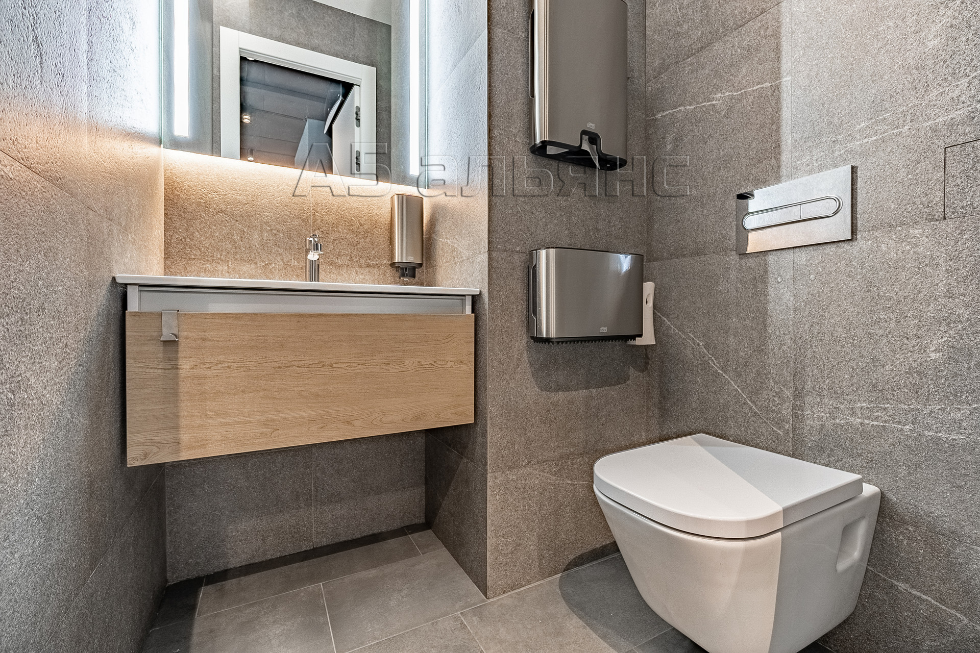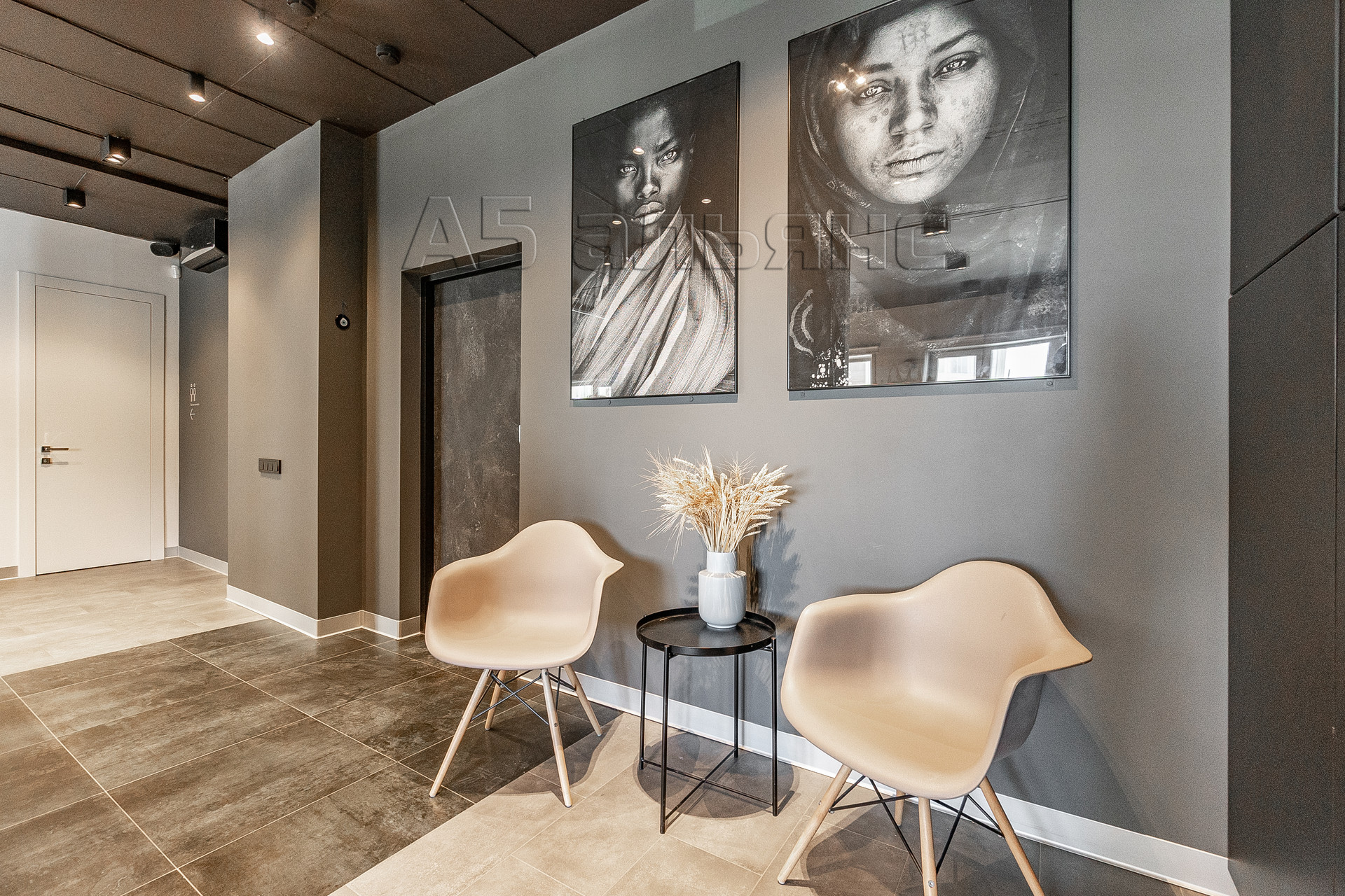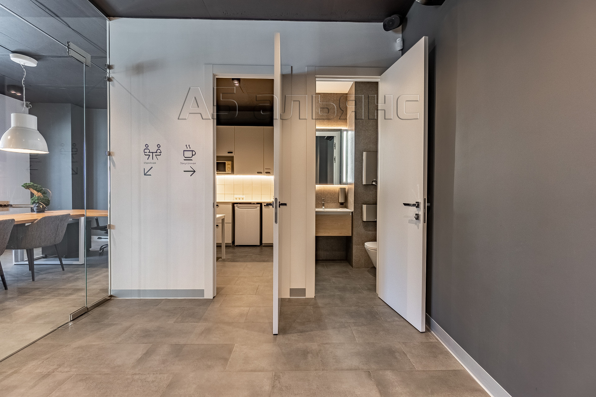 Весь пол в помещении уложен крупнолистовым керамогранитом. Установлен кондиционер фирмы Bally, многосекционные шкафы для хранения вещей, аудиосистема, покрывающая всю площадь помещения, видеонаблюдение, сигнализация и электронная кодовая дверь системы Samsung.