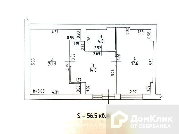 Общая площадь 56.5 м2