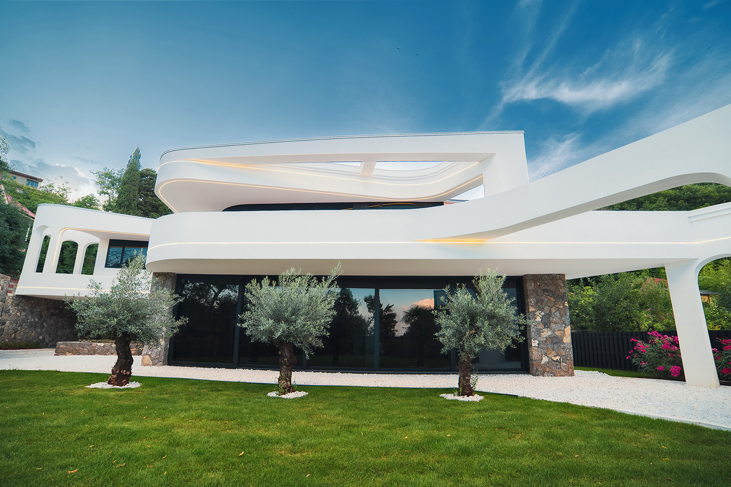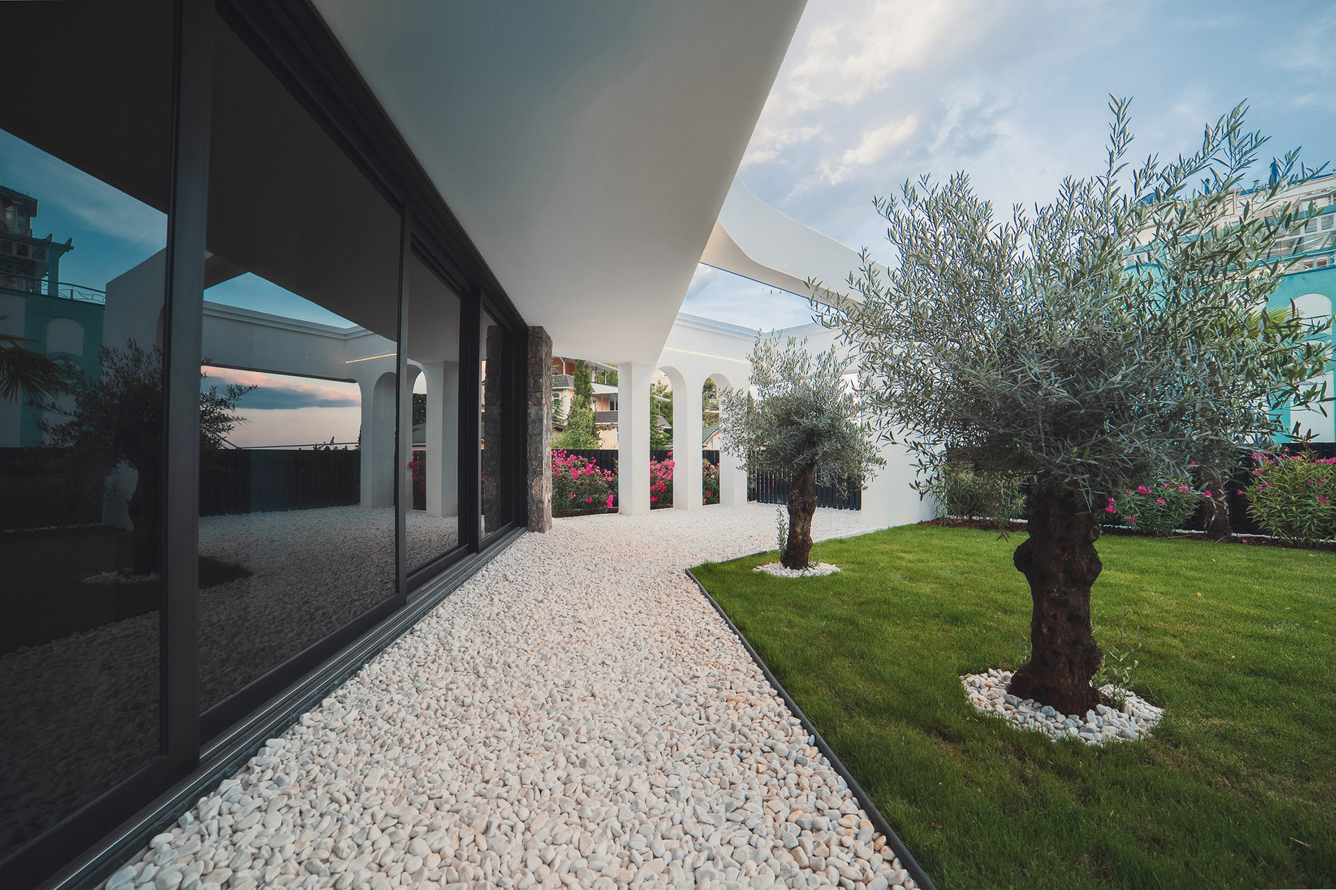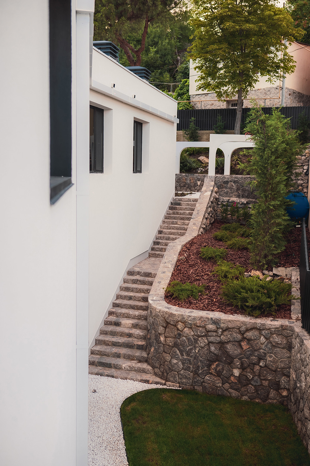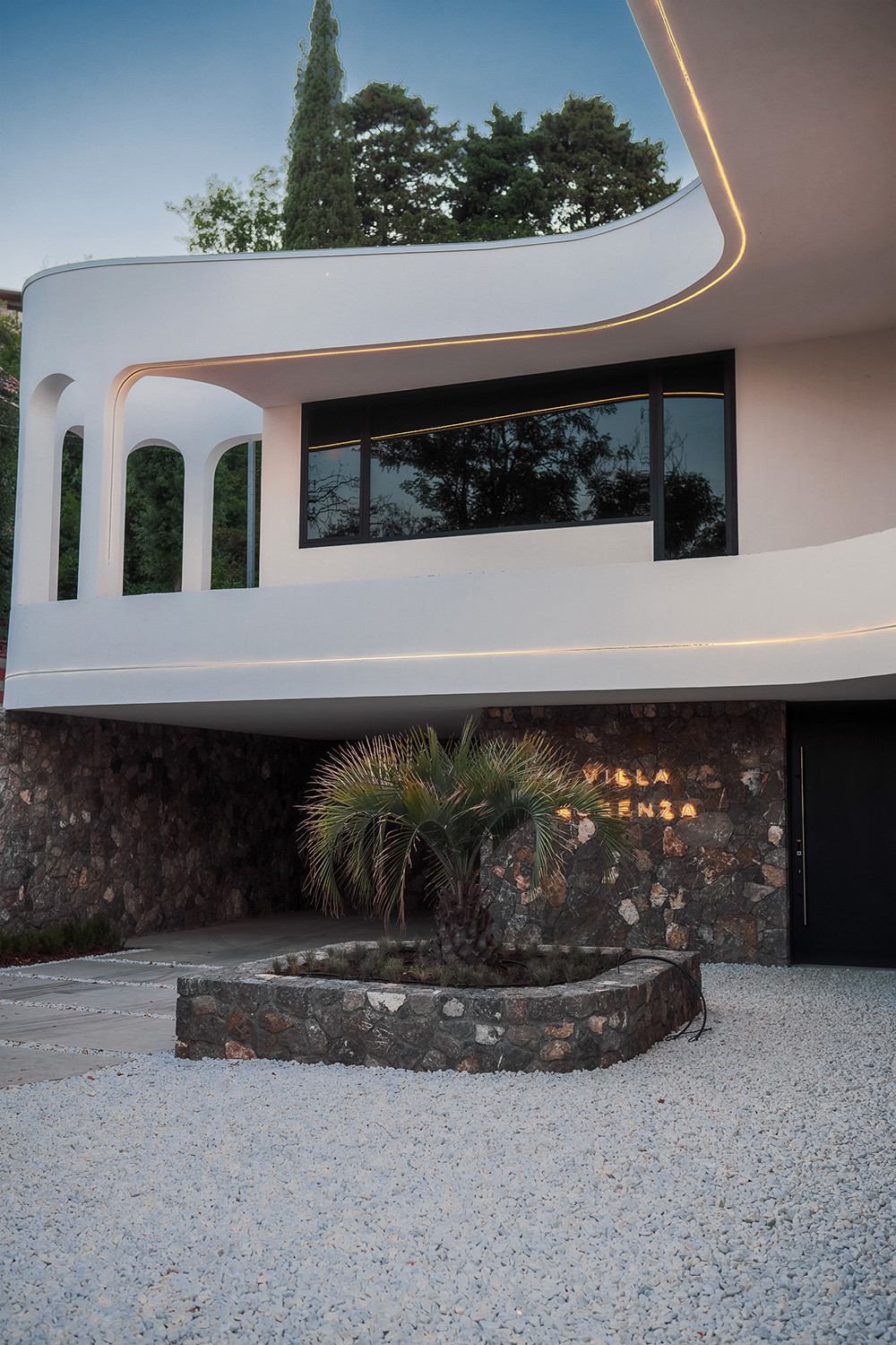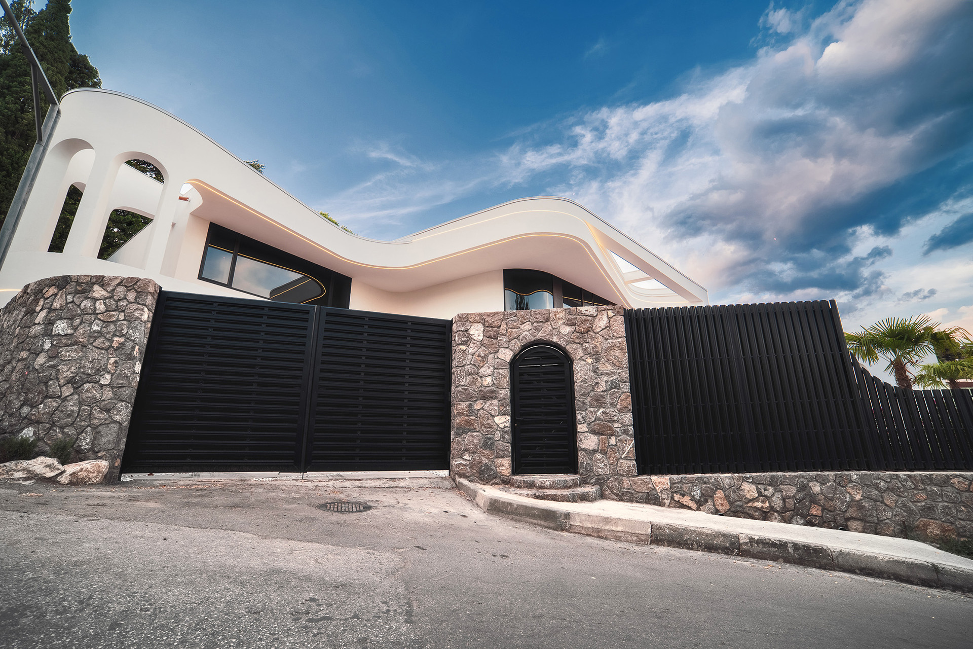 Вилла представляет собой 440 кв.м., 290 кв.м. внутренняя площадь, 2 этажа и эксплуатируемая крыша. Расположена так, чтобы на территории создавался уют и уединение.