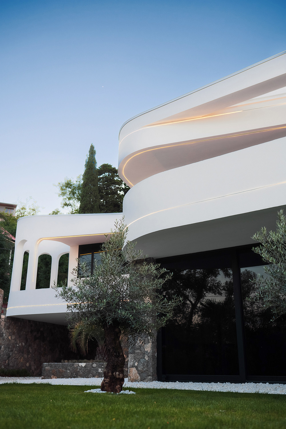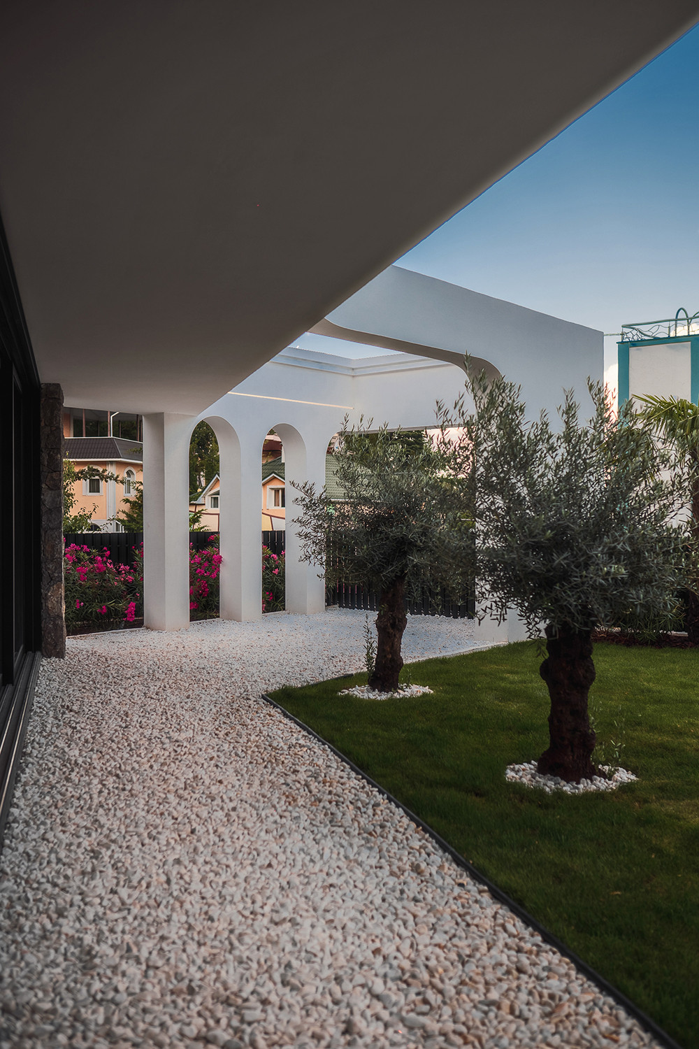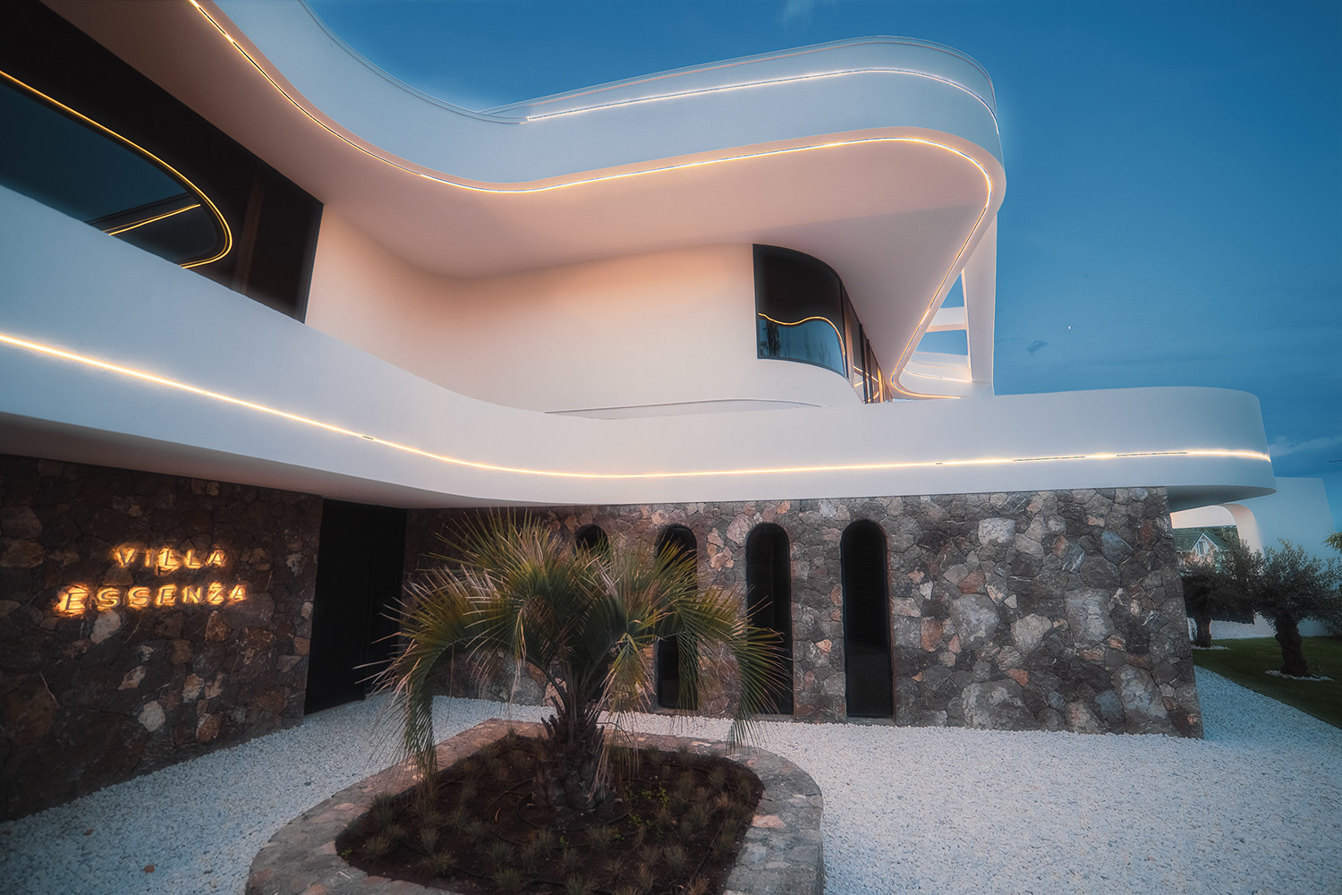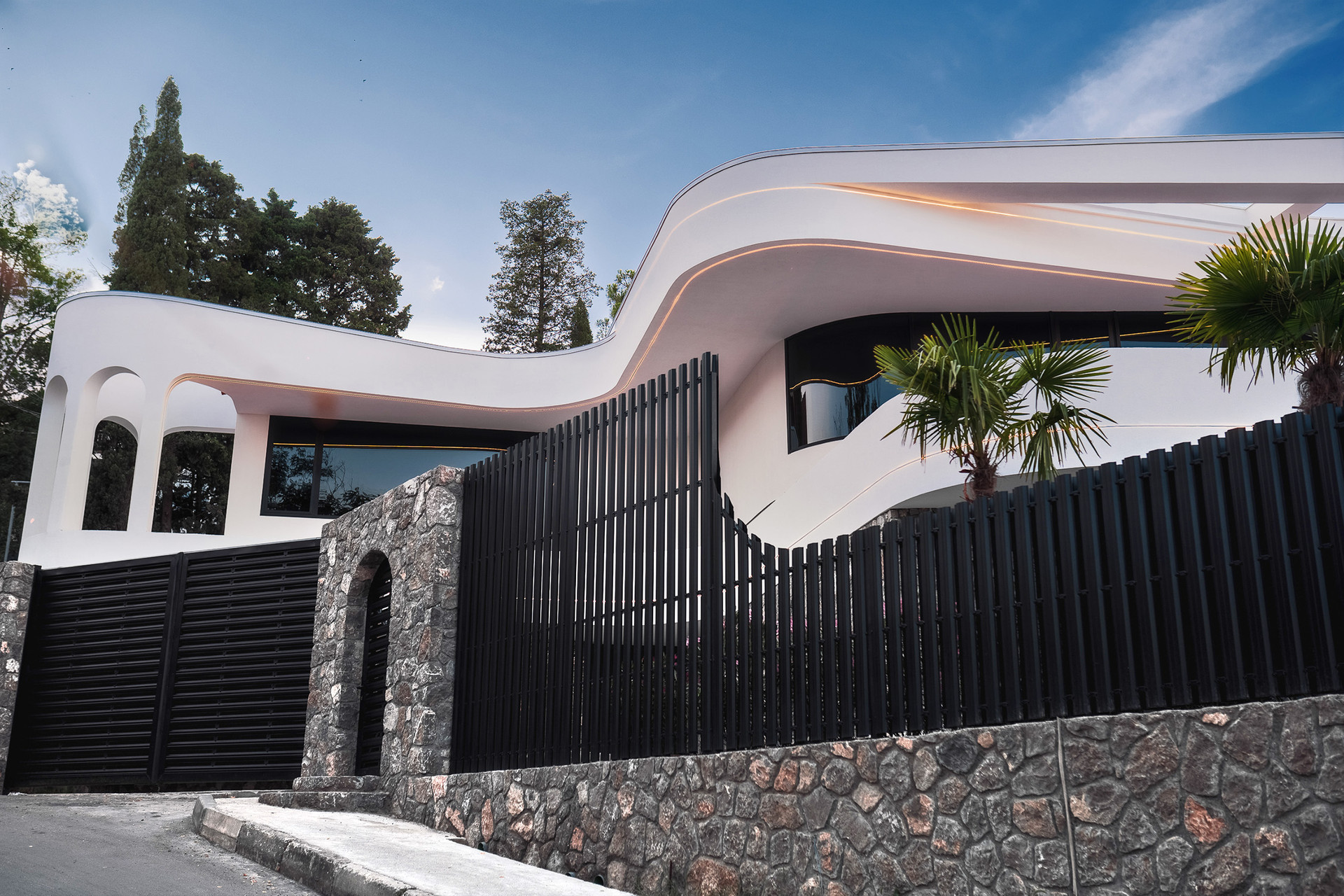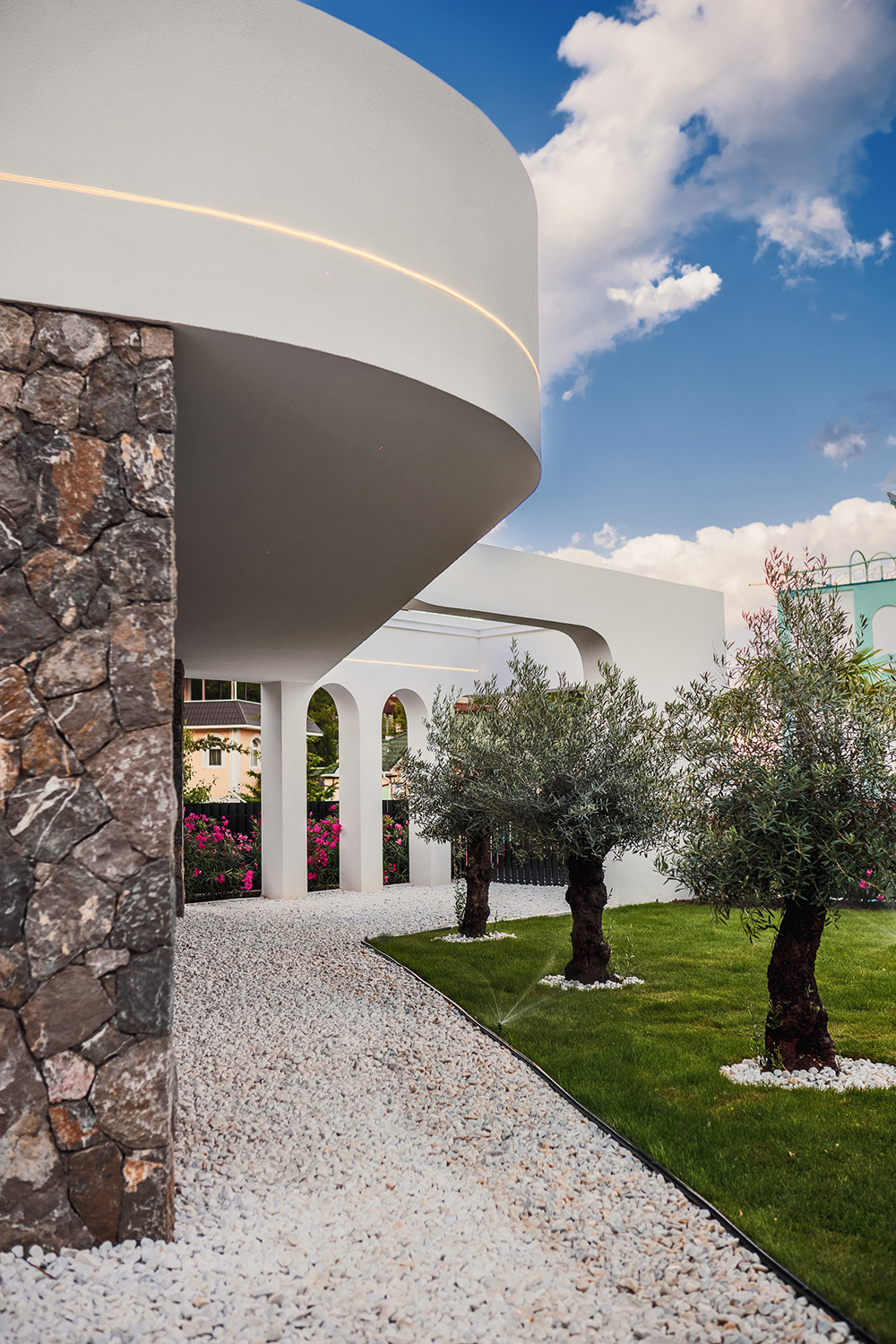 Вилла представляет собой 440 кв.м., 290 кв.м. внутренняя площадь, 2 этажа и эксплуатируемая крыша. Расположена так, чтобы на территории создавался уют и уединение.