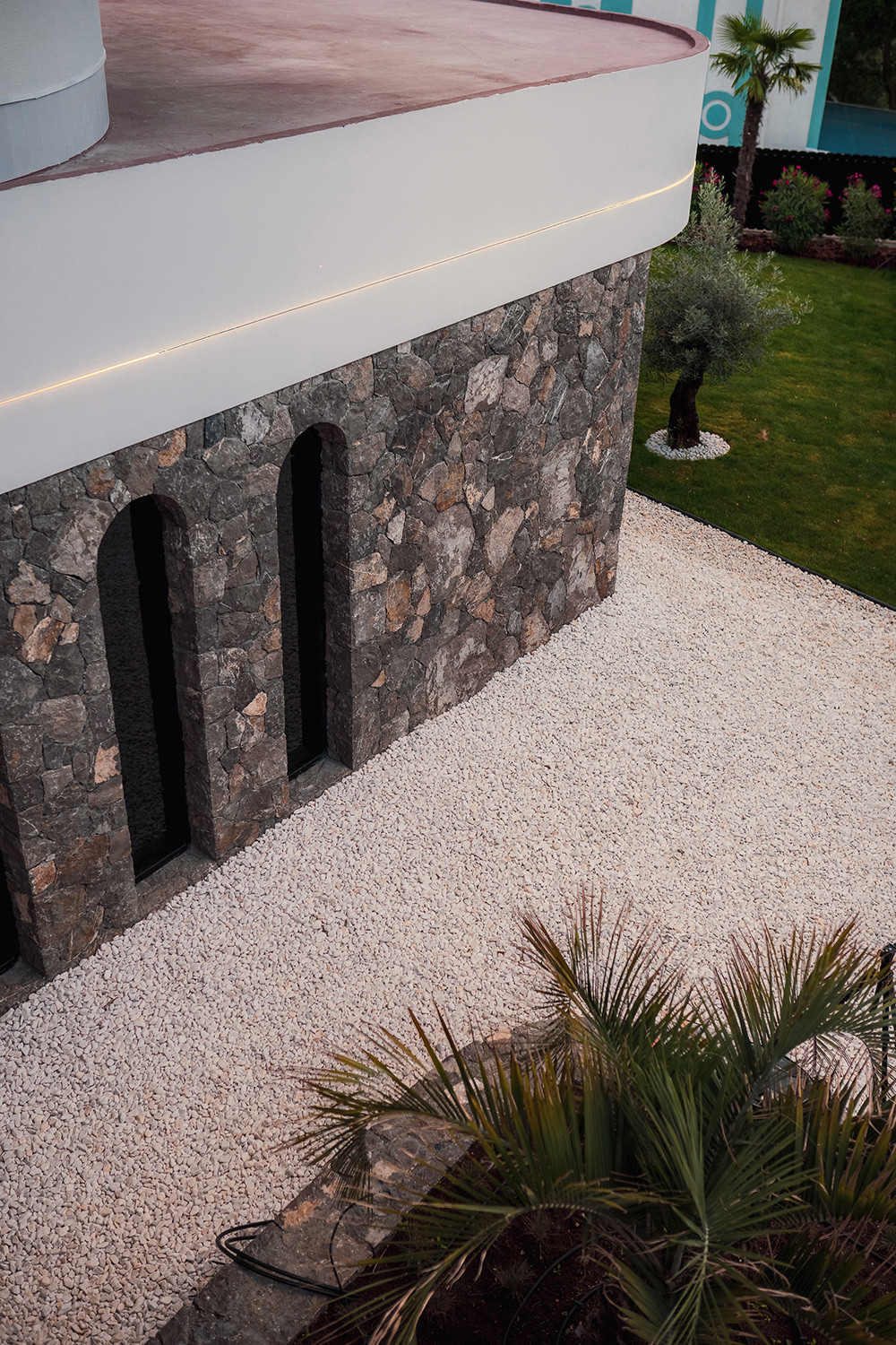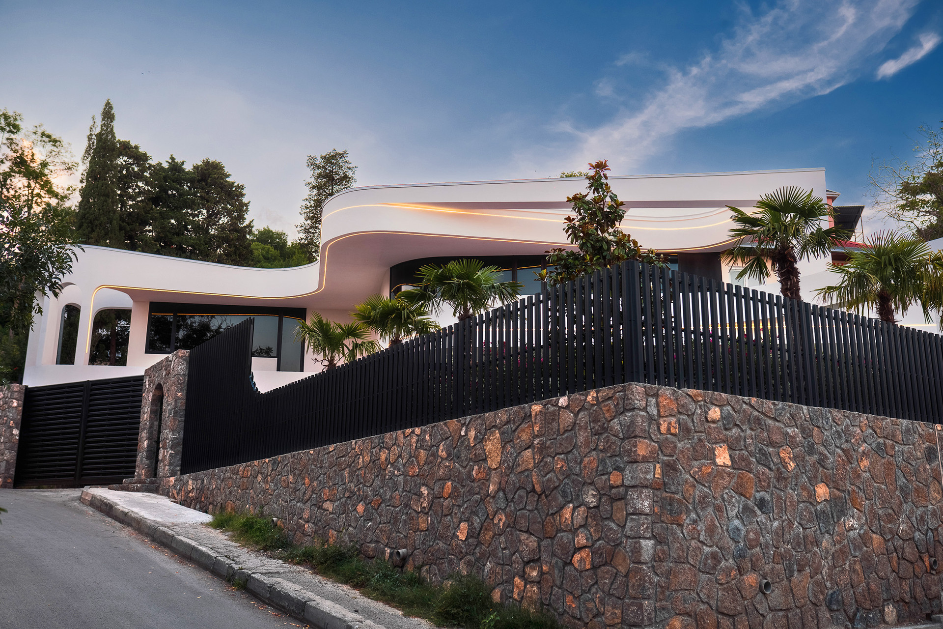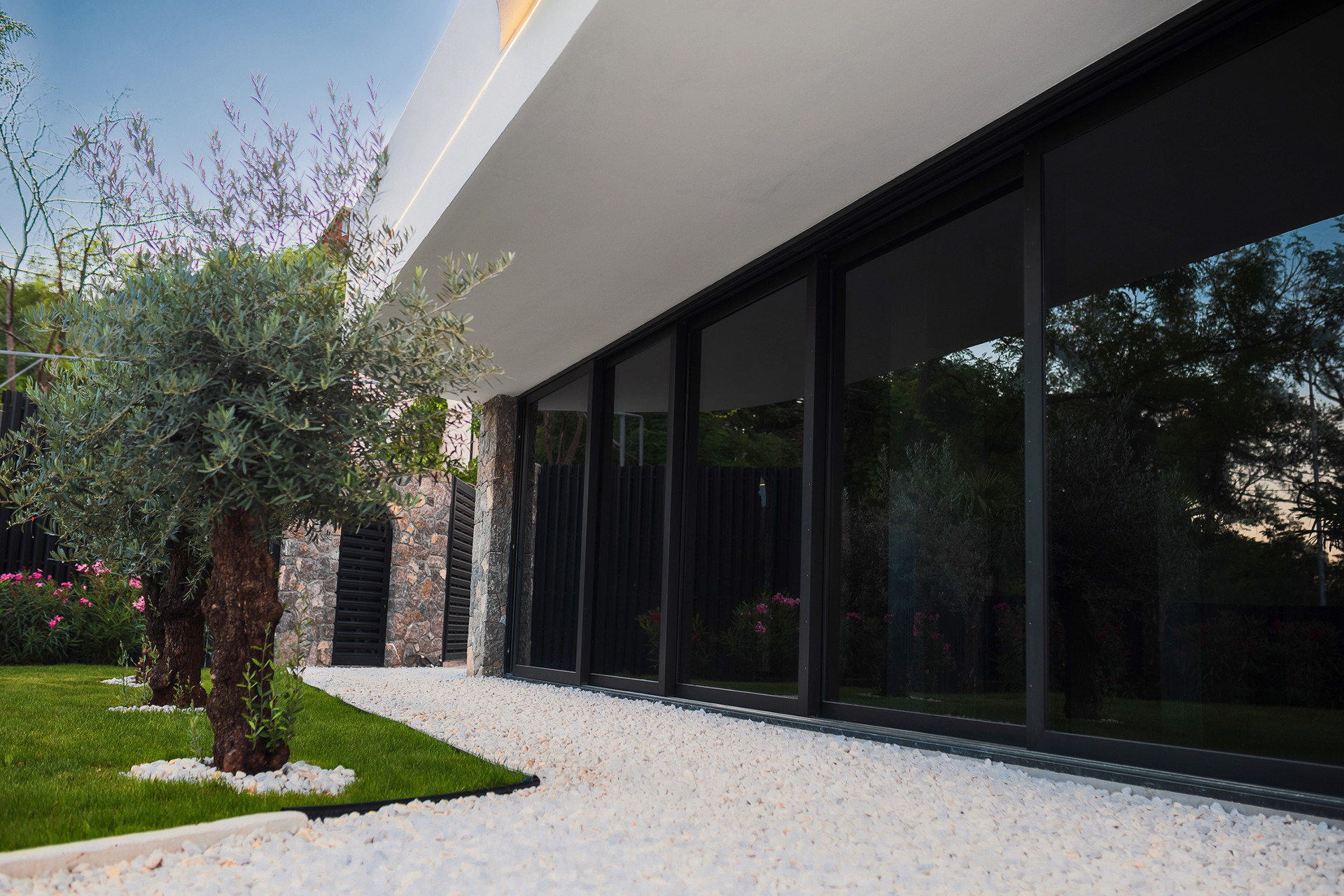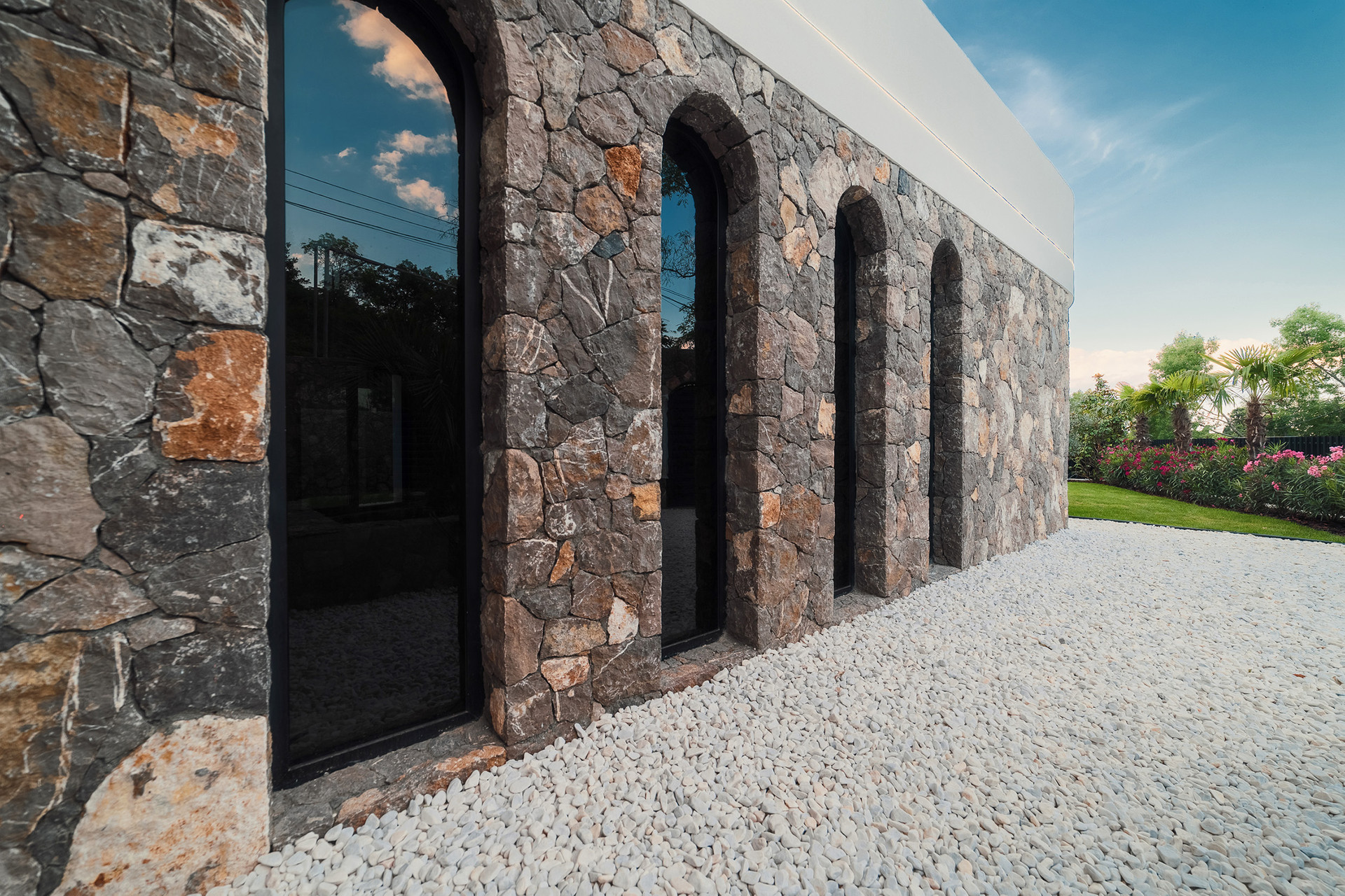 Фасад виллы утеплен, отделан натуральным камнем, в некоторых местах покрыт фасадной штукатуркой.