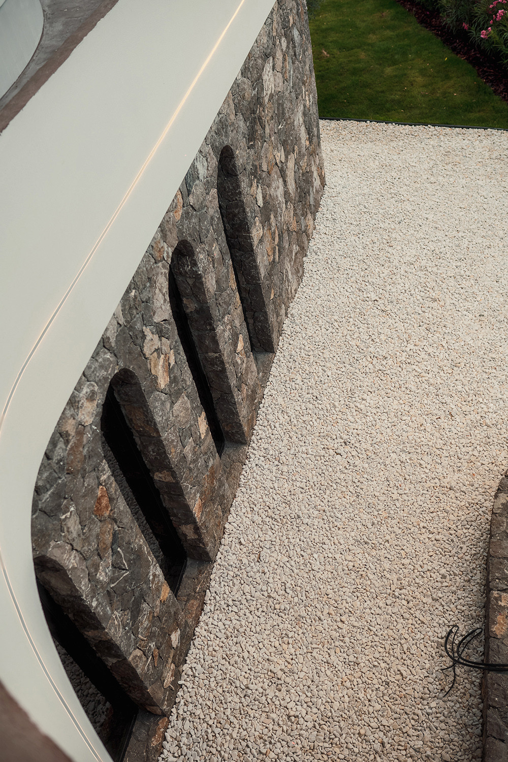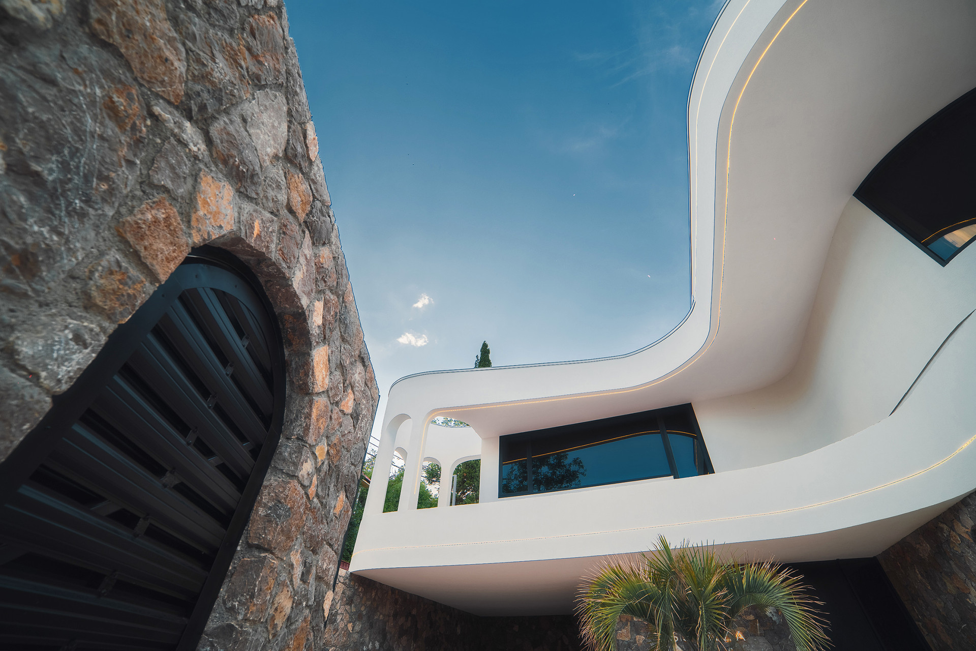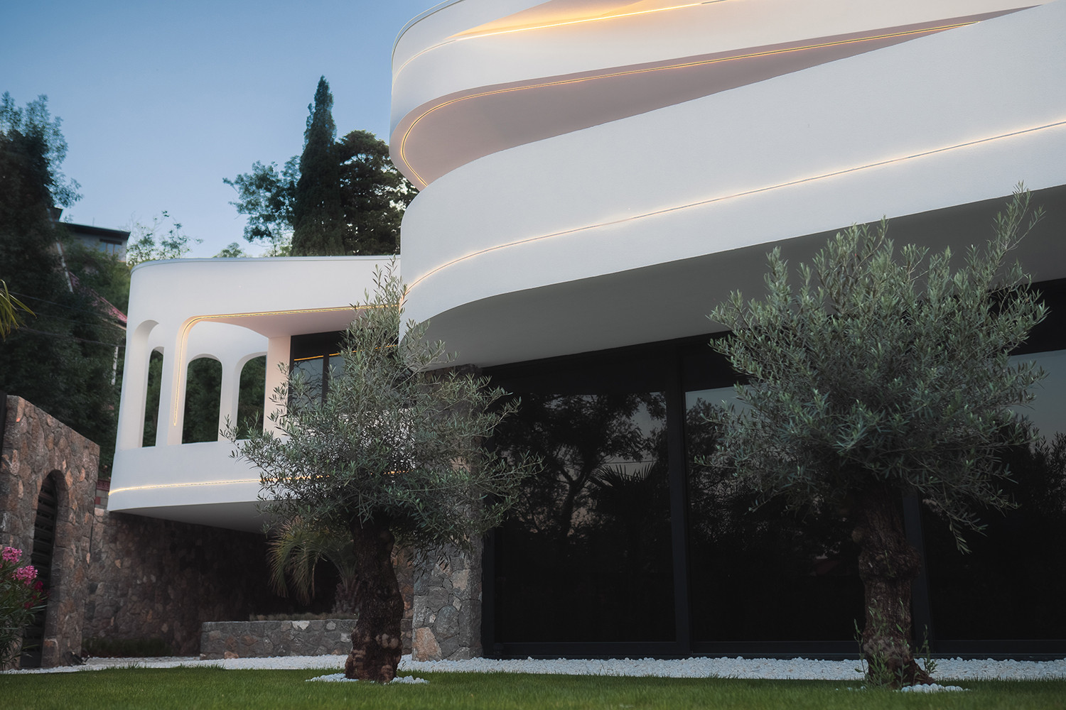 Фасад виллы утеплен, отделан натуральным камнем, в некоторых местах покрыт фасадной штукатуркой.