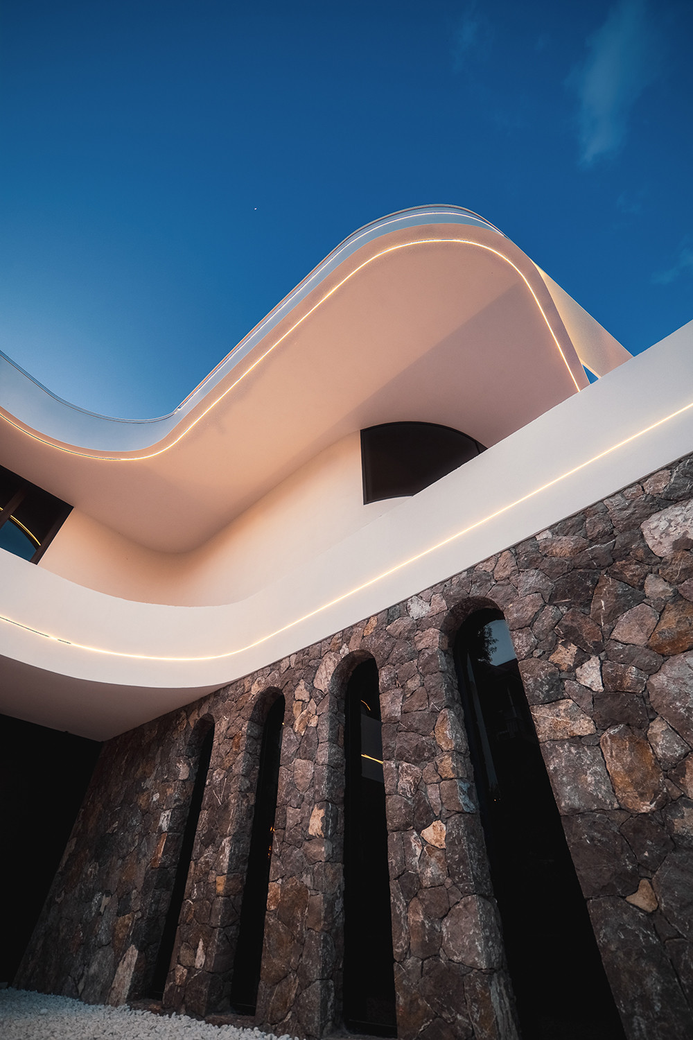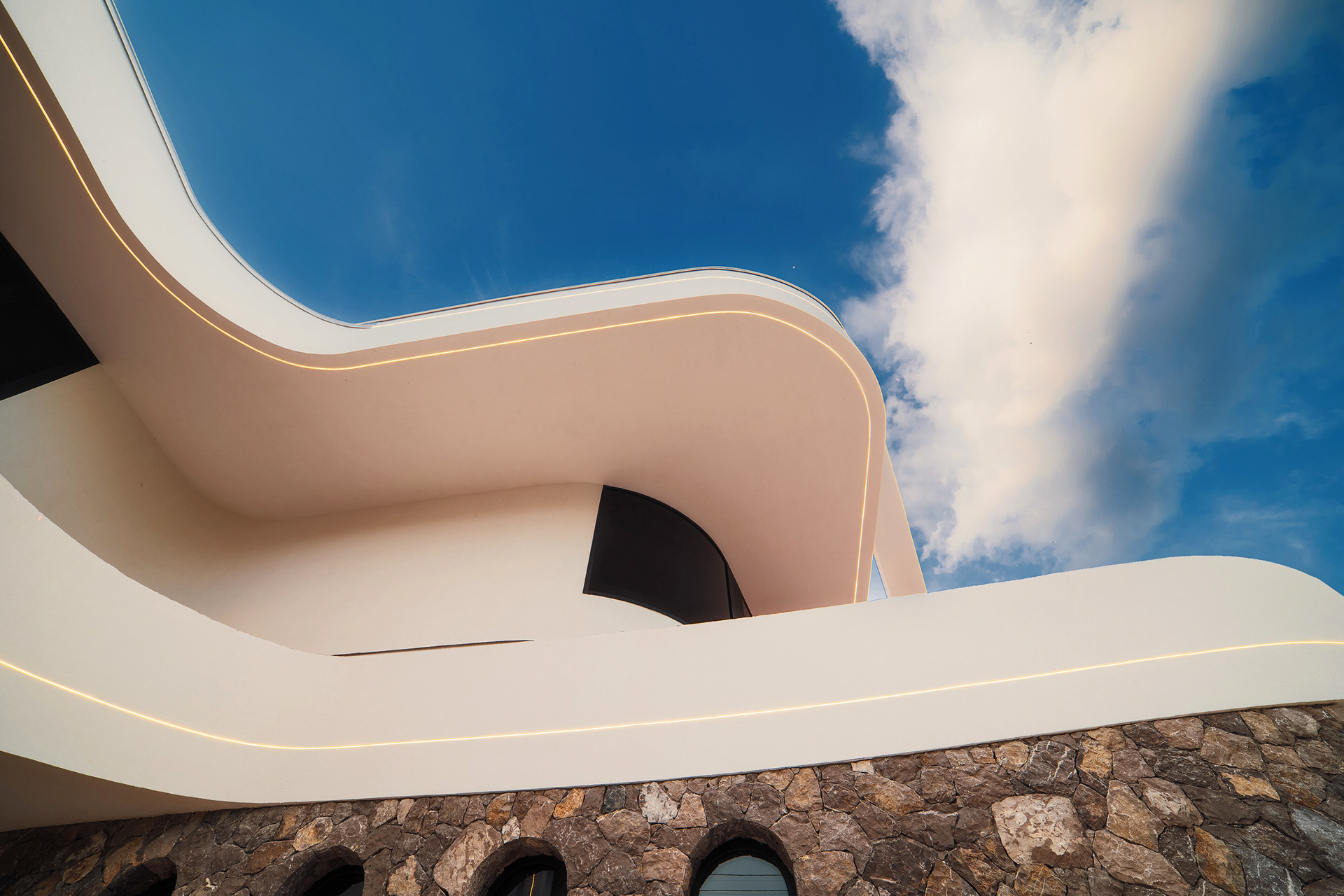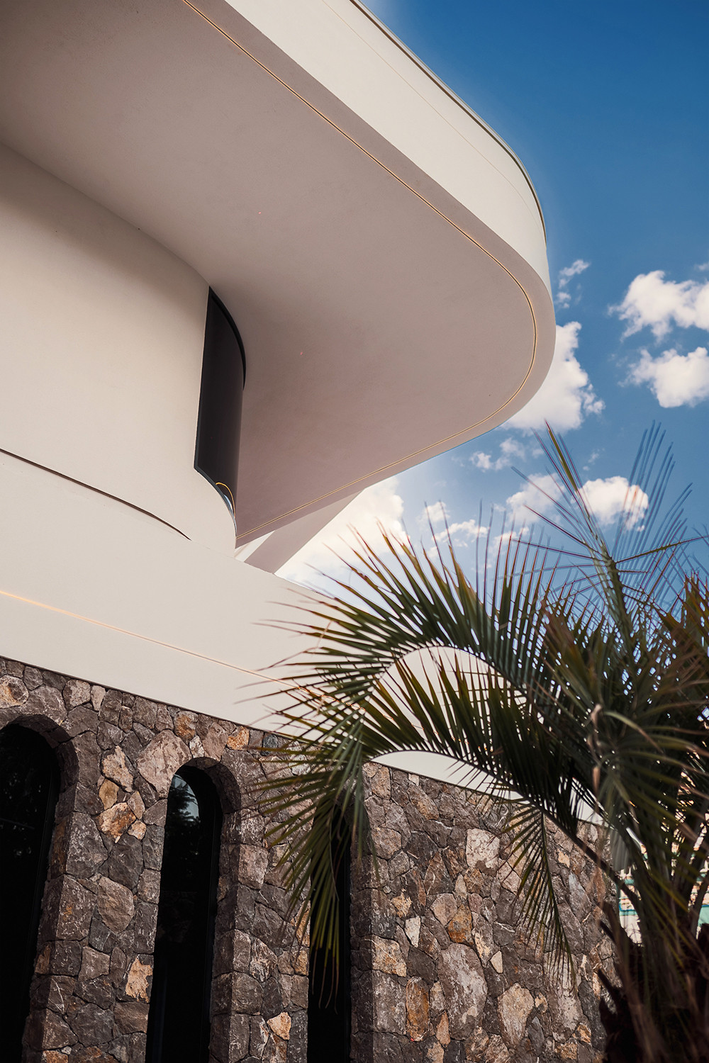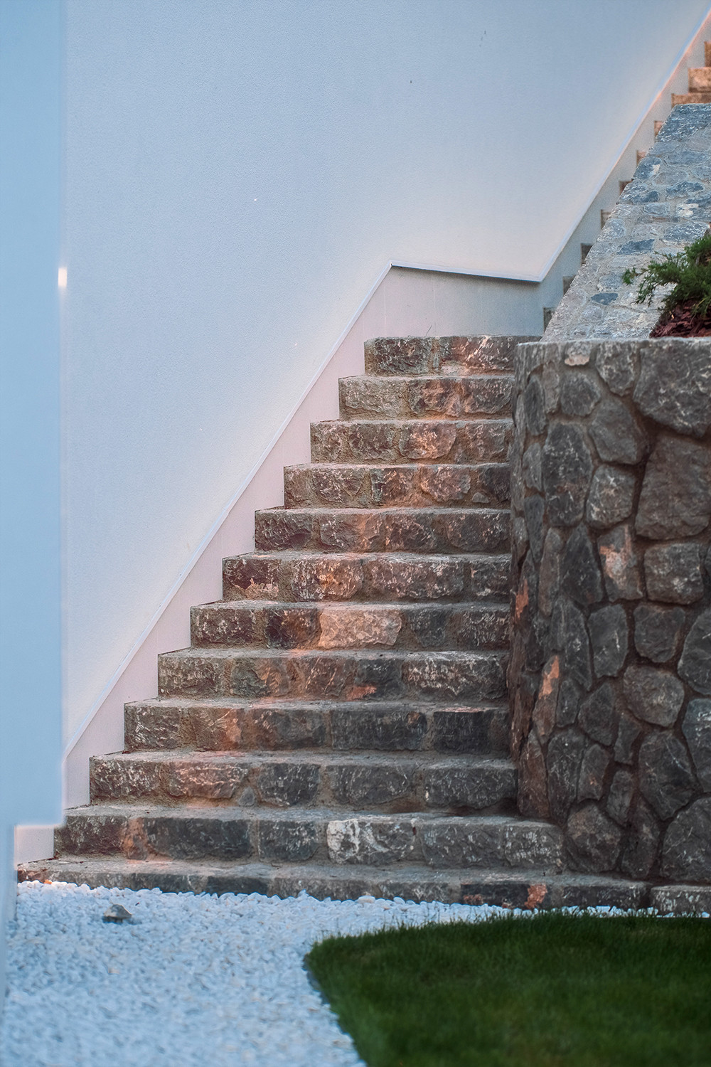 Фасад виллы утеплен, отделан натуральным камнем, в некоторых местах покрыт фасадной штукатуркой.