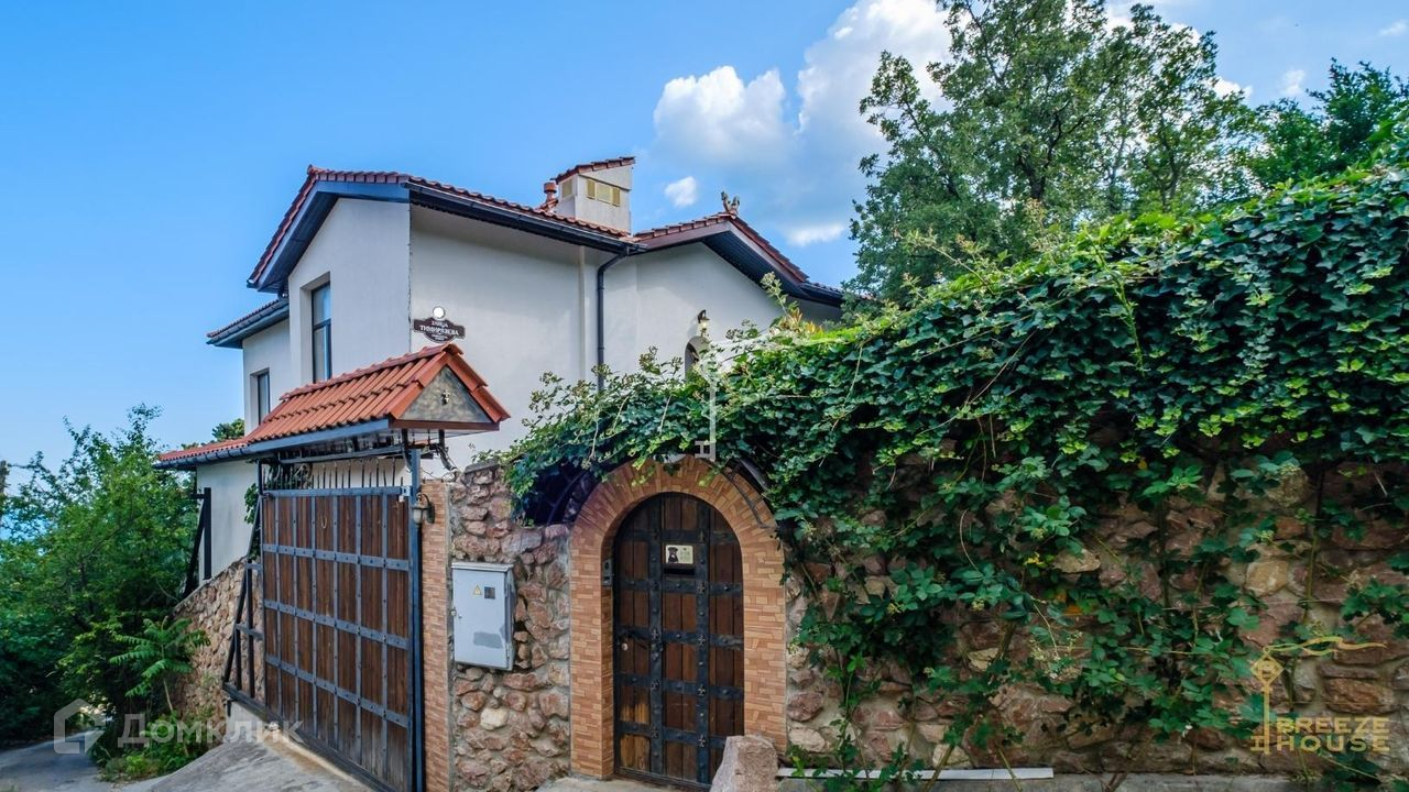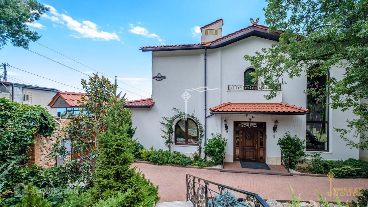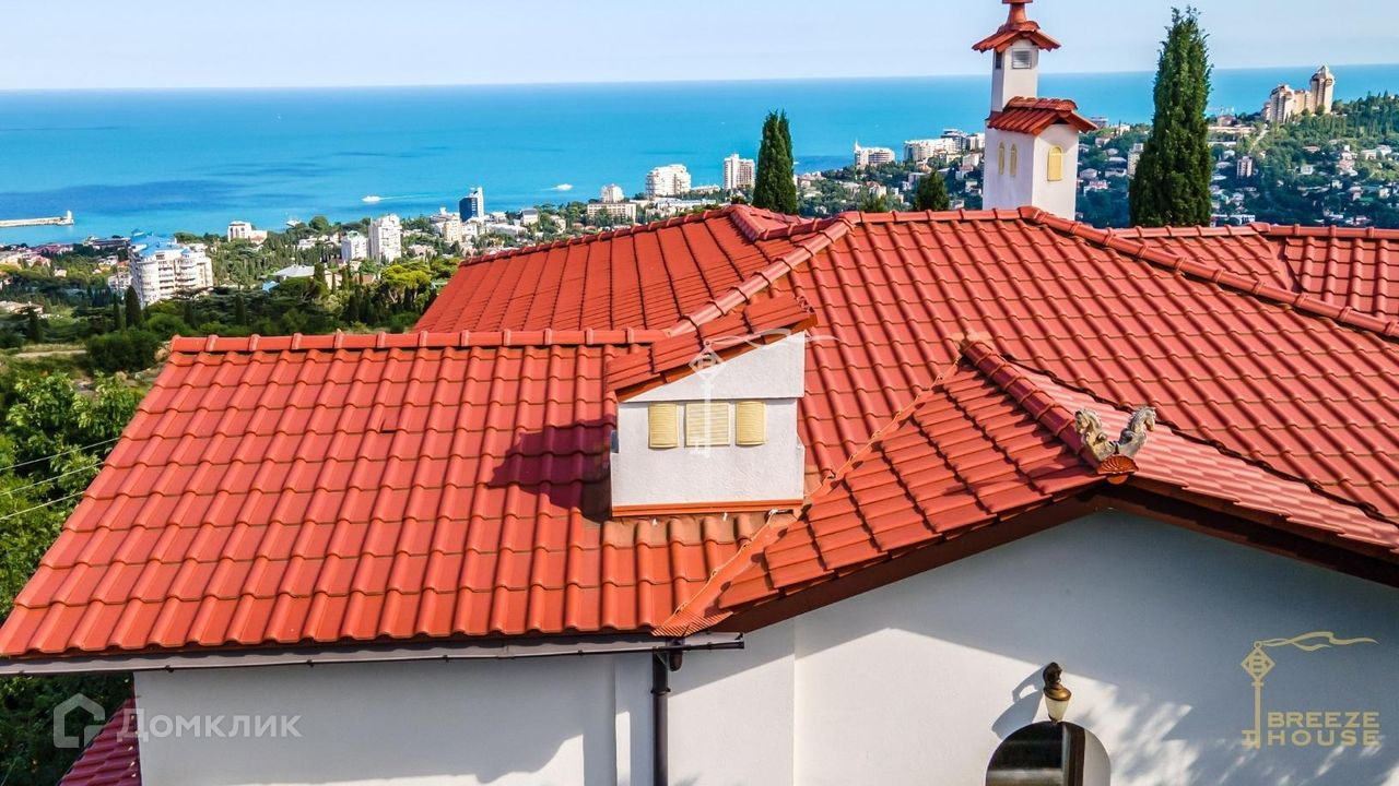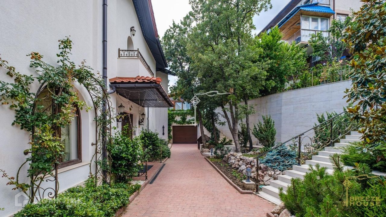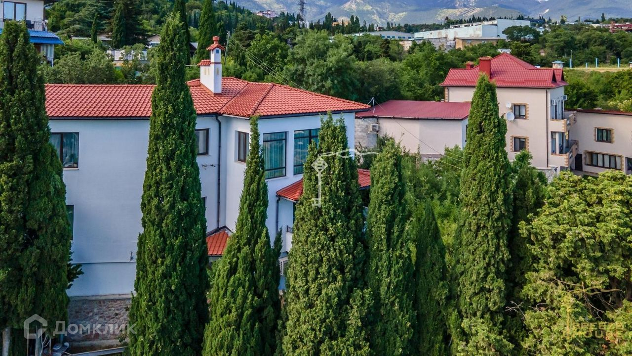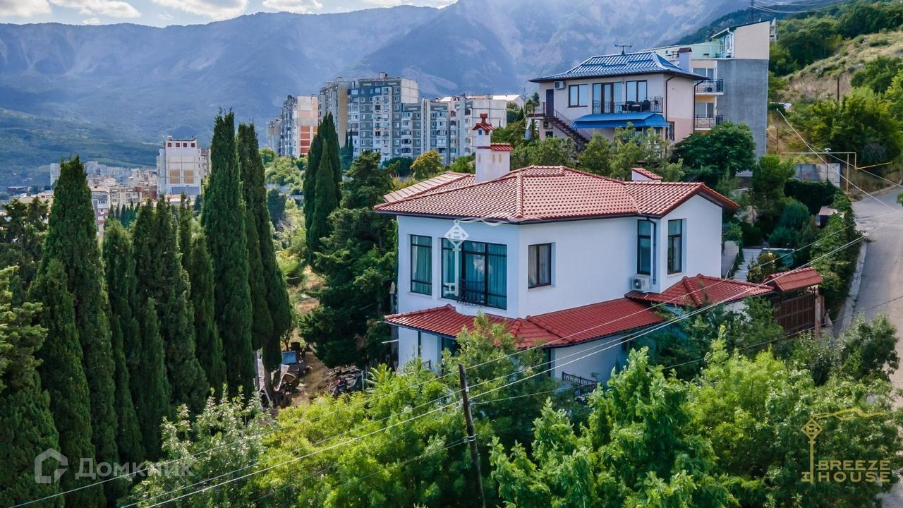 Продается утопающий в зелени белоснежный дом с натуральной красной черепицей в живописном тихом районе Ялты. Из окон и террас открываются потрясающие виды на море и горы.