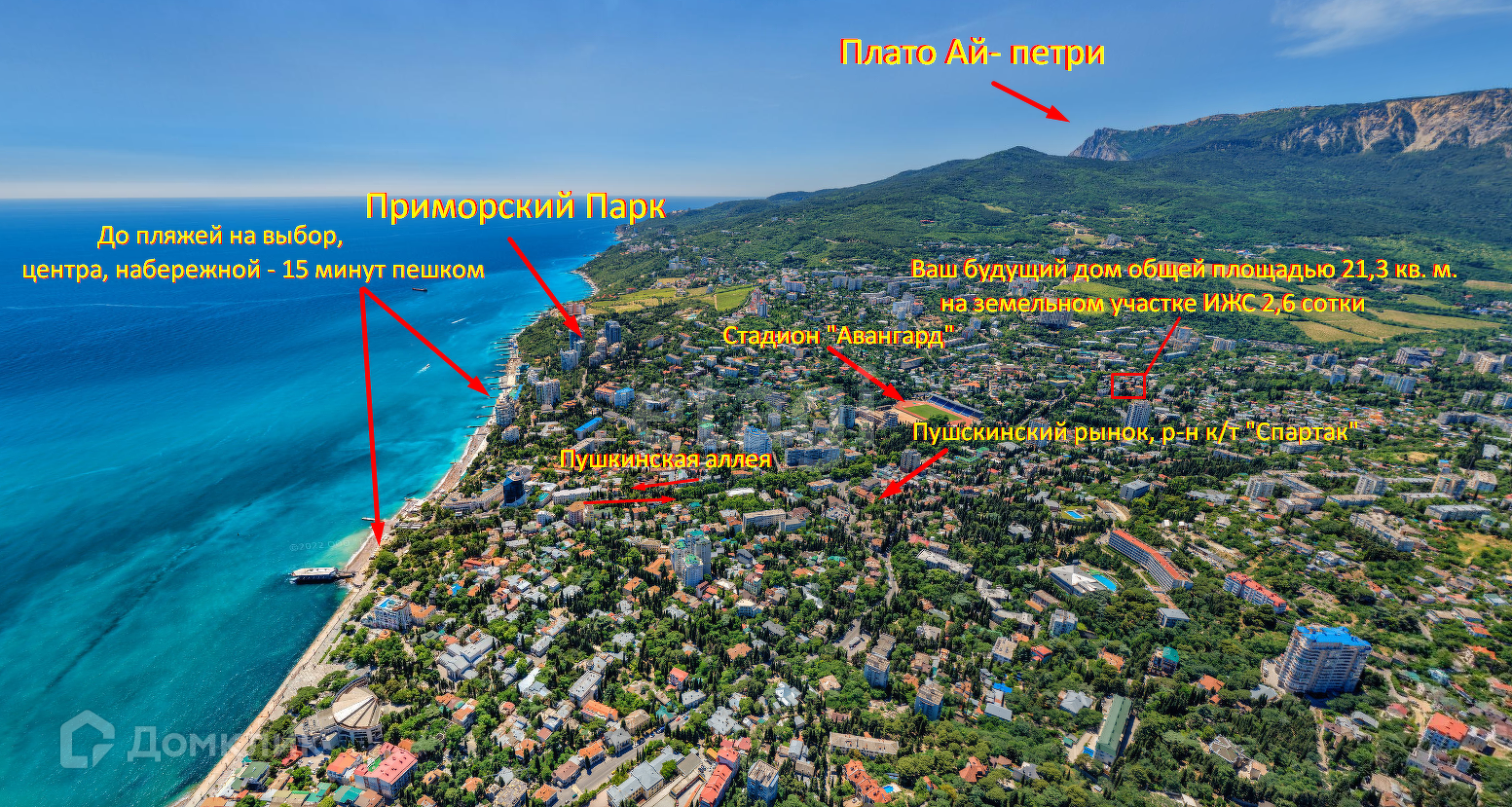 Продается участок 2.6 сотки с домом площадью 23 кв.м. Расположен в тихом районе Ялты. Дом под реконструкцию и расширенное строение. К участку есть два подъезда - сверху и снизу. Коммуникации: вода, канализация - подключены, газ - рядом с участком, по электричеству получены тех. условия на 15 кв.
