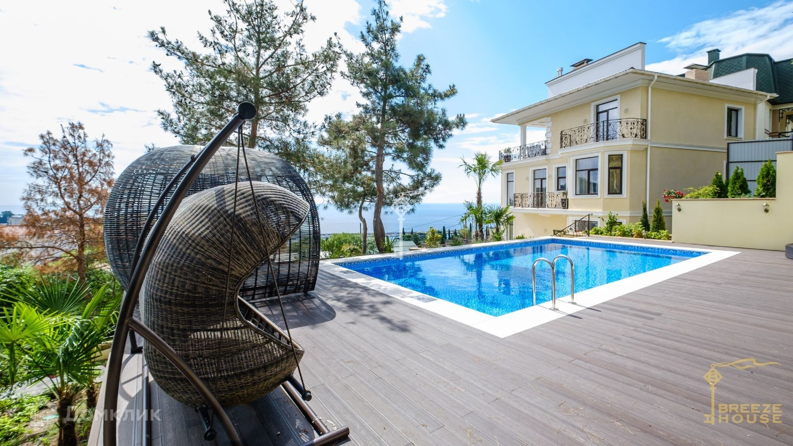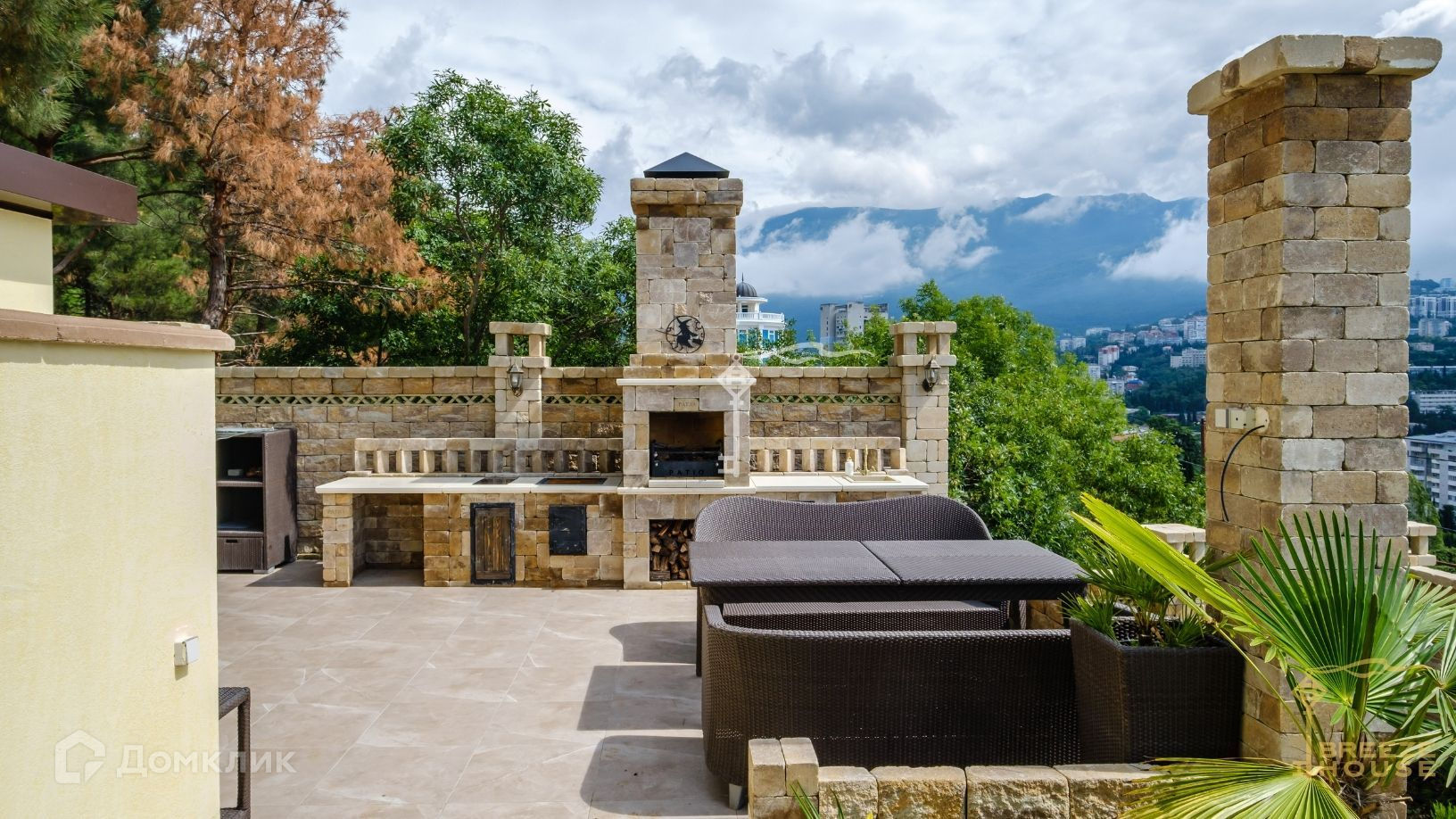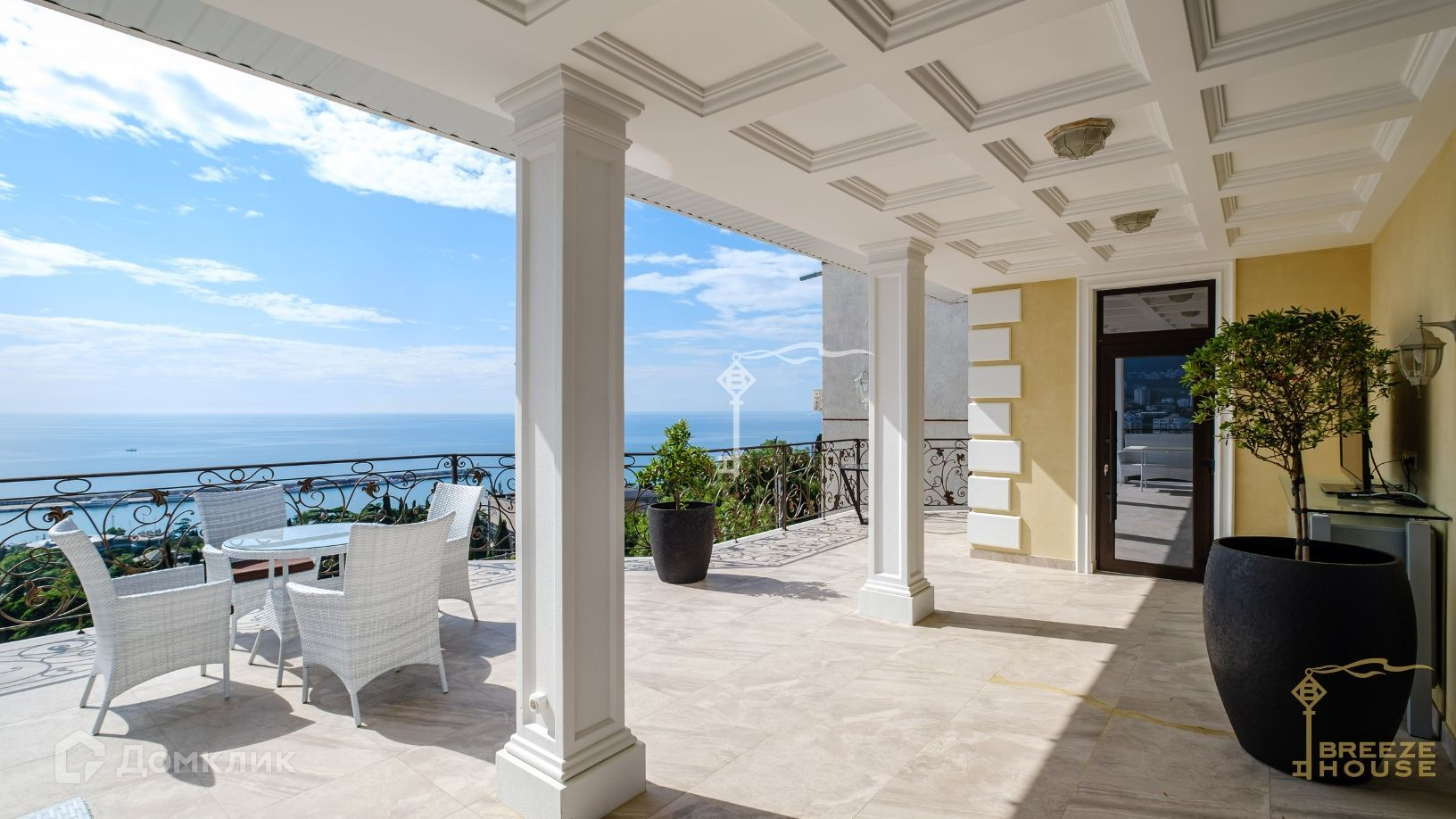 -большая терраса оборудованная ротанговой мебелью для отдыха большой компанией с панорамным видом на море.