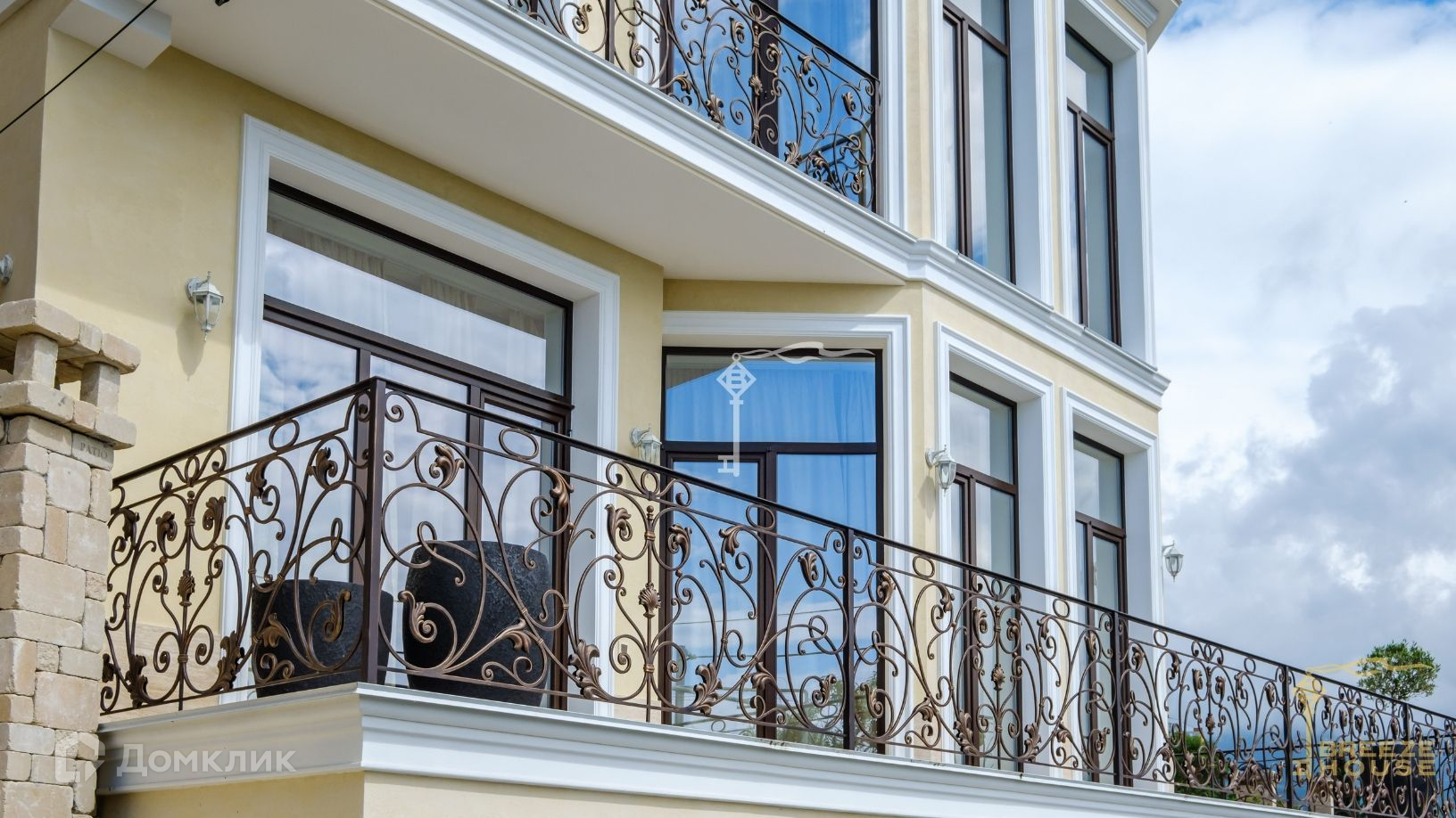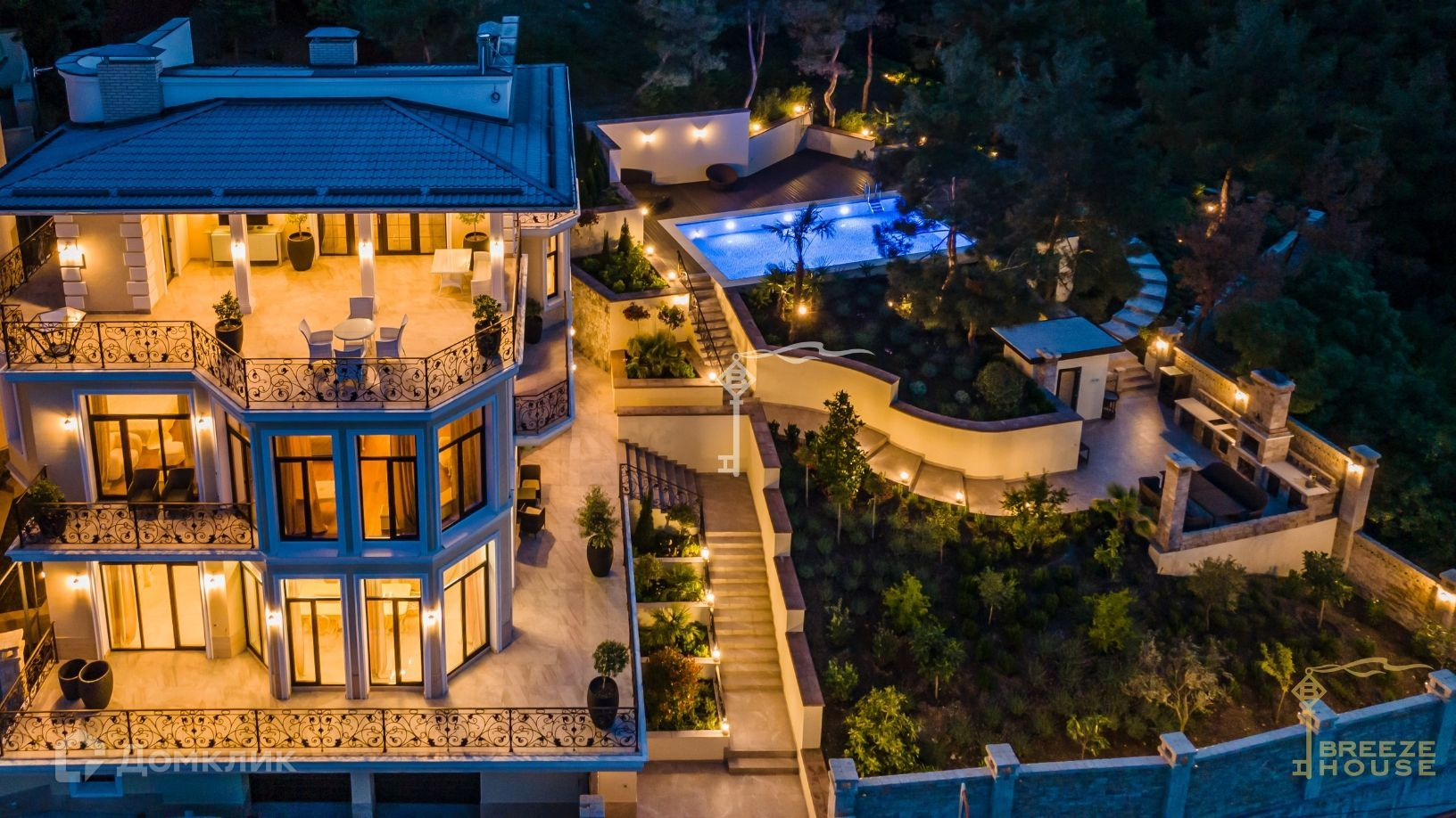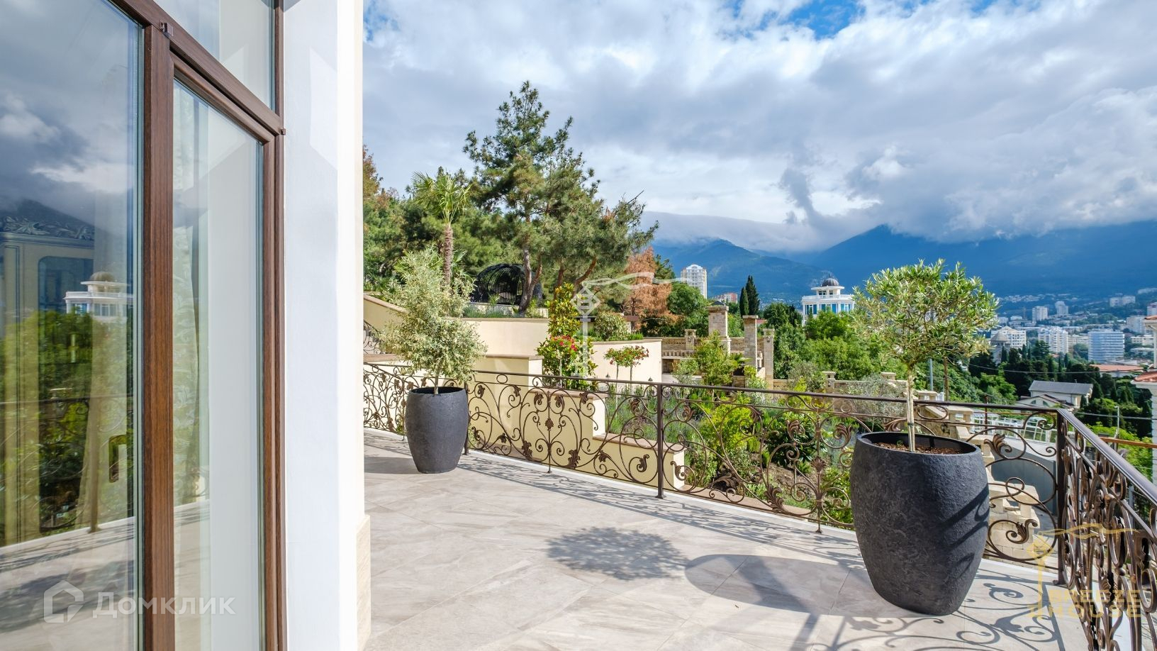 Просторная вилла 585 м² с панорамным остеклением и открытыми обширными террасами с кованными балюстрадами.